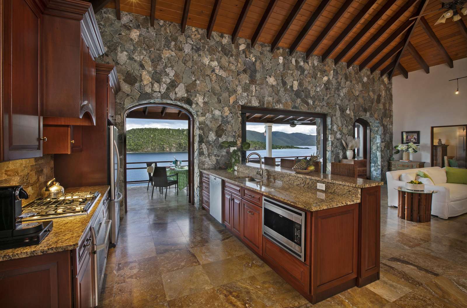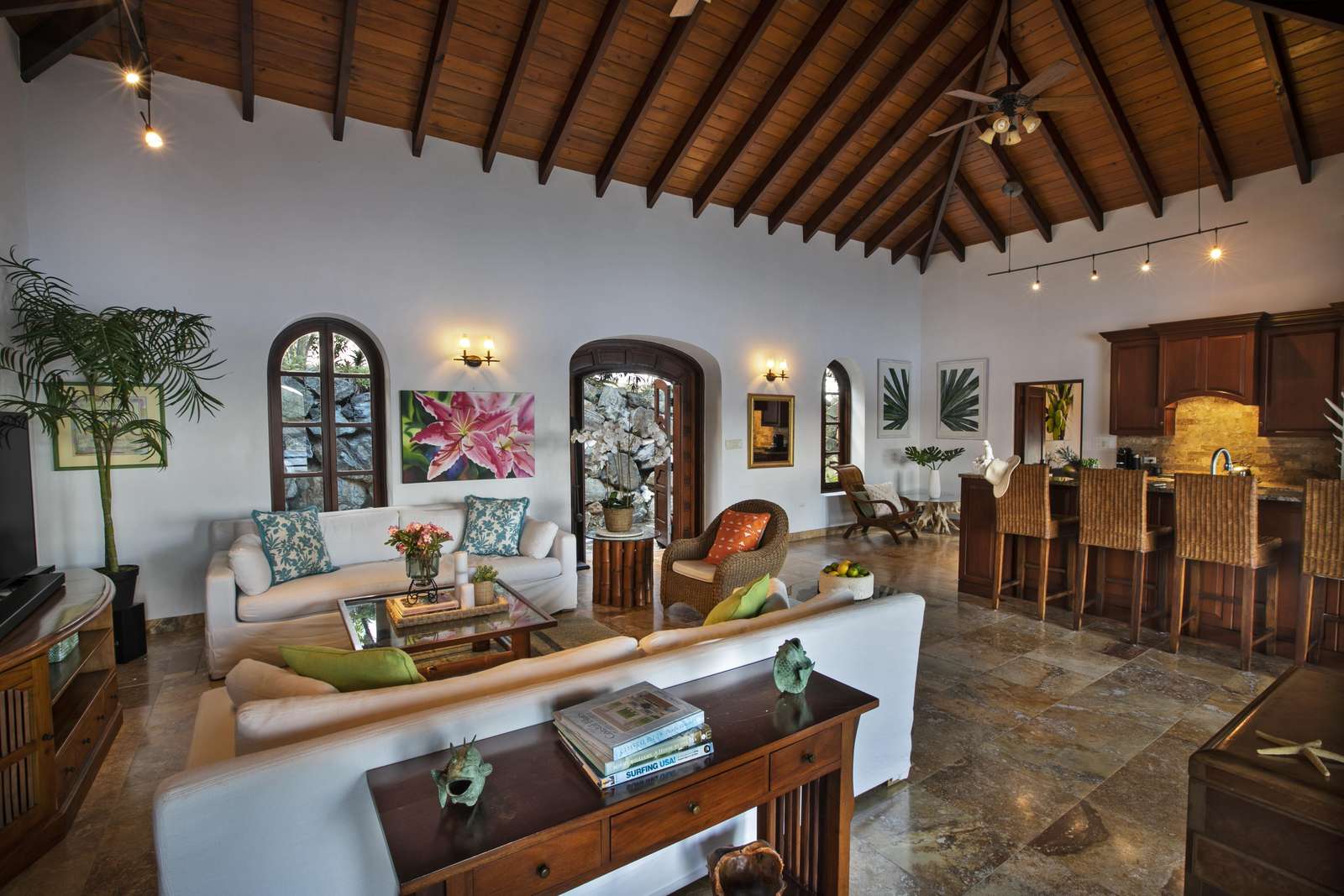 You’ll enter into The Great Room where you’ll find an open-plan kitchen and living room. It’s light and airy with high pitched ceilings and large glass doors and windows, letting in plenty of ocean breezes.