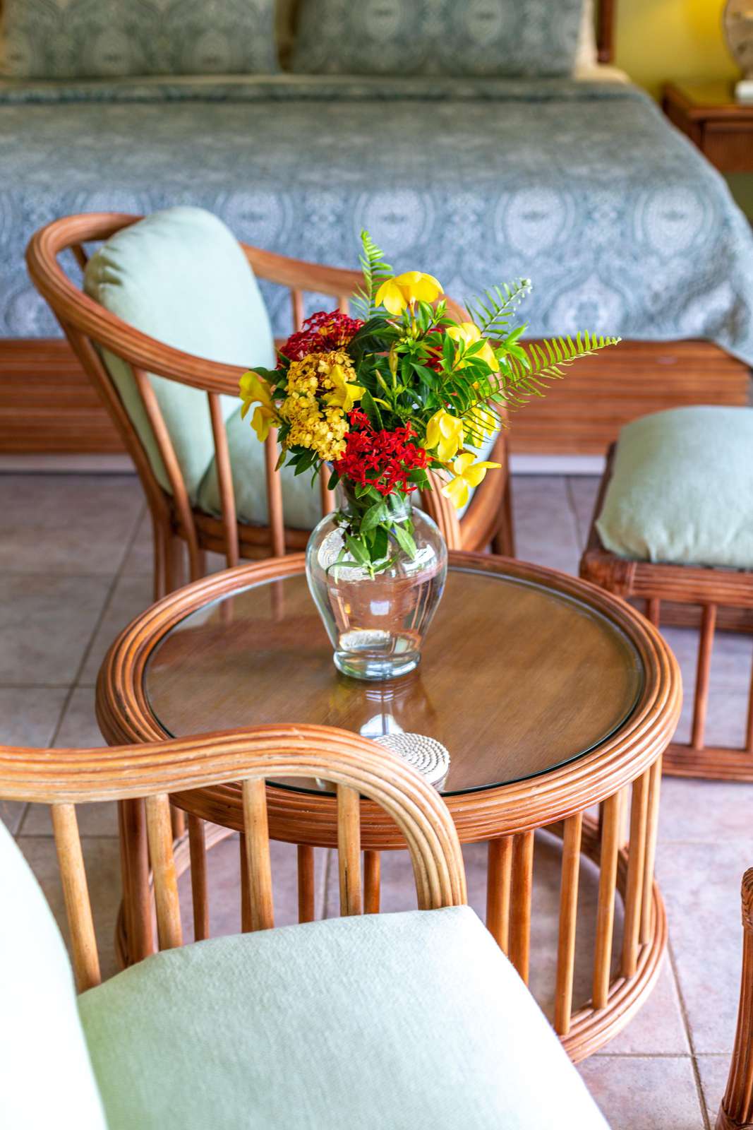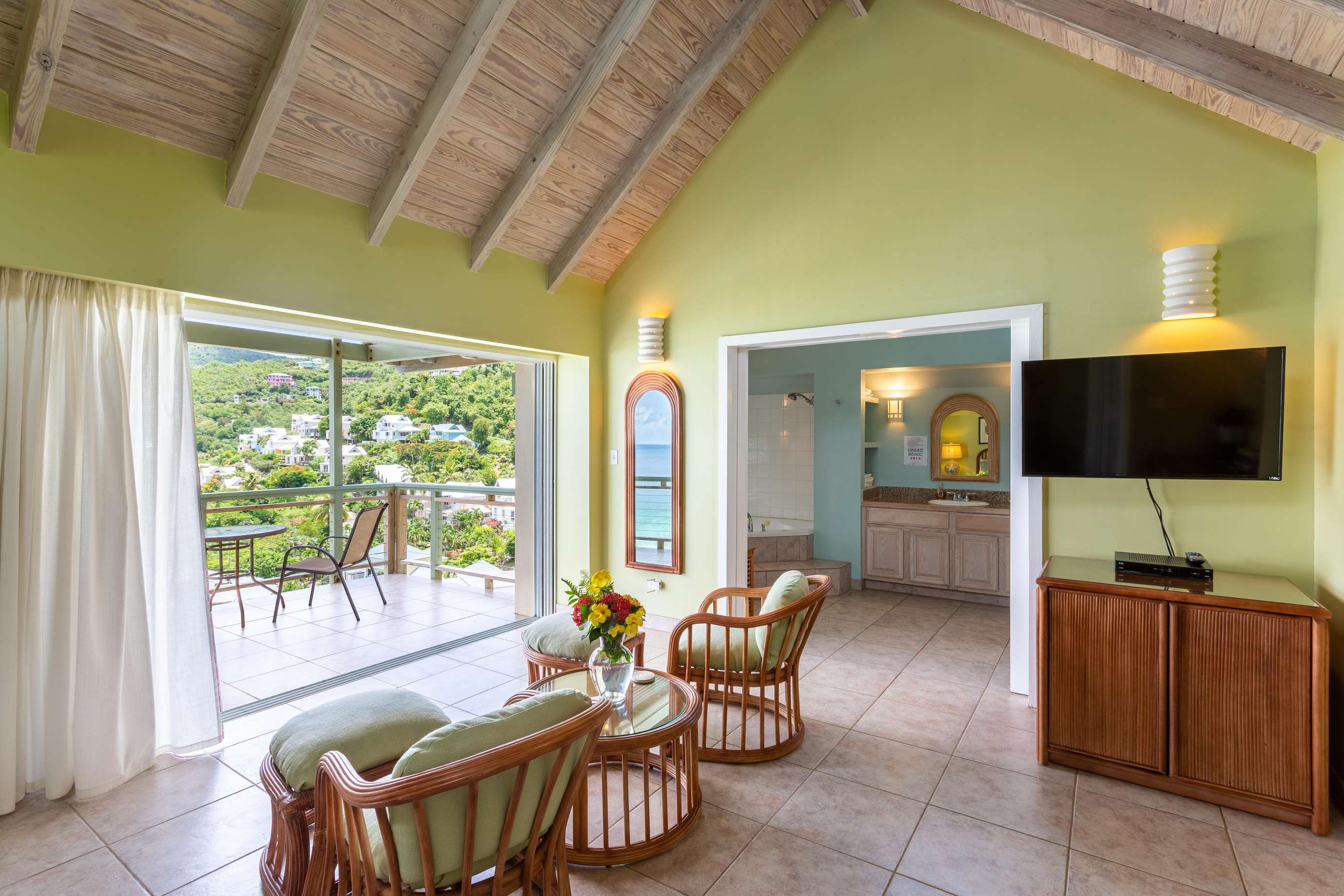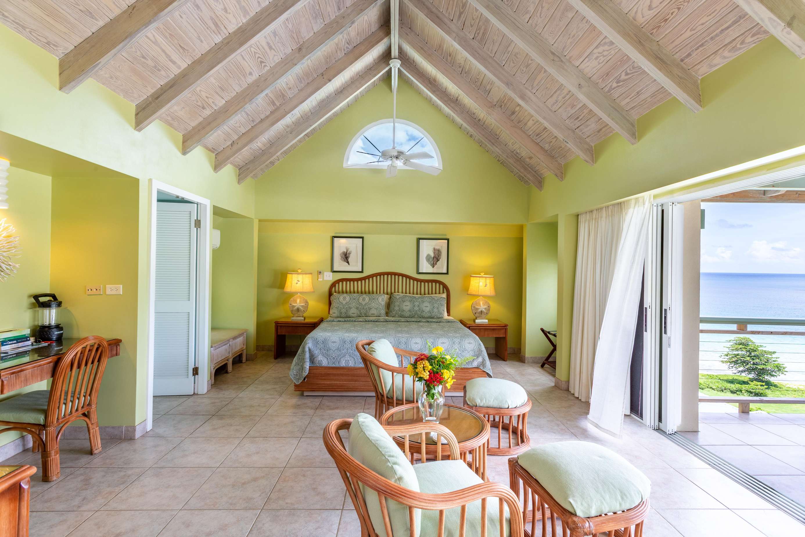 Restful yet refreshing, the décor is tasteful and elegant with beachy hues and complementary artwork. You’ll also find a stunning ocean view, comfortable Caribbean furnishings and the calming sounds of the waves below in this breezy suite. Airy and filled with sunlight, it has an open studio-style layout with a high vaulted ceiling. Equipped with a king-size bed, built in desk, AC, FLOW cable TV and hi-speed WIFI, you’ll have all your home comforts but with a much better view!