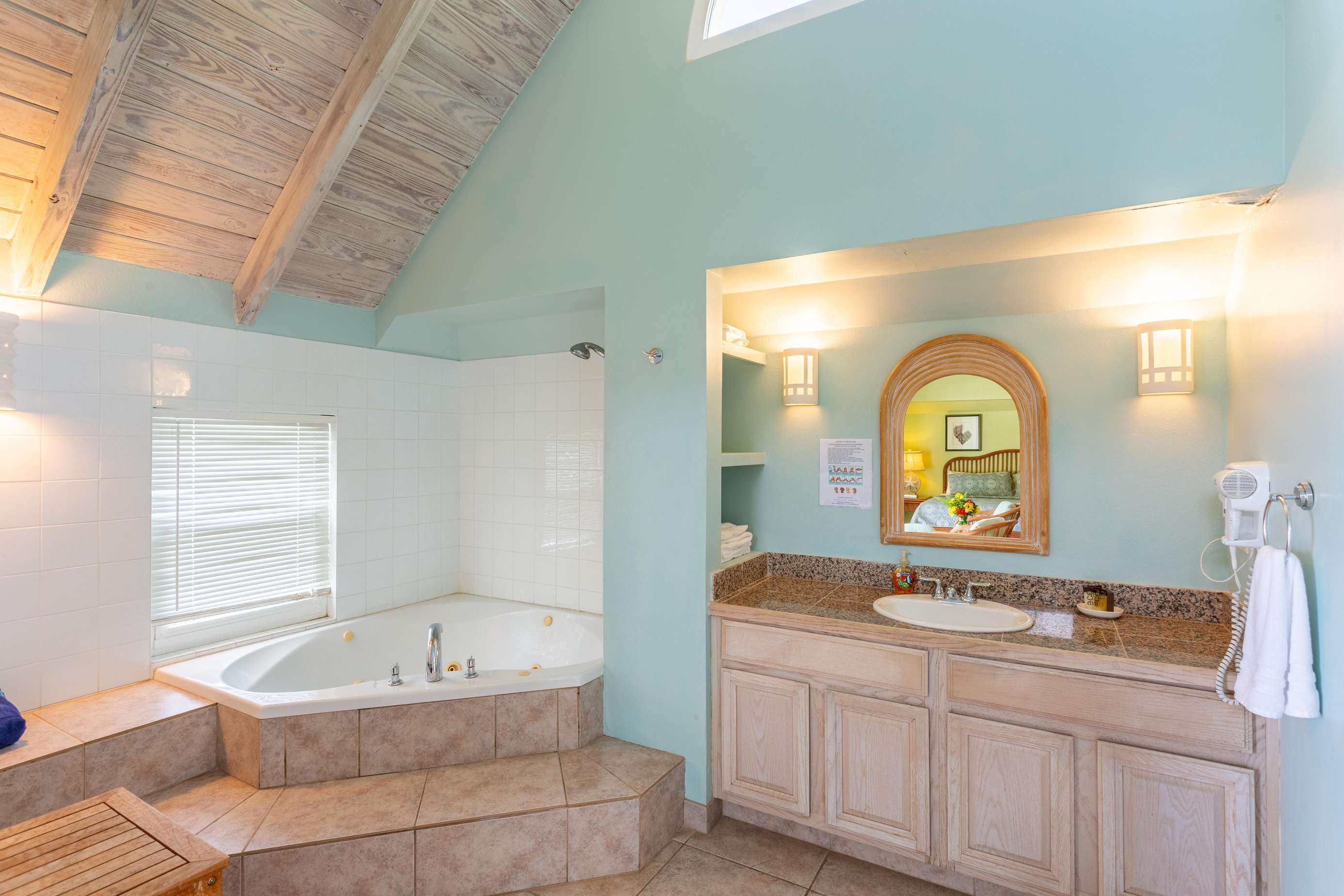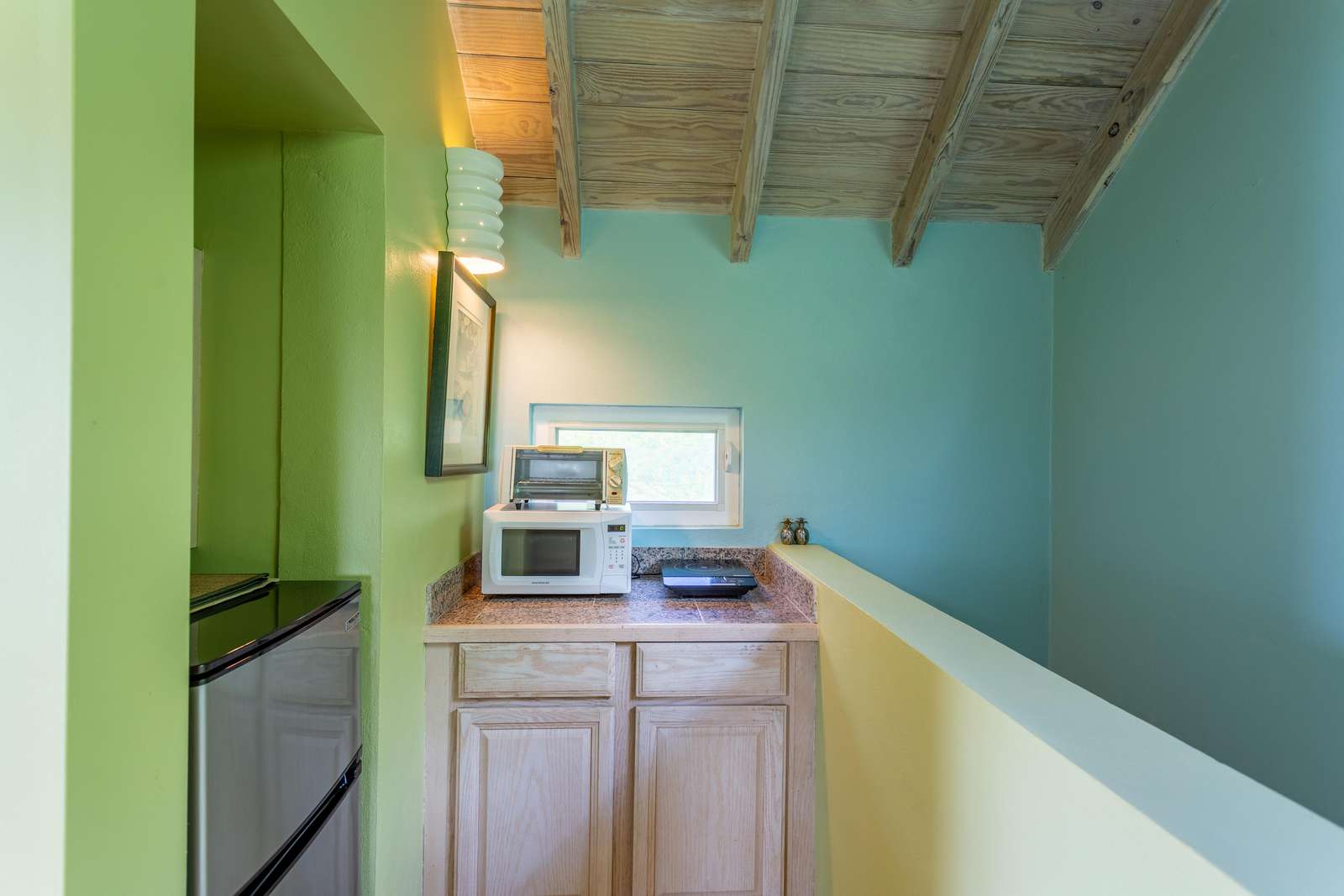 The kitchenette is perfectly equipped for preparing simple meals with microwave, coffee-maker, toaster oven, blender, fridge and single electric cooktop. The bathroom is spacious and offers a tub with a shower head to soak in after a long day at the beach.