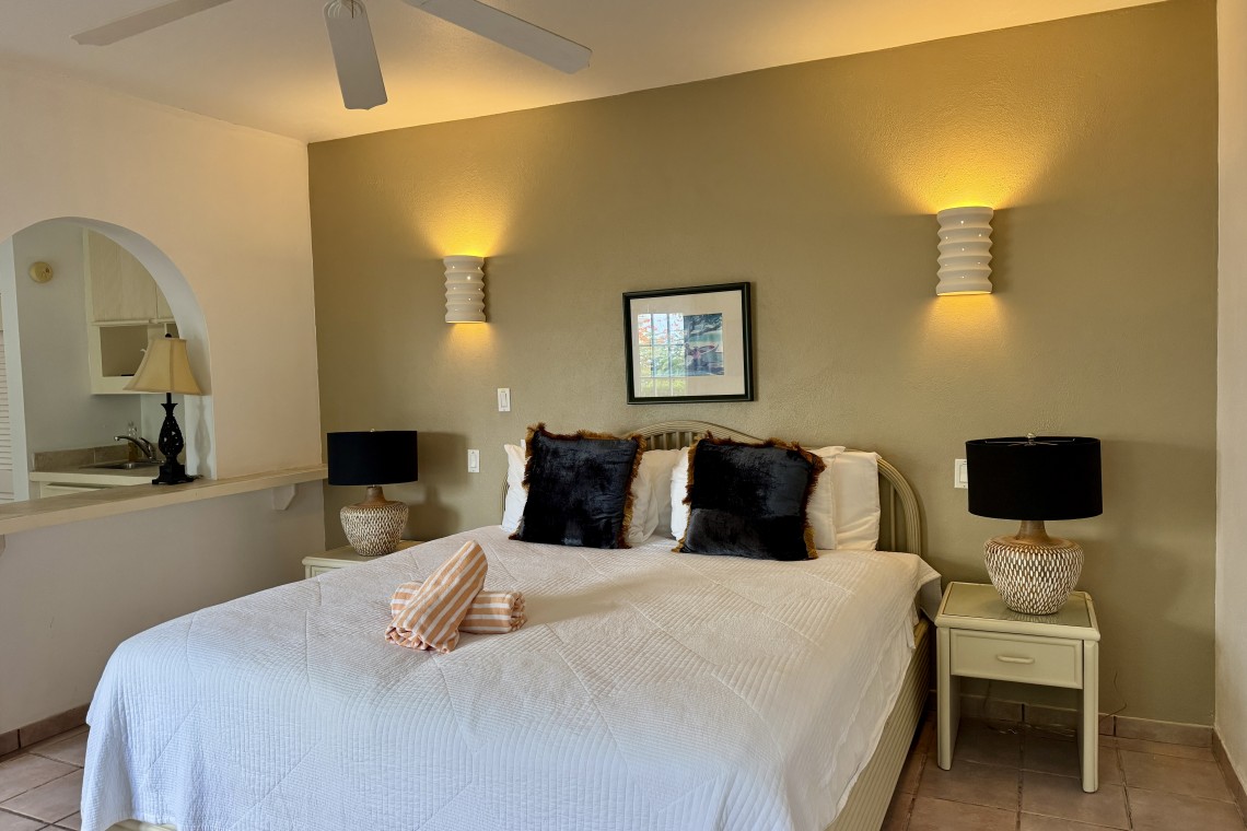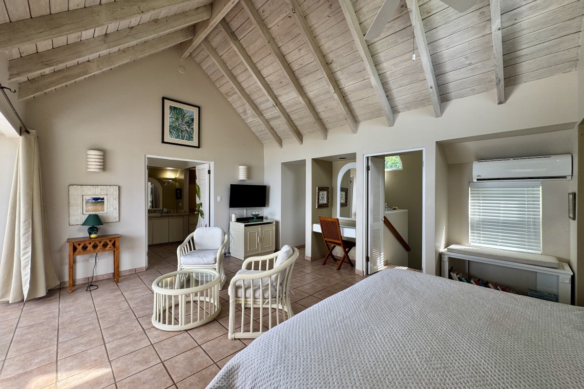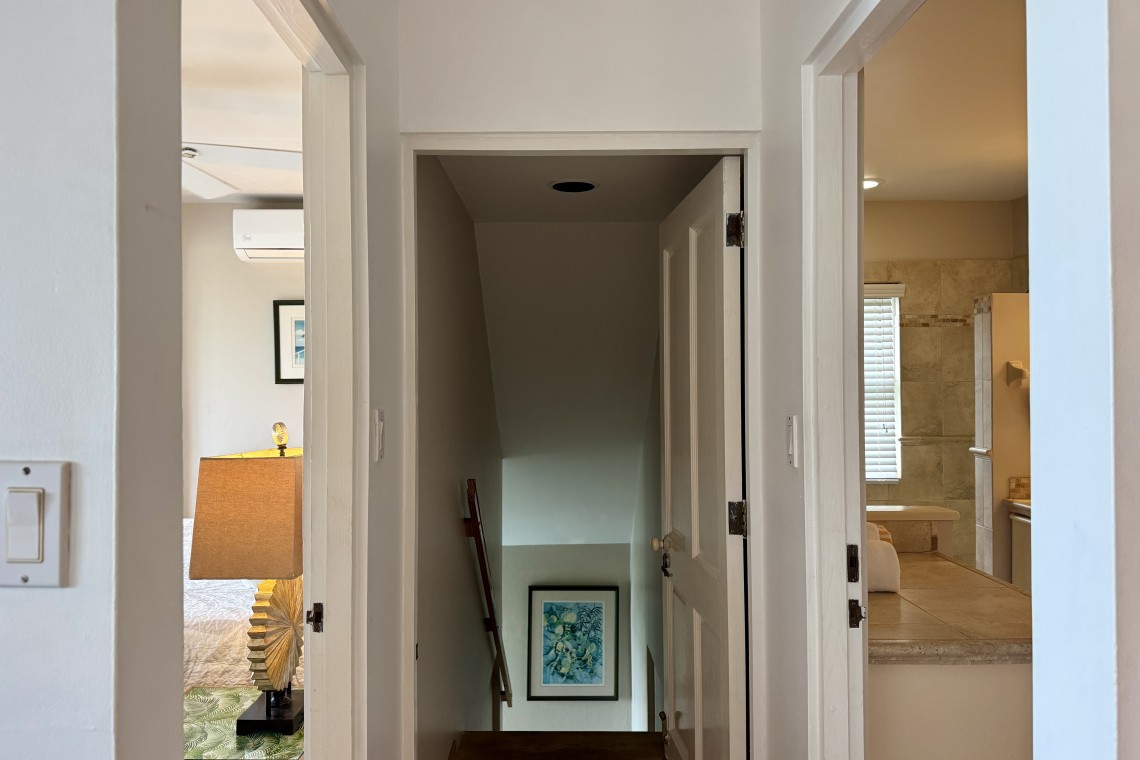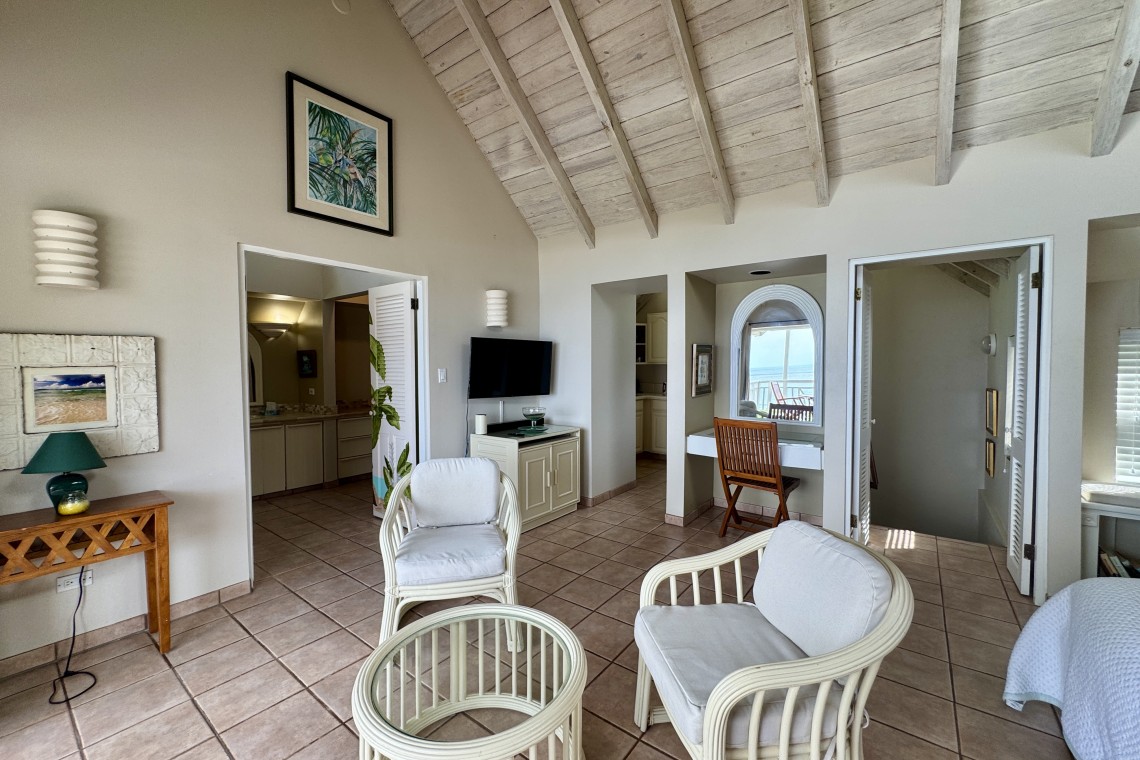 3) Upstairs you’ll find the Penthouse suite with its stunning ocean view, comfortable Caribbean furnishings and the calming sounds of the waves below. Airy and filled with sunlight, it has an open studio-style layout with a high vaulted ceiling. Equipped with a king-size bed, built in desk, AC, smartTV and hi-speed WIFI, you’ll have all your home comforts but with a much better view! The kitchenette is perfectly equipped for preparing simple meals with microwave, coffee-maker, toaster oven, blender, fridge and single electric cooktop. The bathroom is spacious with a shower and walk-in closet