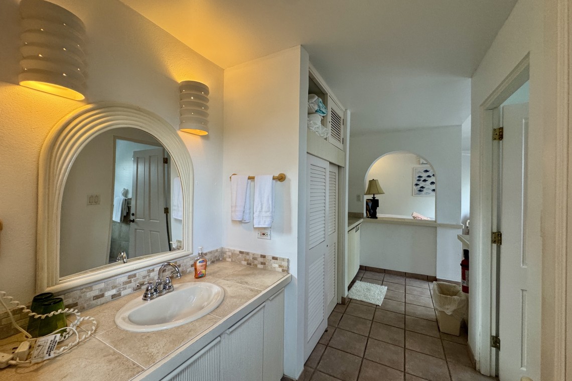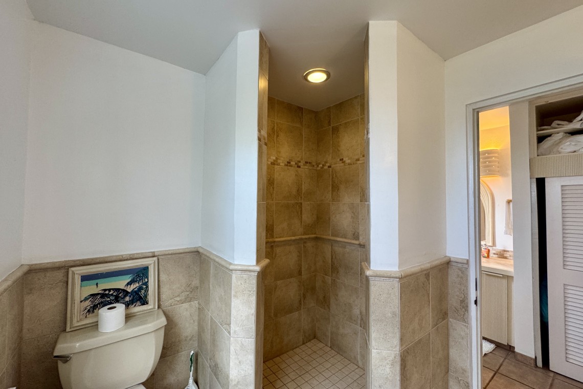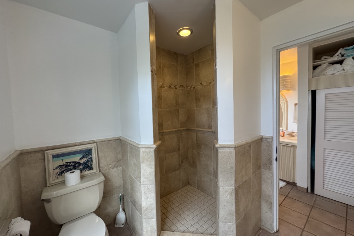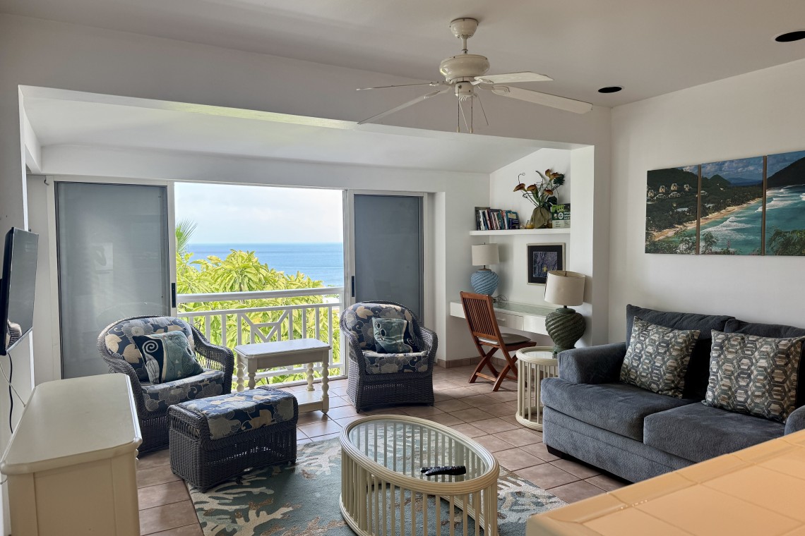 3) Upstairs you’ll find the Penthouse suite with its stunning ocean view, comfortable Caribbean furnishings and the calming sounds of the waves below. Airy and filled with sunlight, it has an open studio-style layout with a high vaulted ceiling. Equipped with a king-size bed, built in desk, AC, smartTV and hi-speed WIFI, you’ll have all your home comforts but with a much better view! The kitchenette is perfectly equipped for preparing simple meals with microwave, coffee-maker, toaster oven, blender, fridge and single electric cooktop. The bathroom is spacious with a shower and walk-in closet
