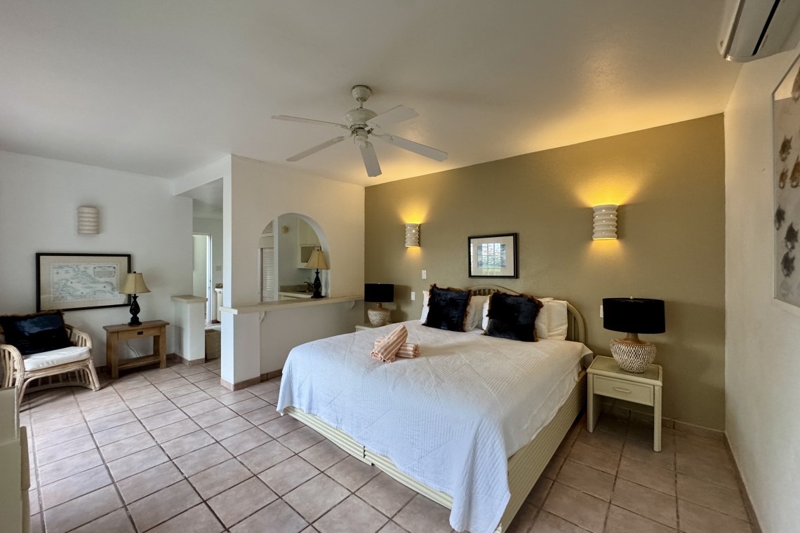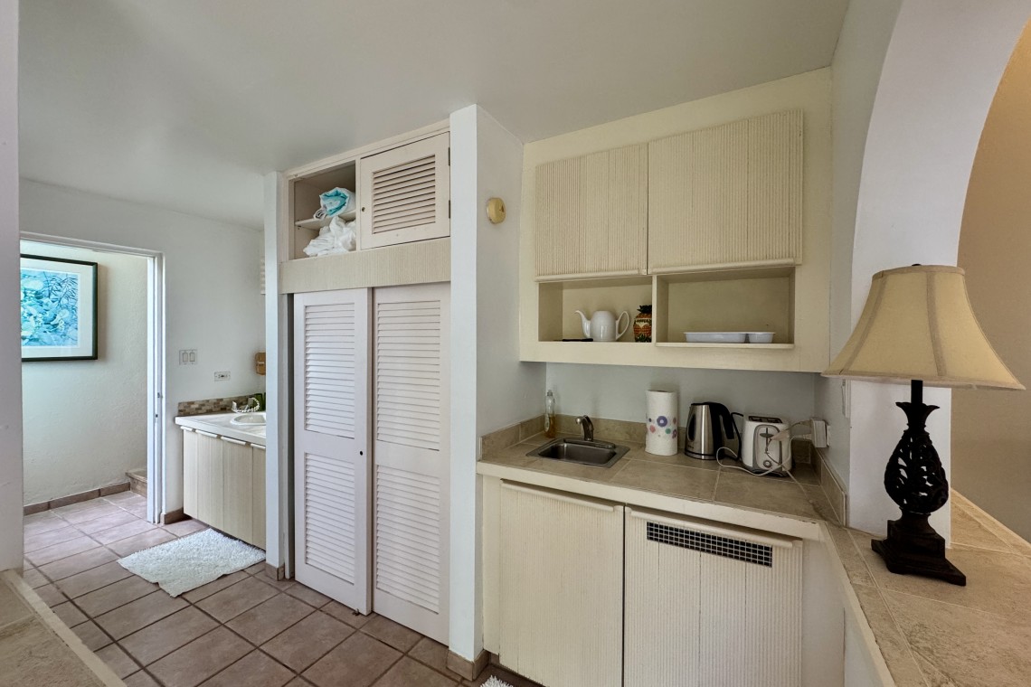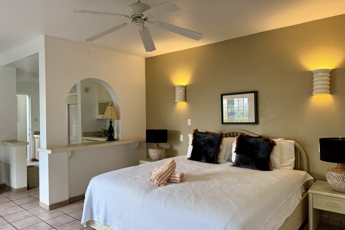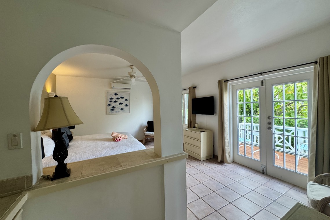 As you enter the property, you’ll pass the studio on the ground floor and climb a flight of stairs up to the middle floor (garden suite) where you’ll be met by an airy open-plan kitchen and living room filled with sunlight and comfortable Caribbean furnishings, only separated by a sociable breakfast bar and island. The kitchen area has all the essentials for self-catering (please note there is no oven but electric cooktop and toaster oven). The living room offers comfortable seating for those moments of downtime and, if you can bear to tear your eyes away from the glistening ocean view, Smart TV and hi-speed WIFI.
