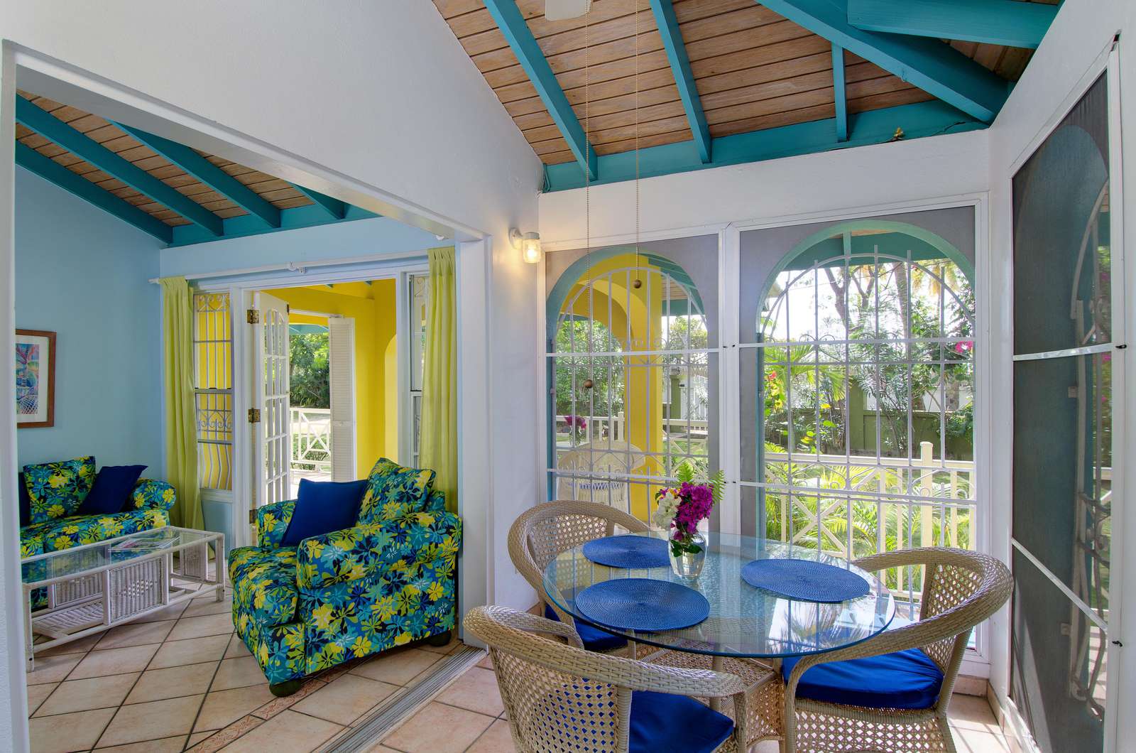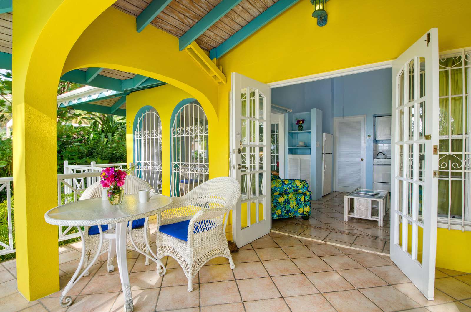 These identical Caribbean-style cottages are four semi-detached units split across two single storey buildings. As you enter your cosy new home-from-home, you’ll be greeted by a sociable kitchen and living area. The sunny yellow walls complement the granite countertop and breakfast bar and if you can resist the restaurants on your doorstep, you’ll find everything you need for self-catering. and the cottage is air-conditioned throughout.