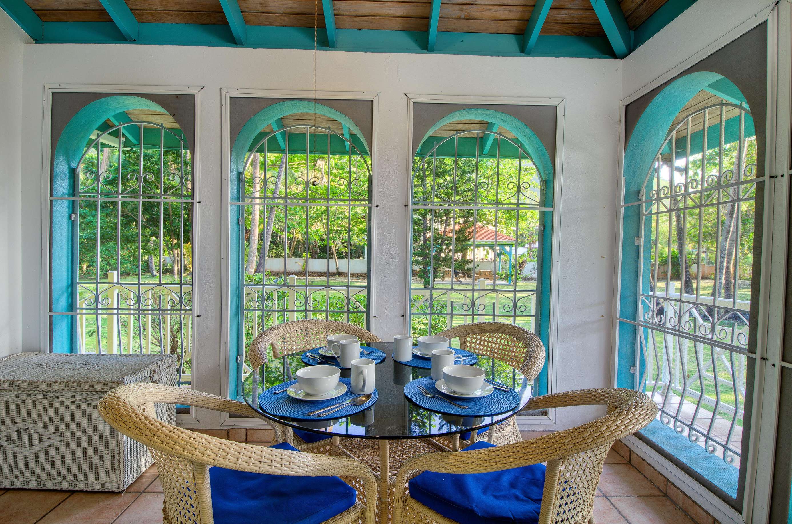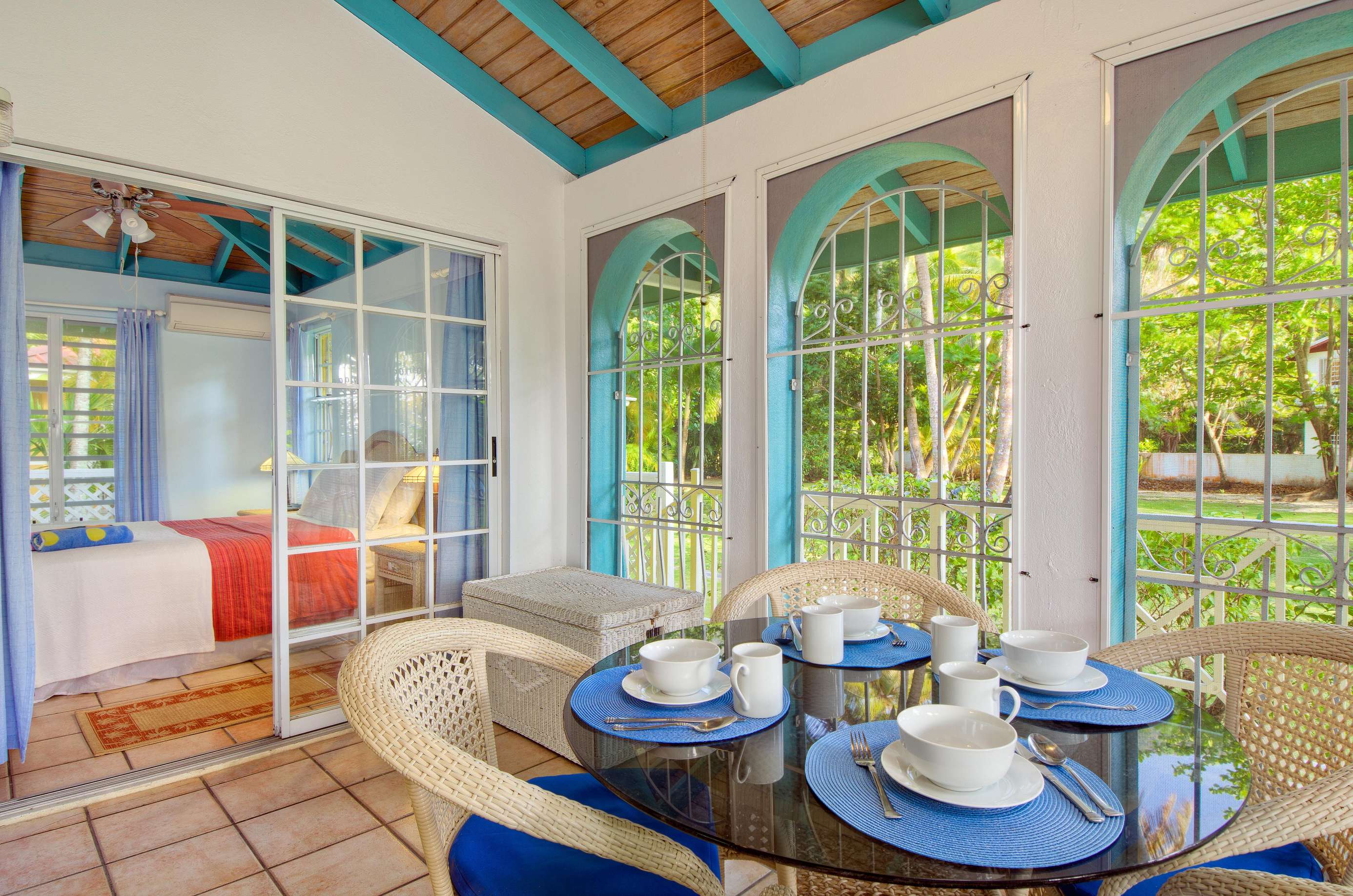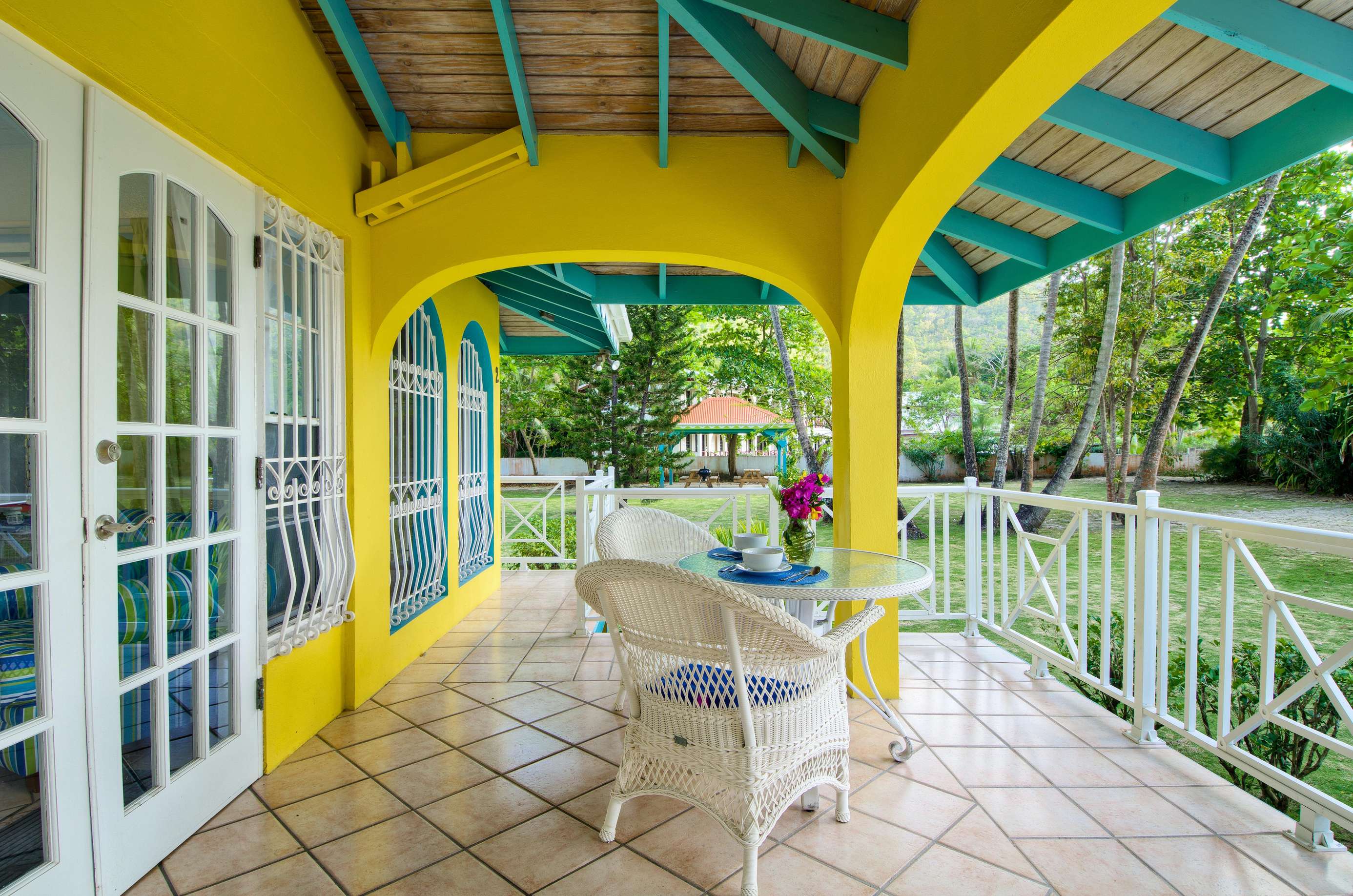 Set in a tropical, grassy walled garden, your personal porch is the perfect spot to enjoy a bite to eat or read a good book. You’ll be surrounded by kalabash, banana, coconut and almond trees, flowering hibiscus bushes and blooming bougainvillea – a blissful backdrop for lazing in a hammock or BBQing up a feast in the communal gazebo. Whilst there might not be beach views, this luscious garden area really whisks you away into a tropical paradise.