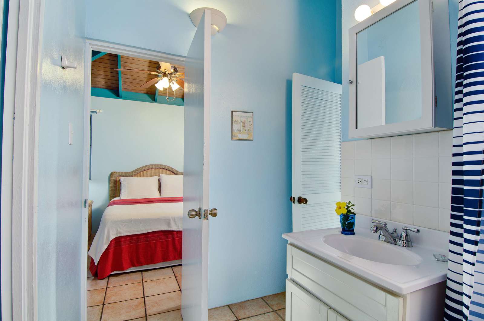 1)You’ll feel right at home in the comfy ensuite bedroom with queen size bed, closet with safe, dresser, SmartTV, and beachy décor. The bathroom has a single vanity and spacious shower, perfect for cooling down after a day at the beach.