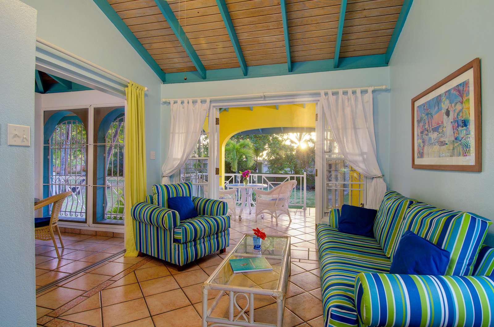 These identical Caribbean-style cottages are four semi-detached units split across two single storey buildings. As you enter your cosy new home-from-home, you’ll be greeted by a sociable kitchen and living area. The sunny yellow walls complement the granite countertop and breakfast bar and if you can resist the restaurants on your doorstep, you’ll find everything you need for self-catering. and the cottage is air-conditioned throughout.