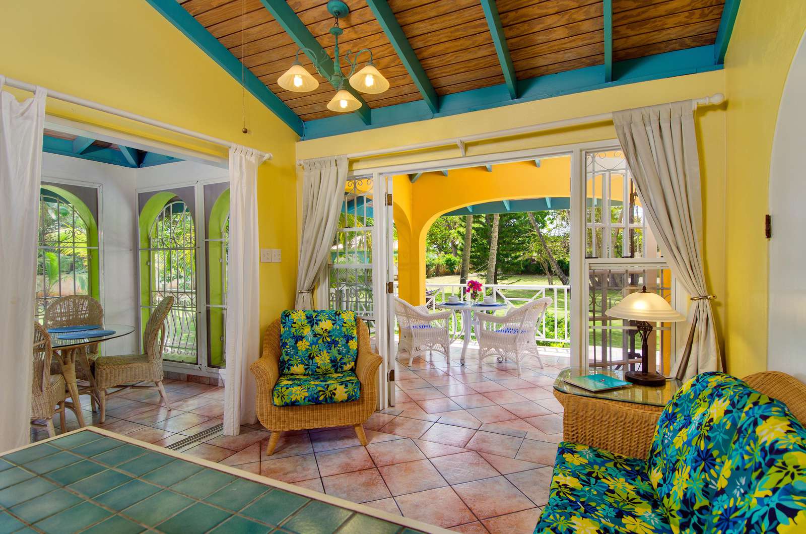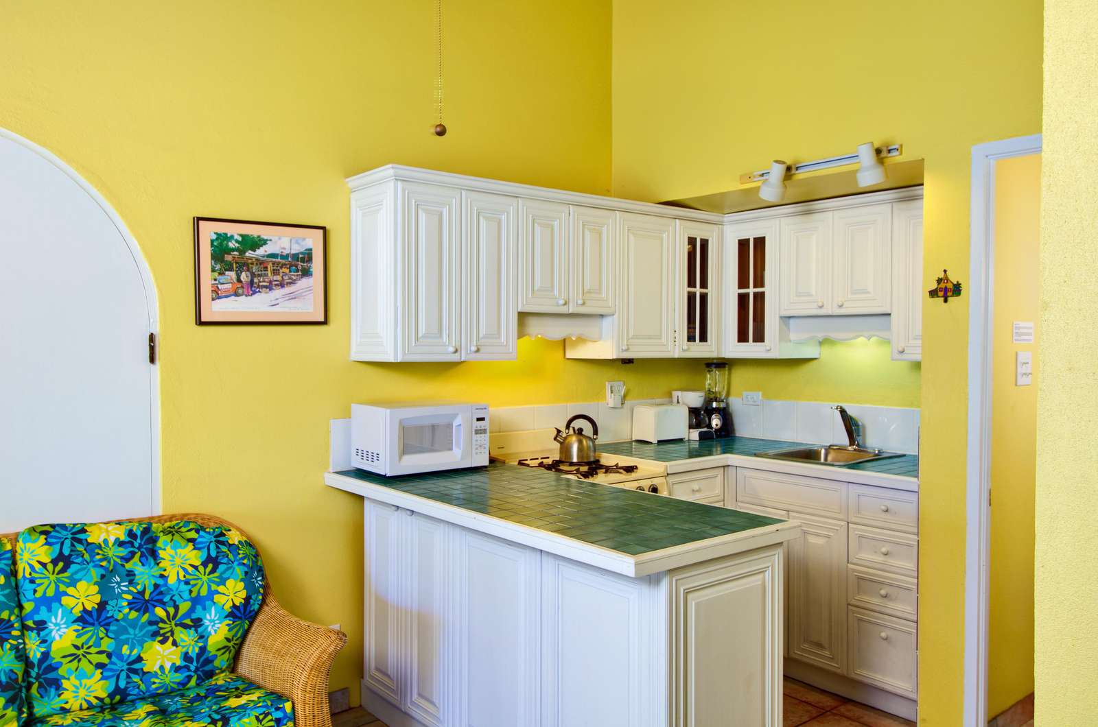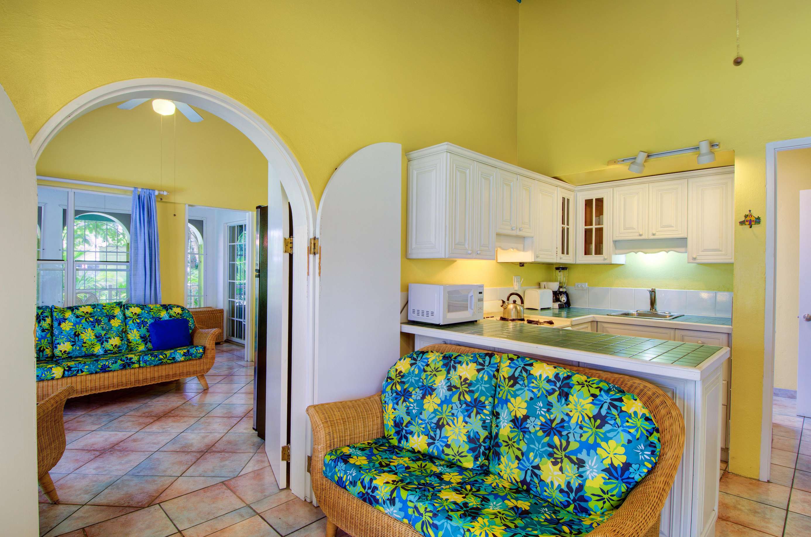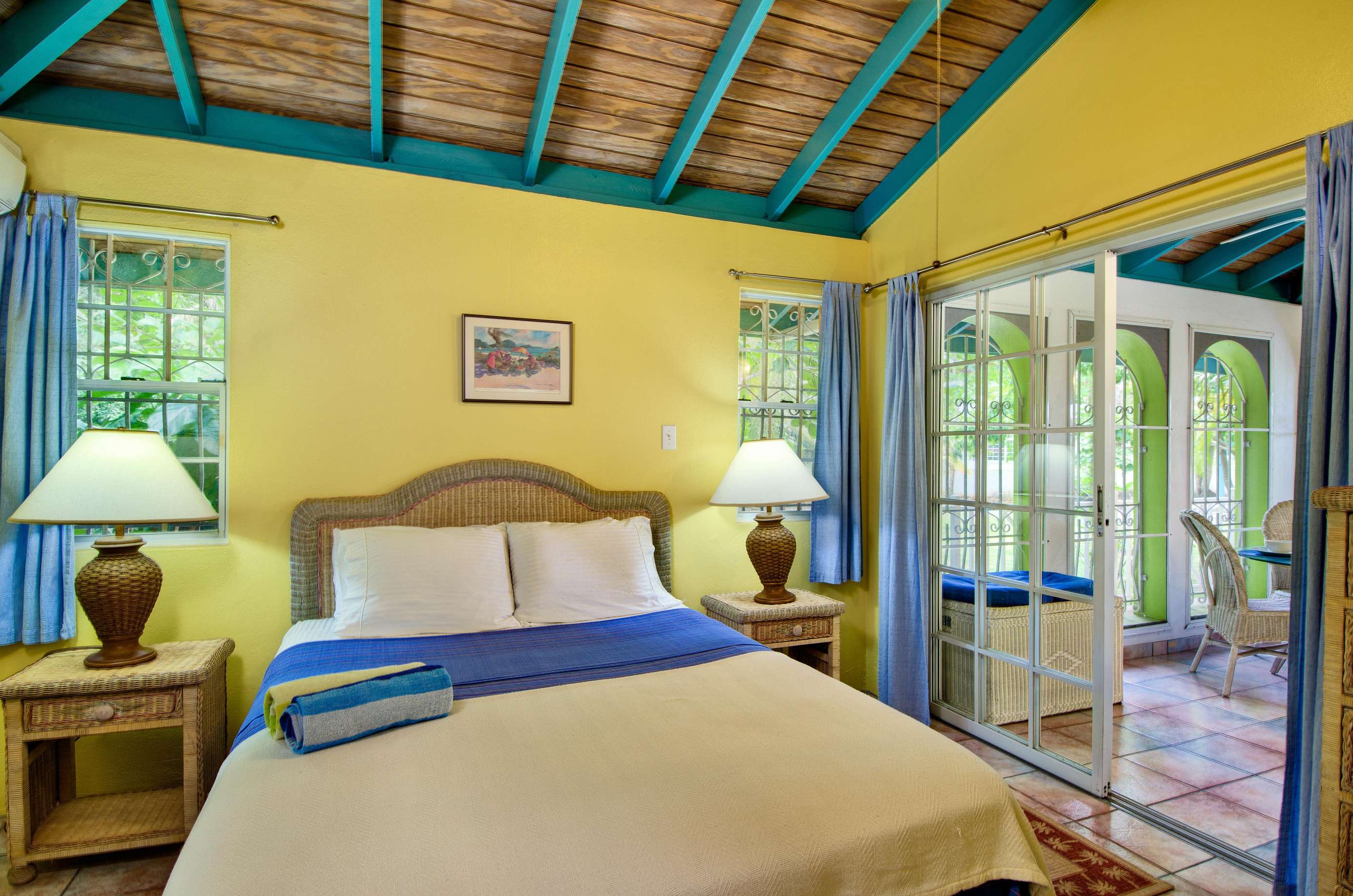 These identical Caribbean-style cottages are four semi-detached units split across two single storey buildings. As you enter your cosy new home-from-home, you’ll be greeted by a sociable kitchen and living area. The sunny yellow walls complement the granite countertop and breakfast bar and if you can resist the restaurants on your doorstep, you’ll find everything you need for self-catering. and the cottage is air-conditioned throughout.