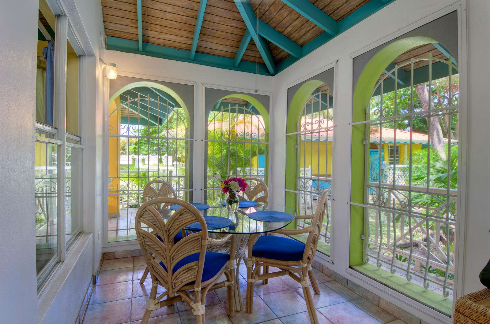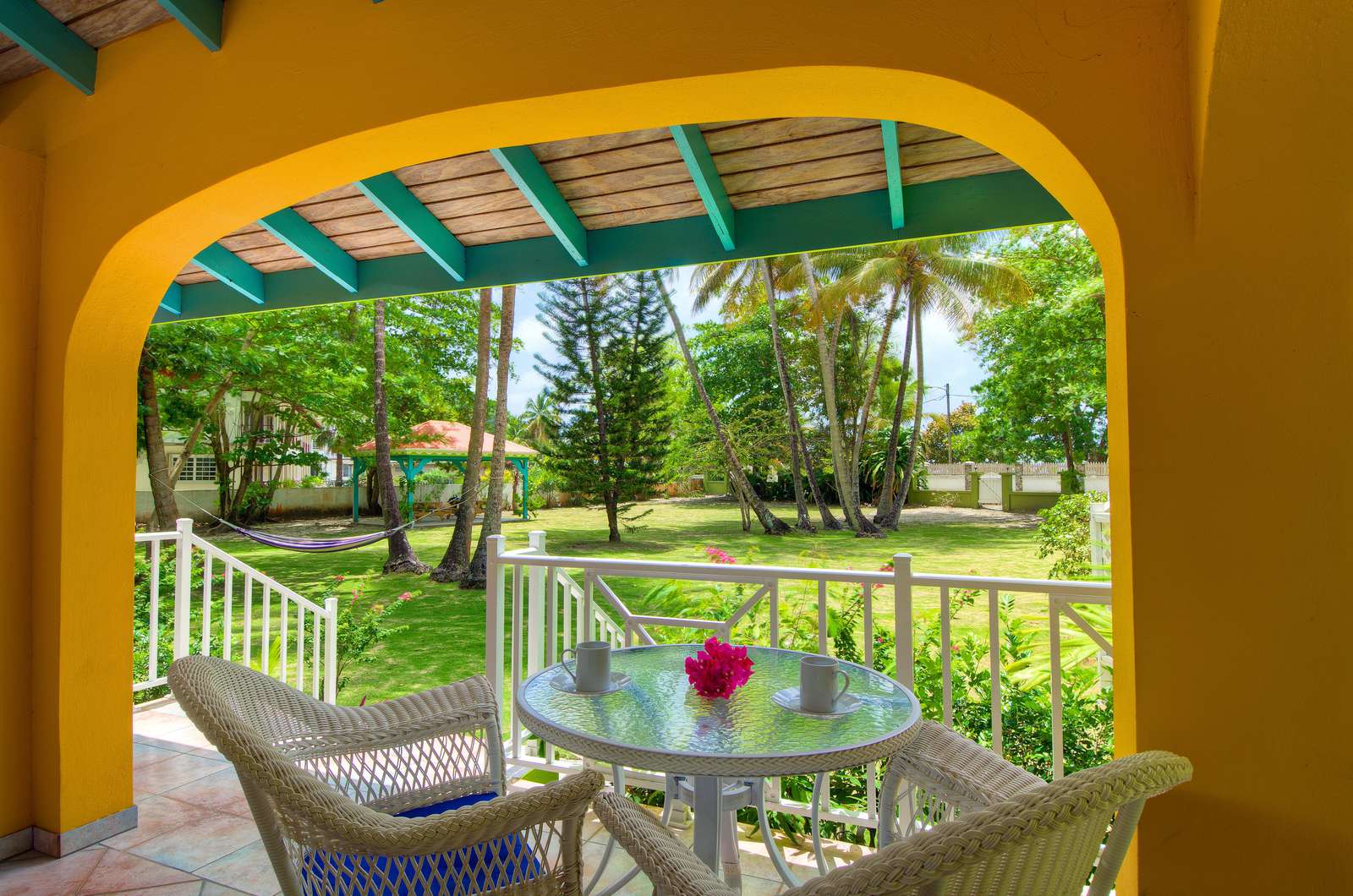 Set in a tropical, grassy walled garden, your personal porch is the perfect spot to enjoy a bite to eat or read a good book. You’ll be surrounded by kalabash, banana, coconut and almond trees, flowering hibiscus bushes and blooming bougainvillea – a blissful backdrop for lazing in a hammock or BBQing up a feast in the communal gazebo. Whilst there might not be beach views, this luscious garden area really whisks you away into a tropical paradise.