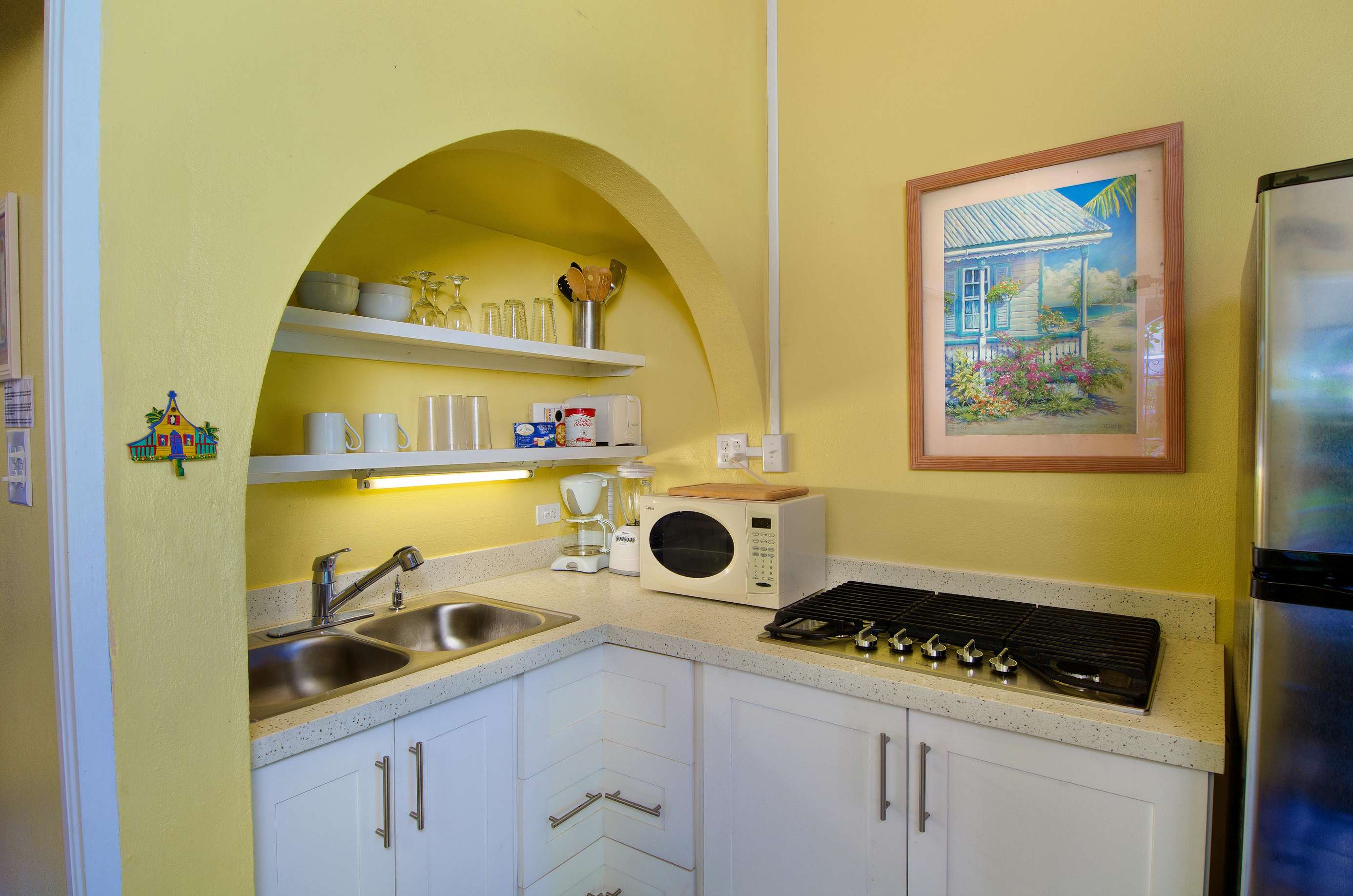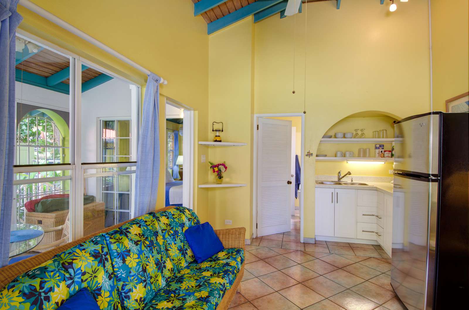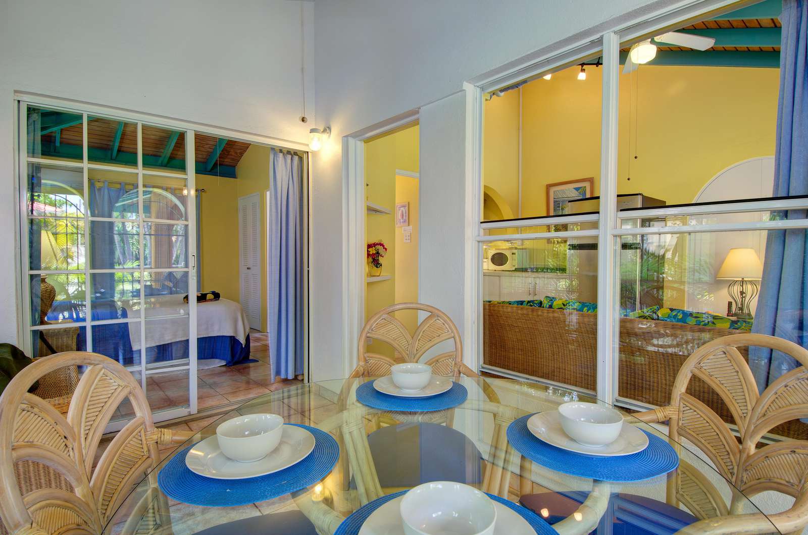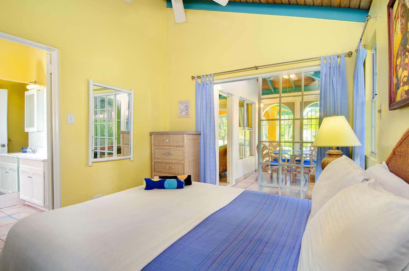 These identical Caribbean-style cottages are four semi-detached units split across two single storey buildings. As you enter your cosy new home-from-home, you’ll be greeted by a sociable kitchen and living area. The sunny yellow walls complement the granite countertop and breakfast bar and if you can resist the restaurants on your doorstep, you’ll find everything you need for self-catering. and the cottage is air-conditioned throughout.