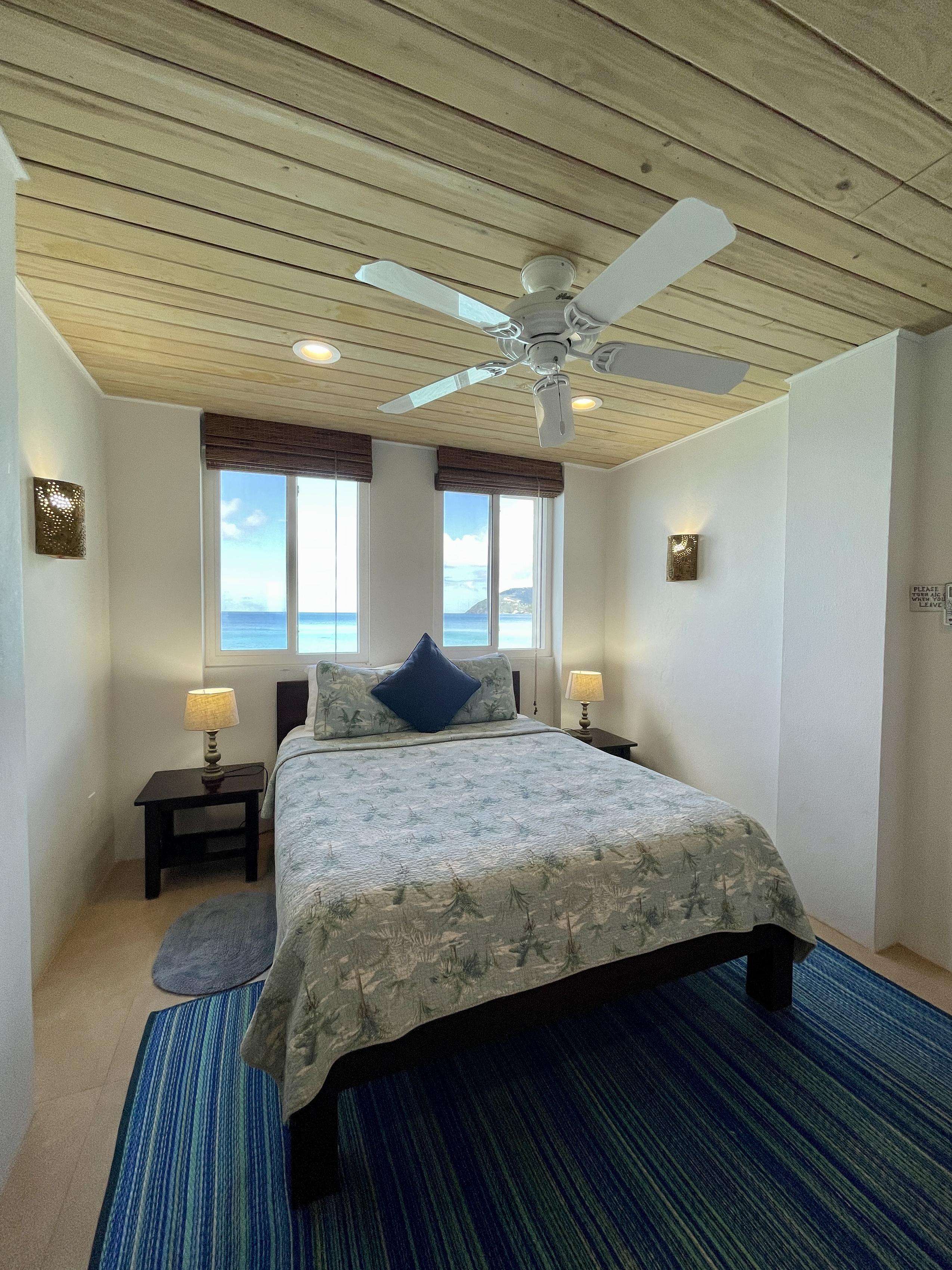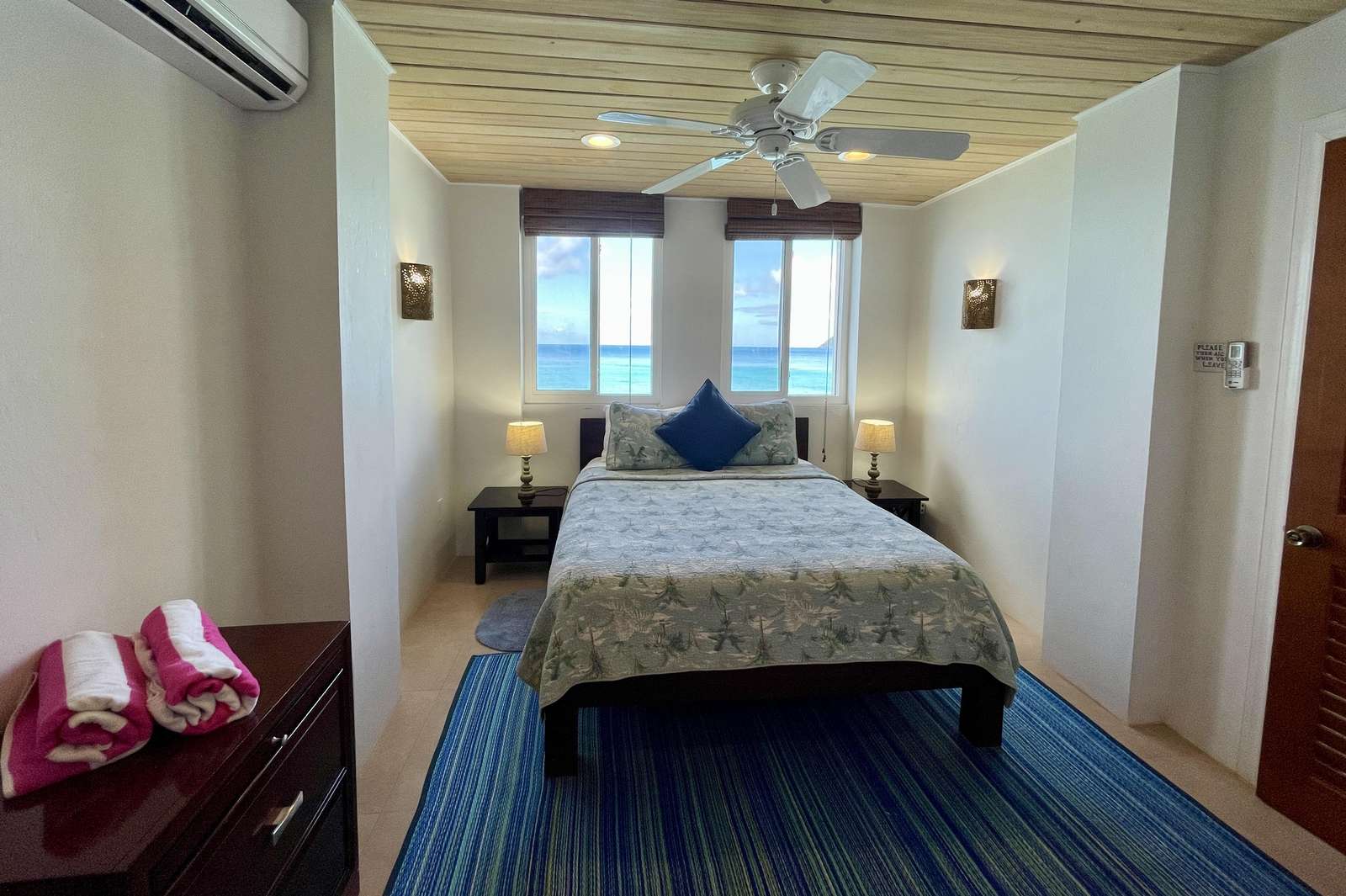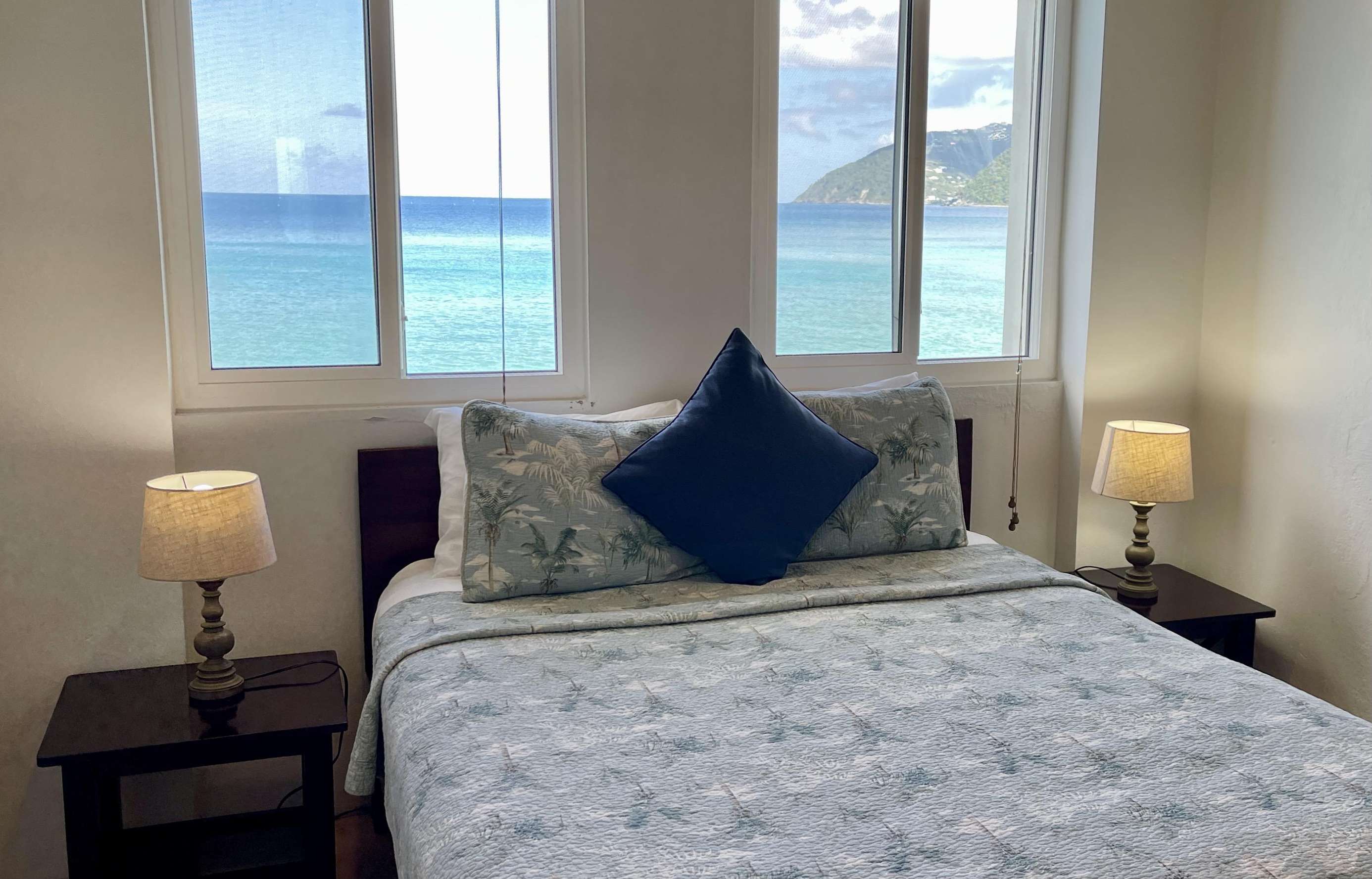 The comfortable ensuite bedroom offers a queen size bed sandwiched between two windows framing the azure ocean. The bathroom has a shower.