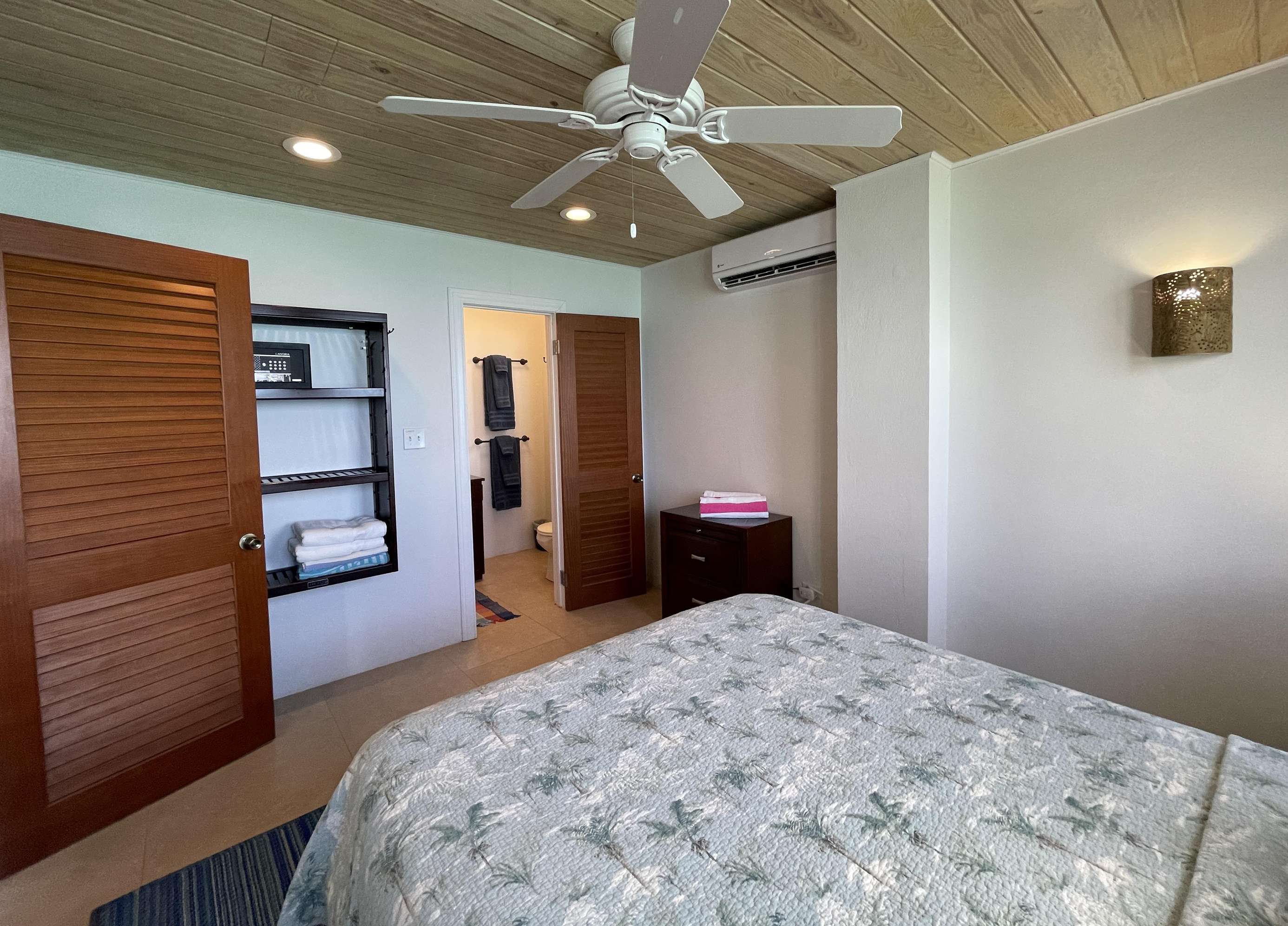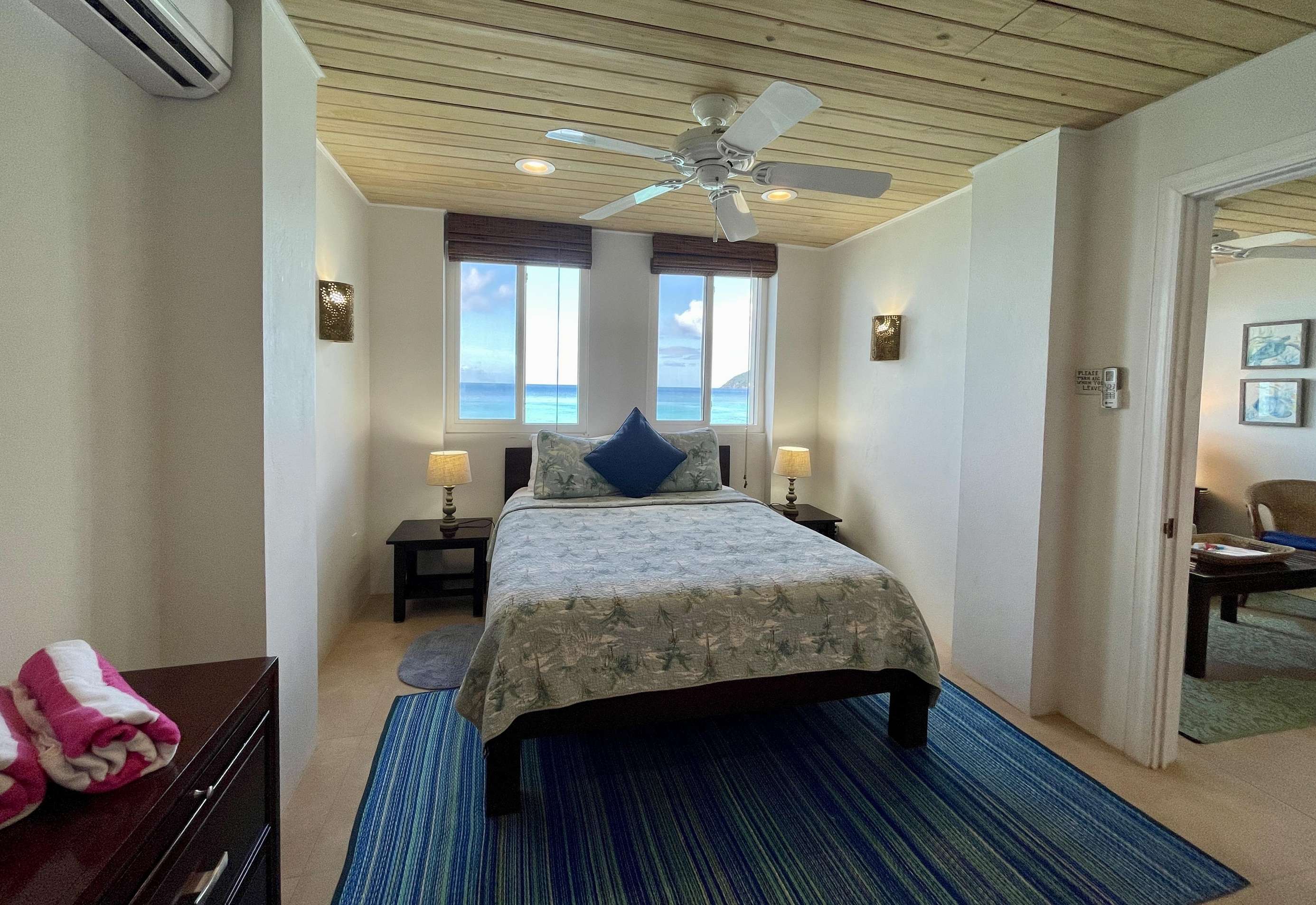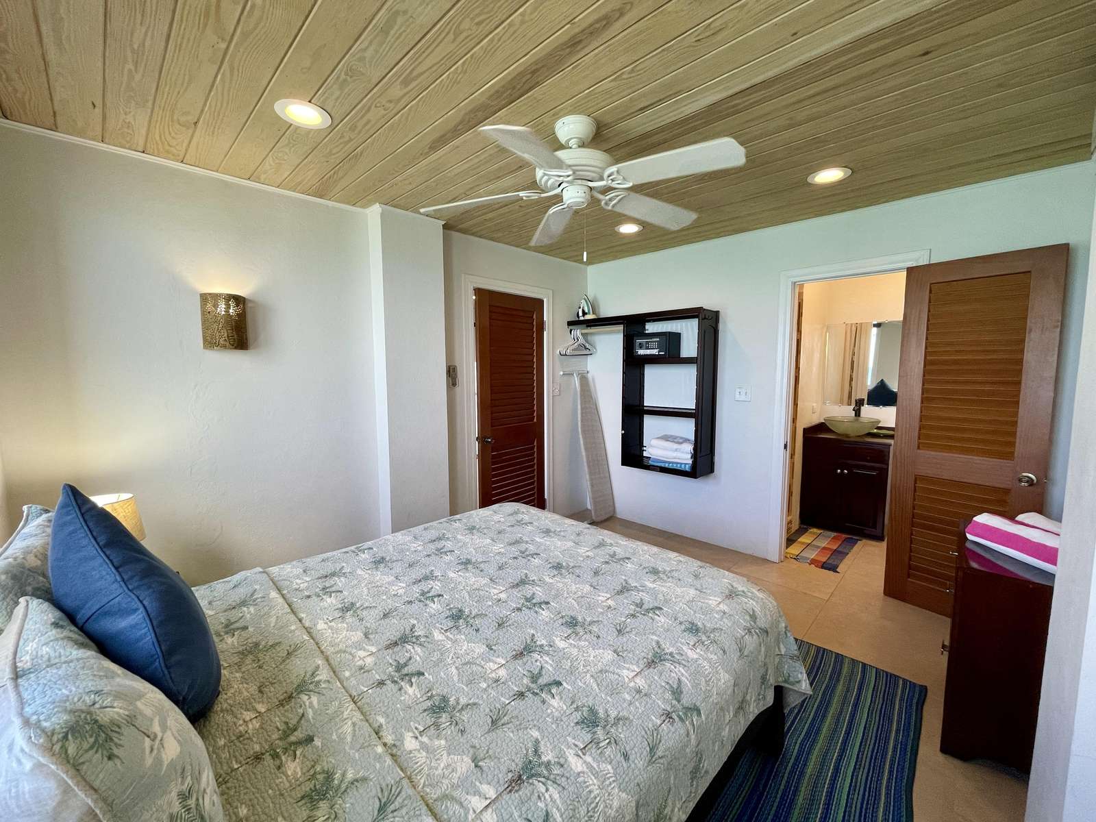 The comfortable ensuite bedroom offers a queen size bed sandwiched between two windows framing the azure ocean. The bathroom has a shower.