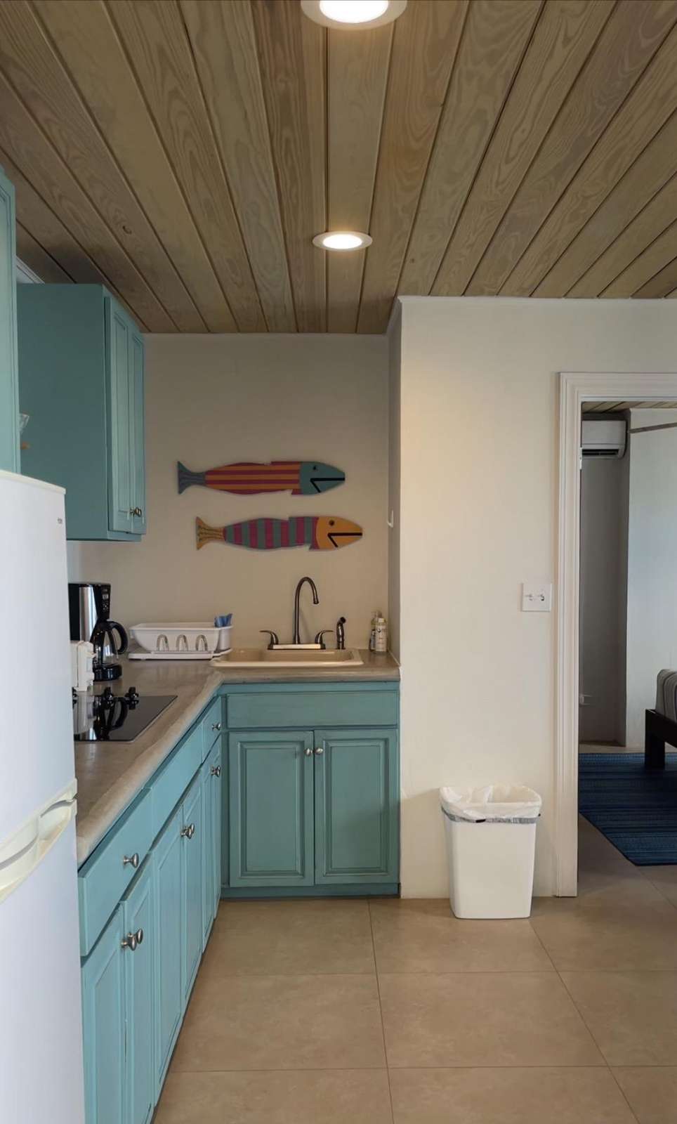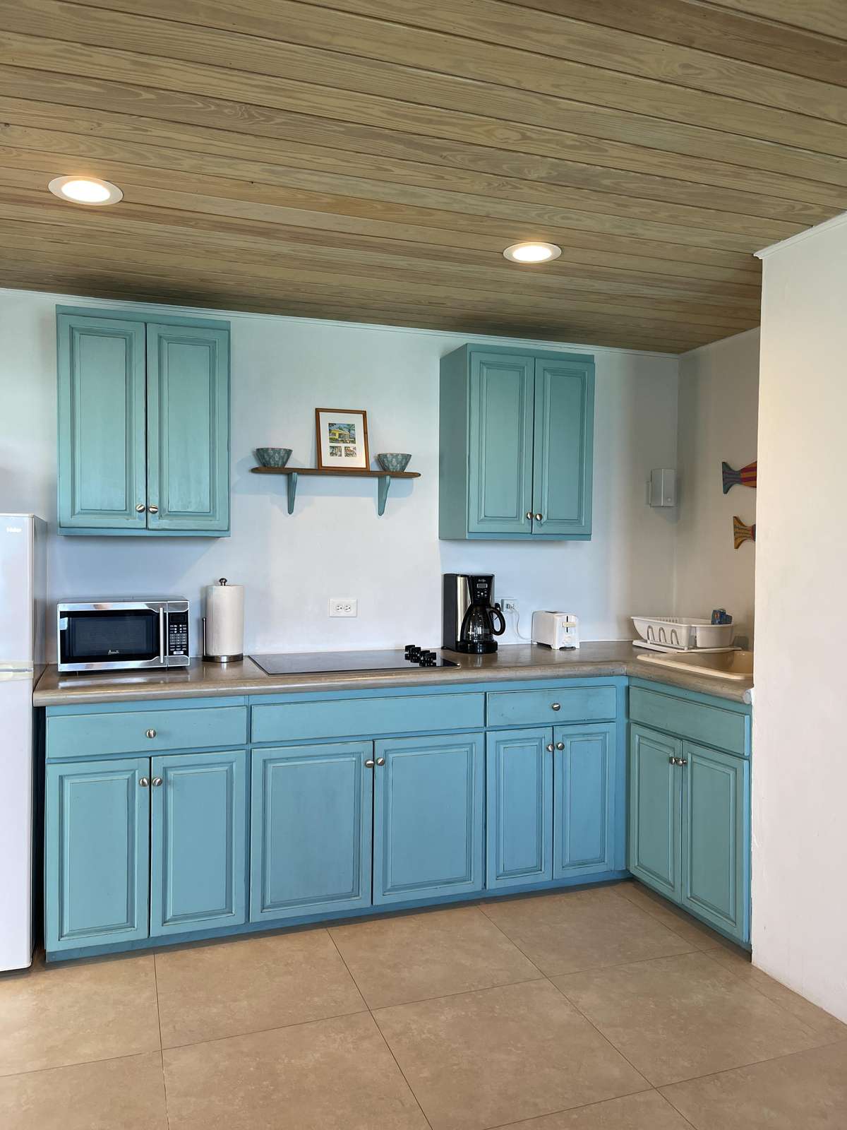 The spacious open-plan kitchen and living area makes for a sociable layout. The kitchen is well equipped for self-catering with fridge/freezer, 4 burner cook top, microwave, blender, toaster, coffee-maker and area for indoor dining. The living room is a cosy spot for moments of downtime with comfy sofa and coffee table. The large glass doors opening from the kitchen to your private porch are screened for your comfort, allowing in plenty of sea breeze, but keeping any pesky bugs out. To keep you cool, the powerful Hunter ceiling fans do a great job, however there is also AC which flows through from the bedroom if you prefer.