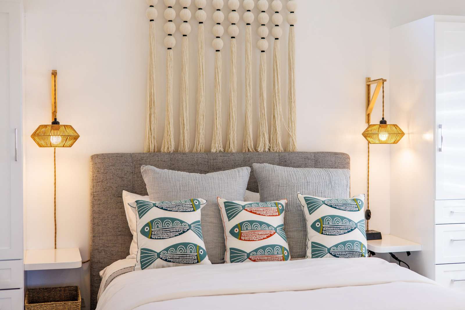 The living areas at Chmada Villa are light, bright & airy, highlighting those incredible turquoise ocean views. Both the upstairs & downstairs have their own open plan living room/ kitchens. For moments of downtime, there are comfy sofas & chairs & a flat-screen SmartTV to watch the game or stream your favourite shows. Handily, the sofa in both the upstairs & downstairs living rooms pull out to make a double bed, making space for an extra guest on each.