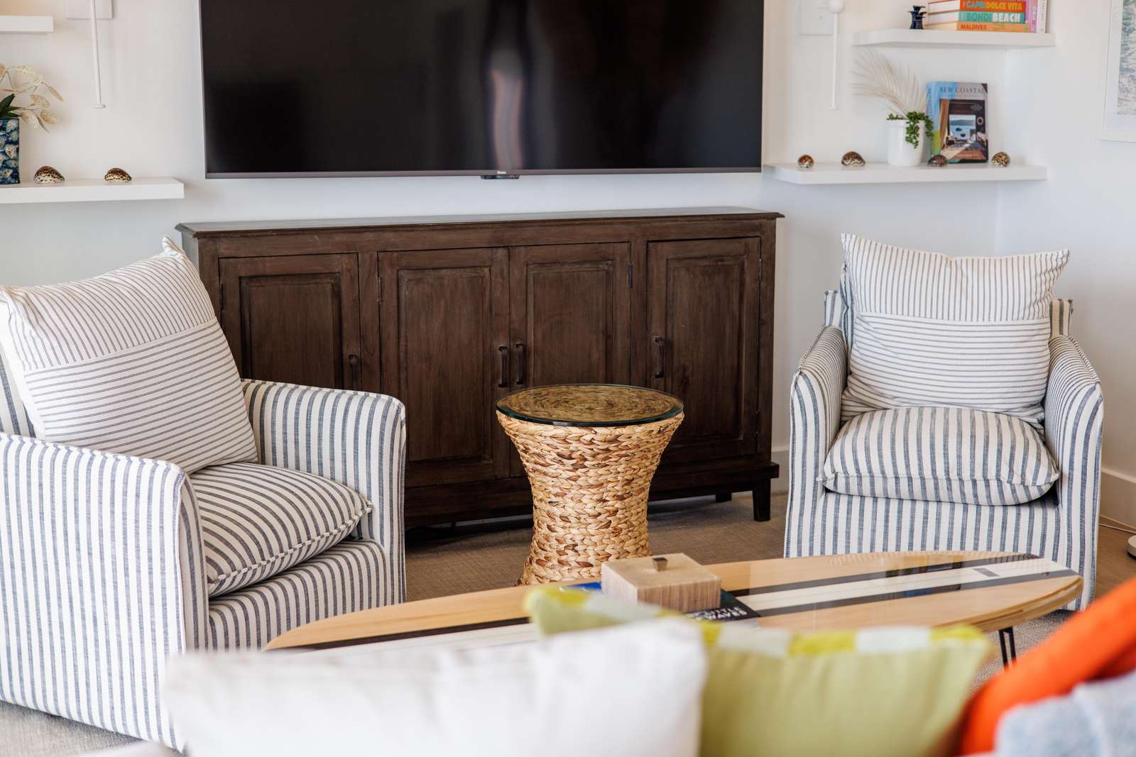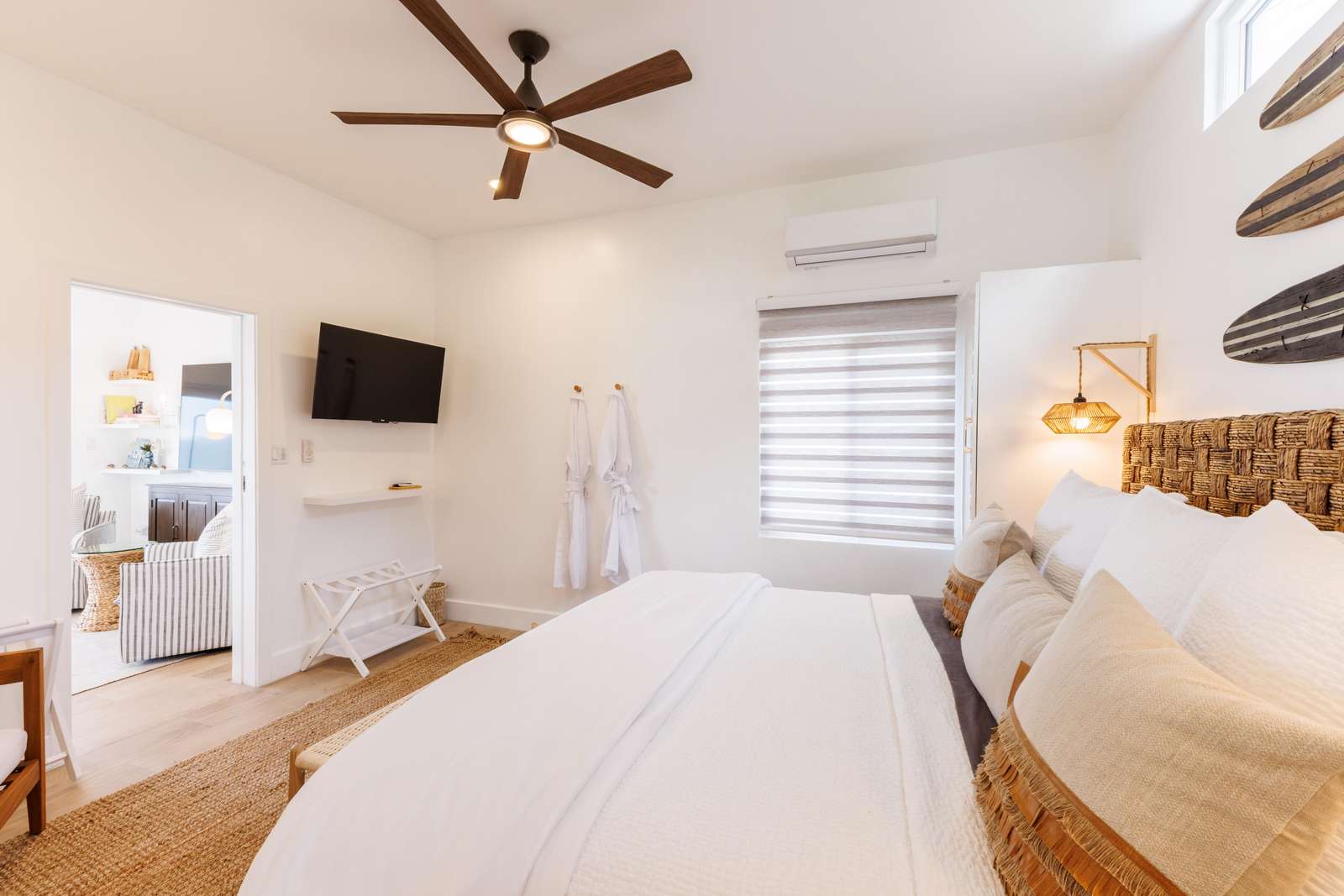 The living areas at Etta Beach Villa are light, bright & airy, highlighting those incredible turquoise ocean views. You'll first be greeted with an open plan living room/ kitchen. For moments of downtime, there's a comfy sofa & chairs & a flat-screen SmartTV to watch the game or stream your favourite shows. Handily, the sofa in pulls out to make a double bed, making space for an extra 5th guest.