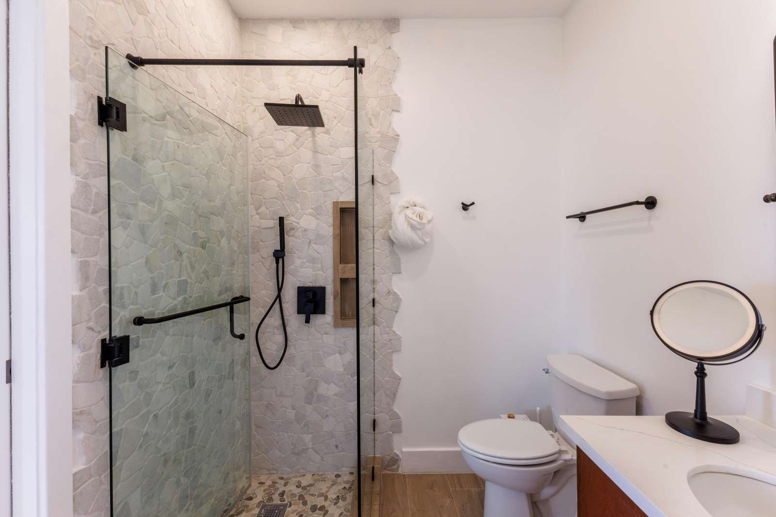 1) The first bedroom is comfy & cool with flat-screen Smart TV & plush King sized bed. The ensuite bathroom has a spacious walk-in shower.