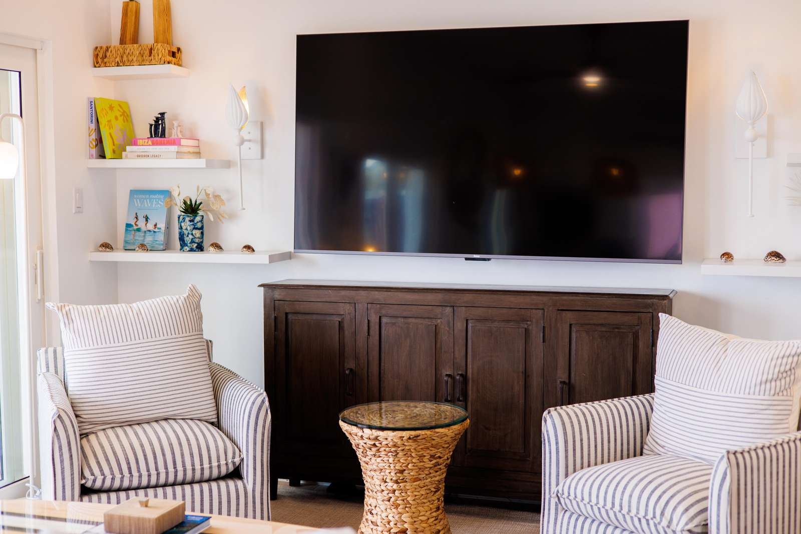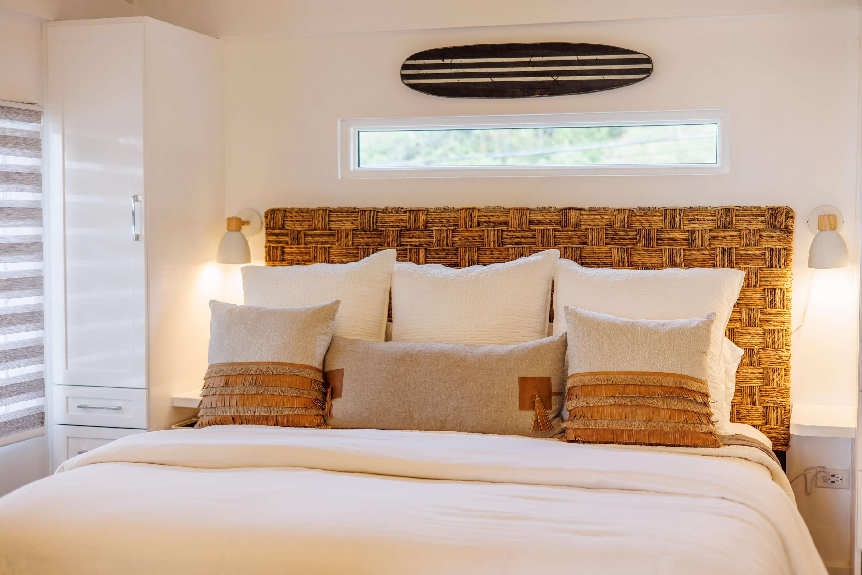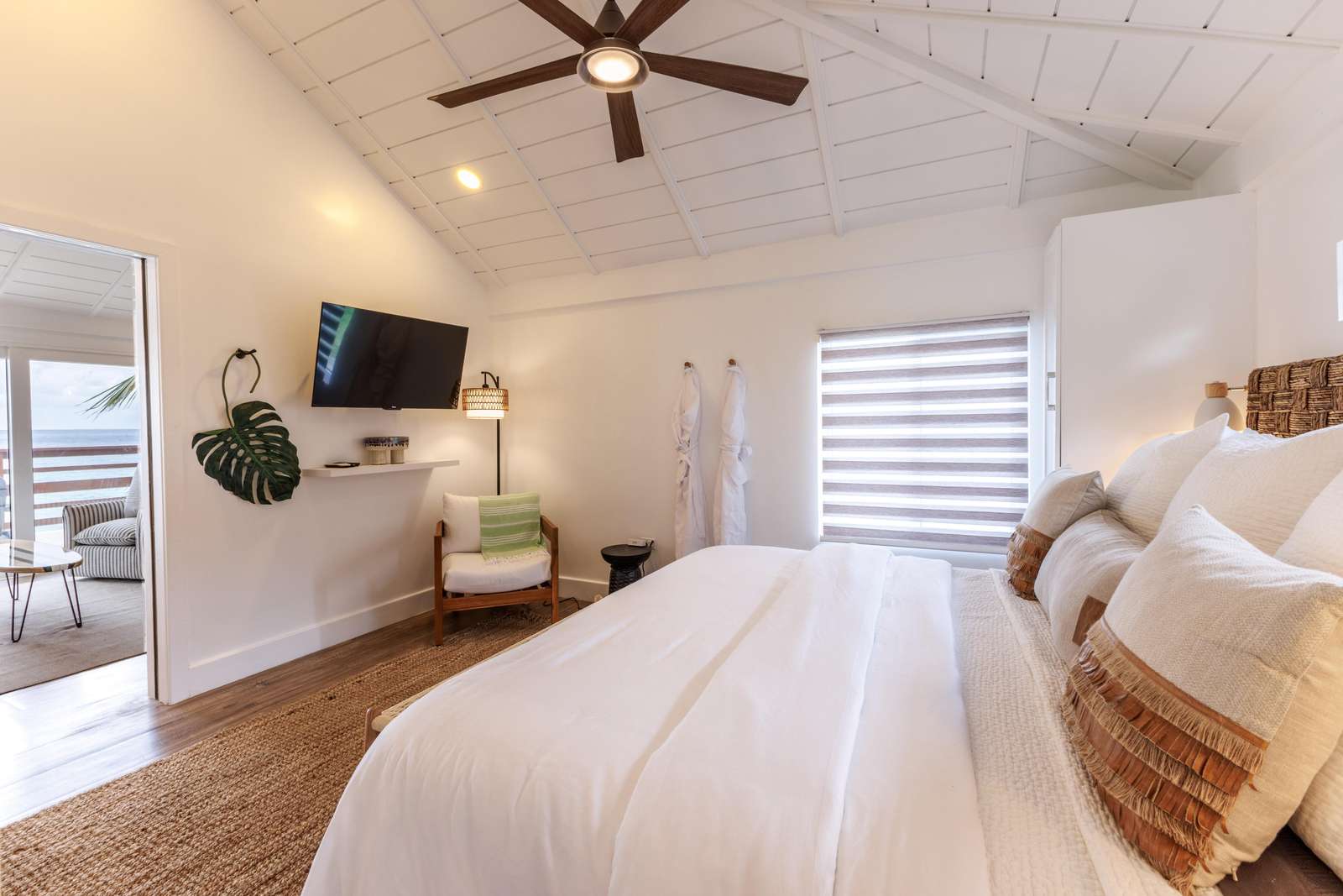 The living areas at Onta Beach Villa are light, bright & airy, highlighting those incredible turquoise ocean views. You'll first be greeted with an open plan living room/ kitchen. For moments of downtime, there's a comfy sofa & chairs & a flat-screen SmartTV to watch the game or stream your favourite shows. Handily, the sofa in pull out to make a double bed, making space for an extra 5th guest.