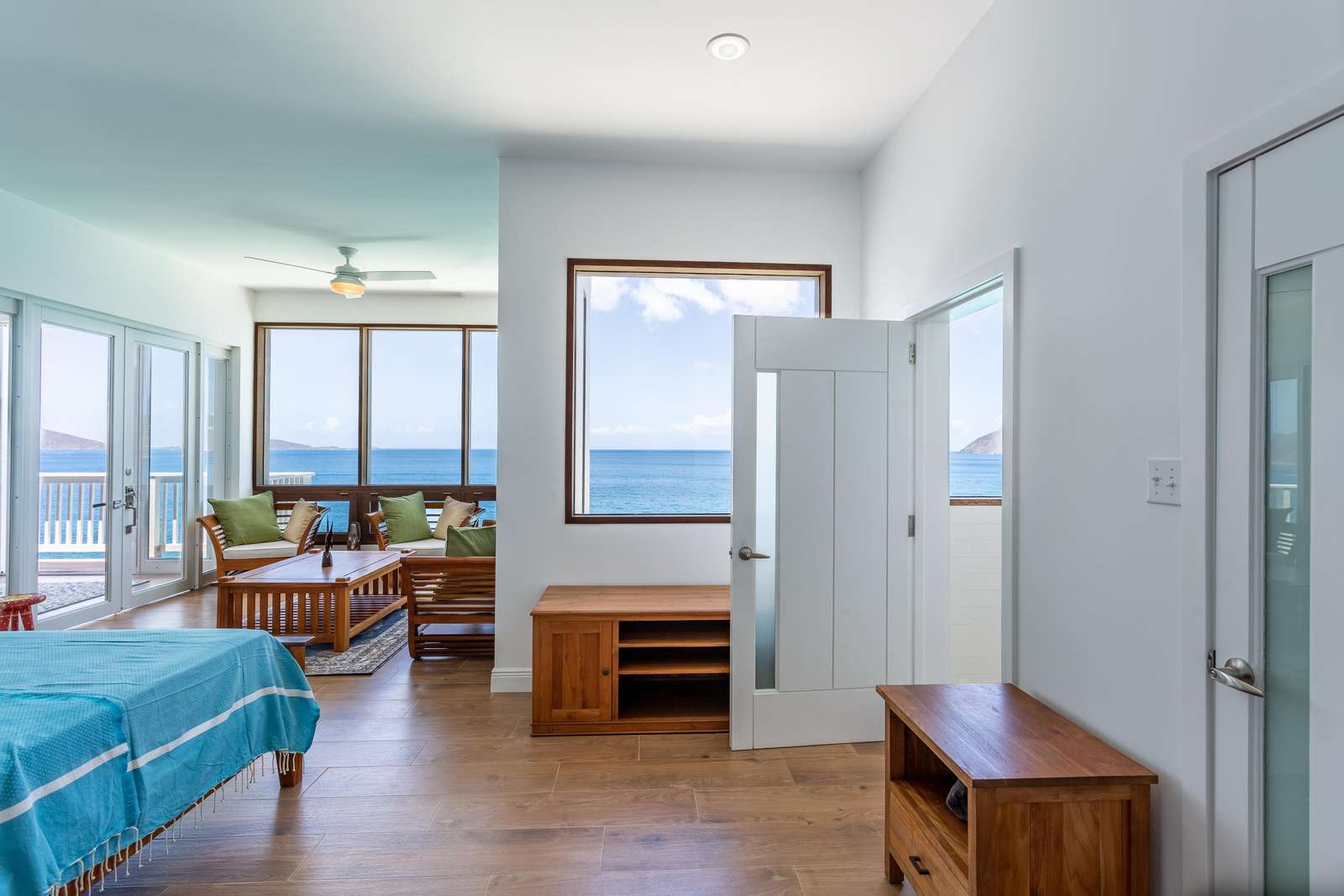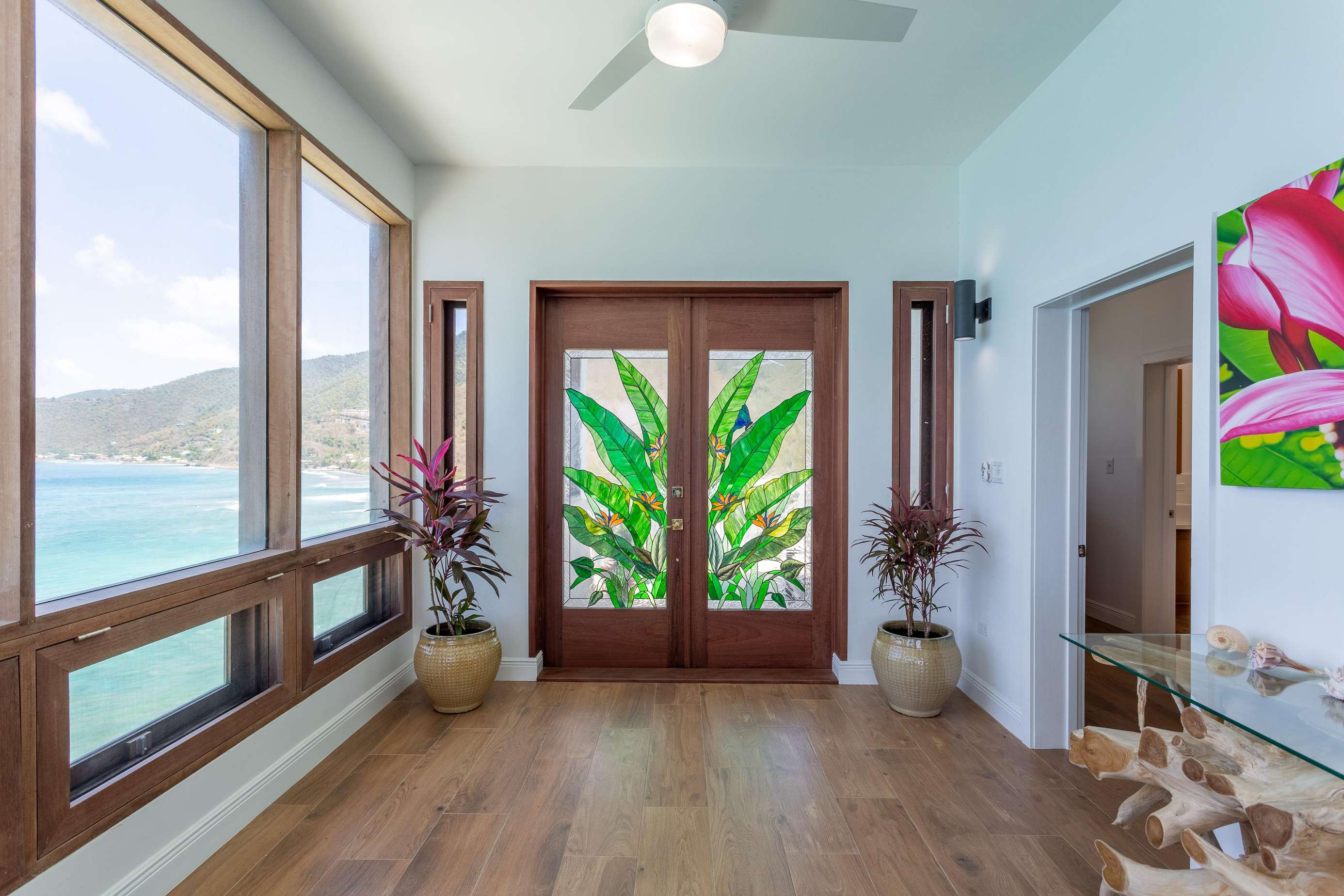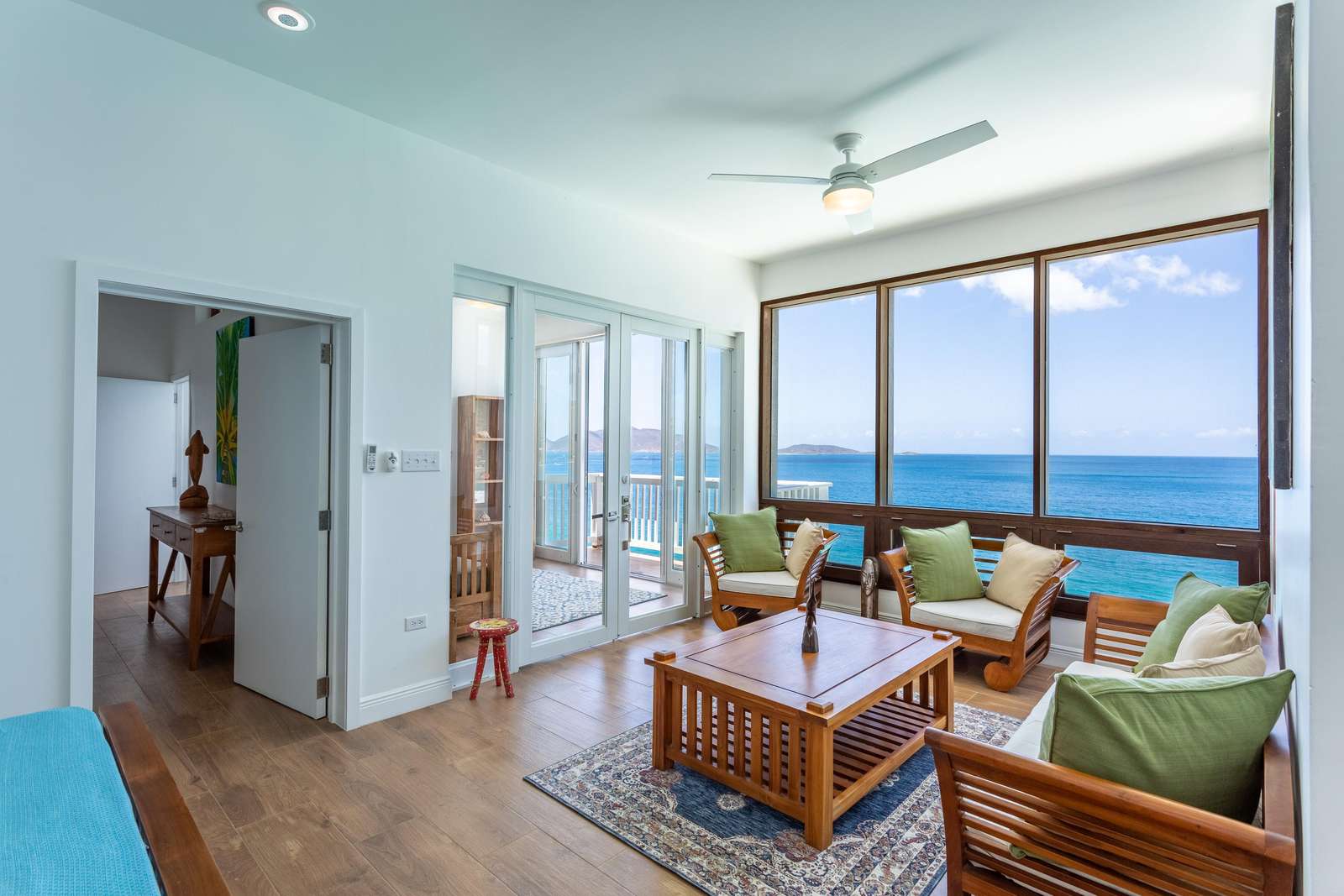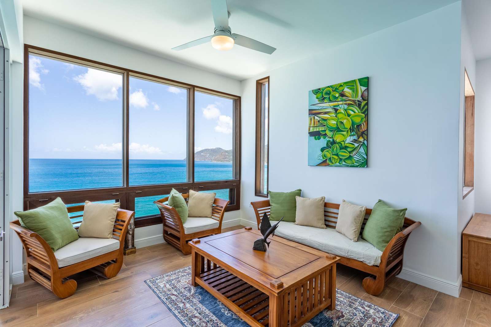 A custom stained-glass front doors open into the heart of the home. Ahead is a super light and airy open-plan sitting room and Kitchen. The comfy sitting area takes advantage of the cross breeze from the stained glass doors all the way to the opposite porch which it is completely open to. You can also close this wall up with an automatic hurricane shutter. Huge glass windows frame the clear skies and azure ocean from every angle.