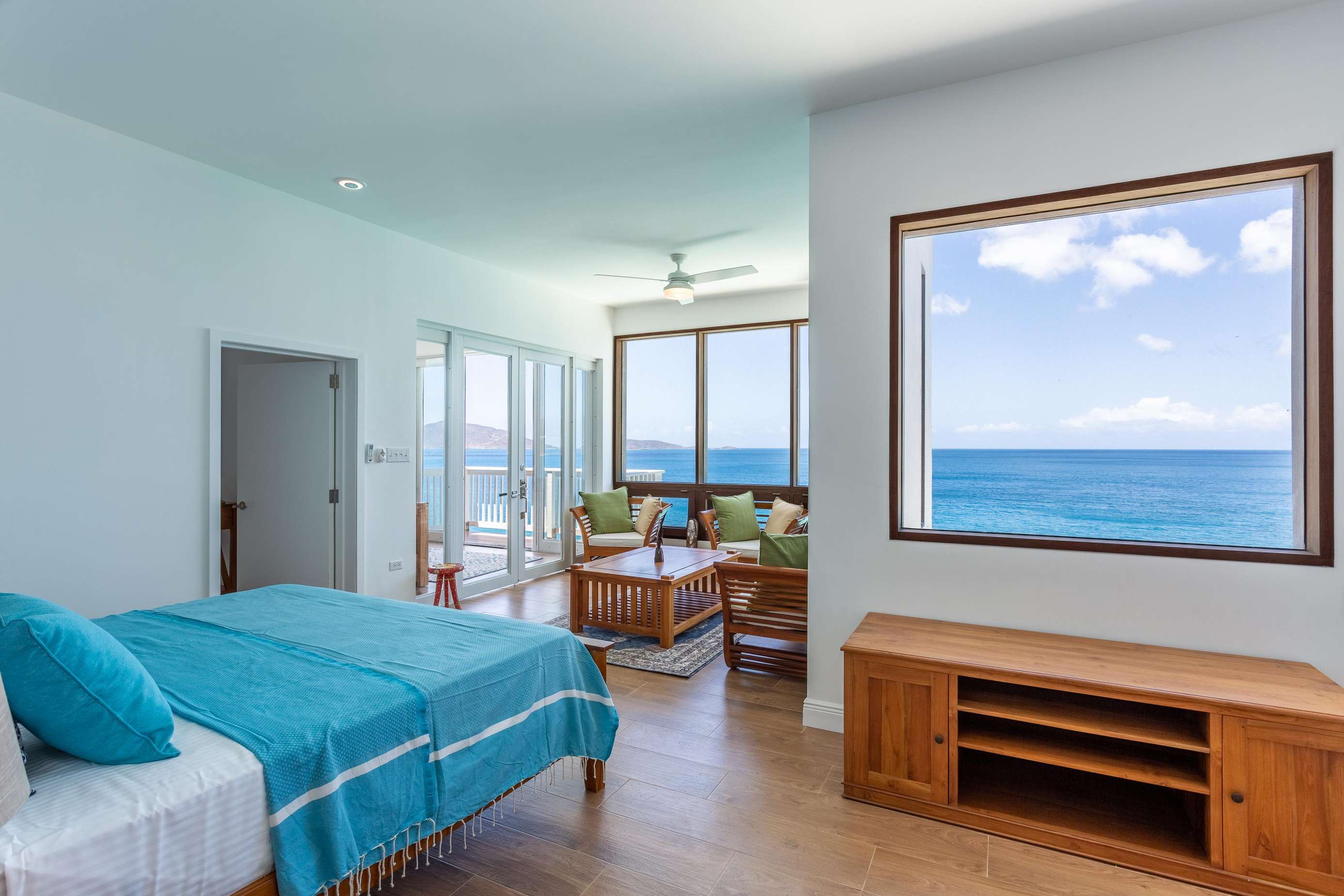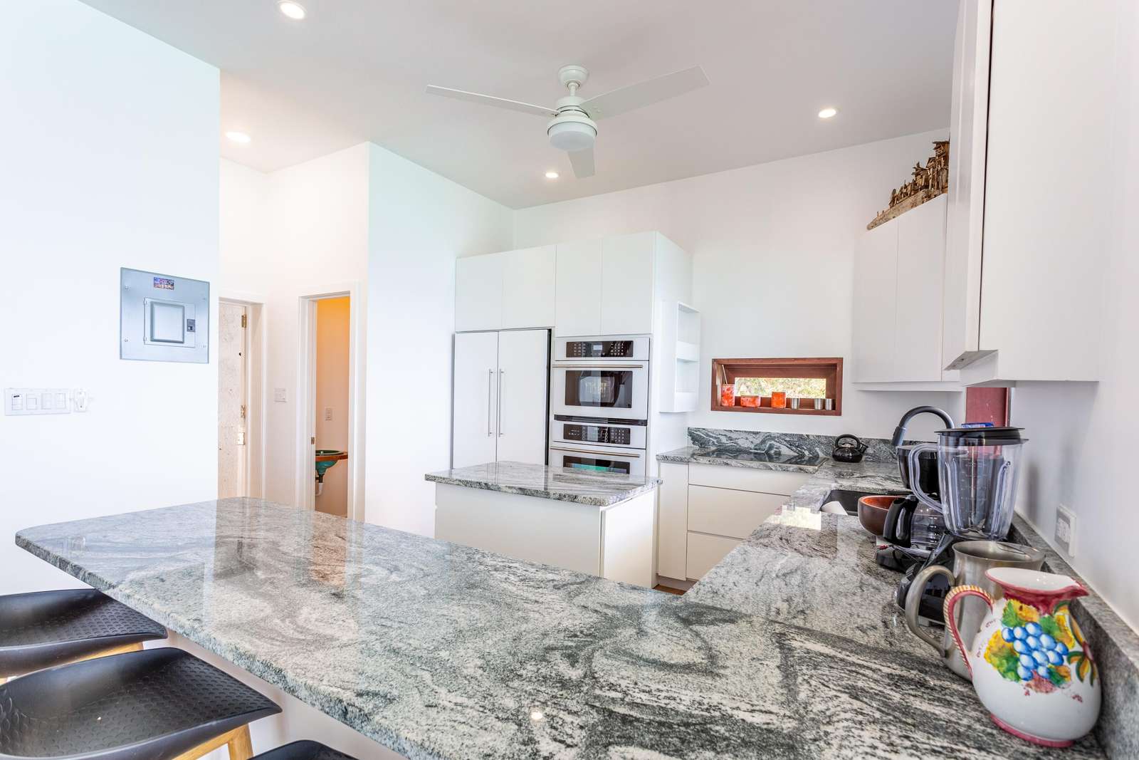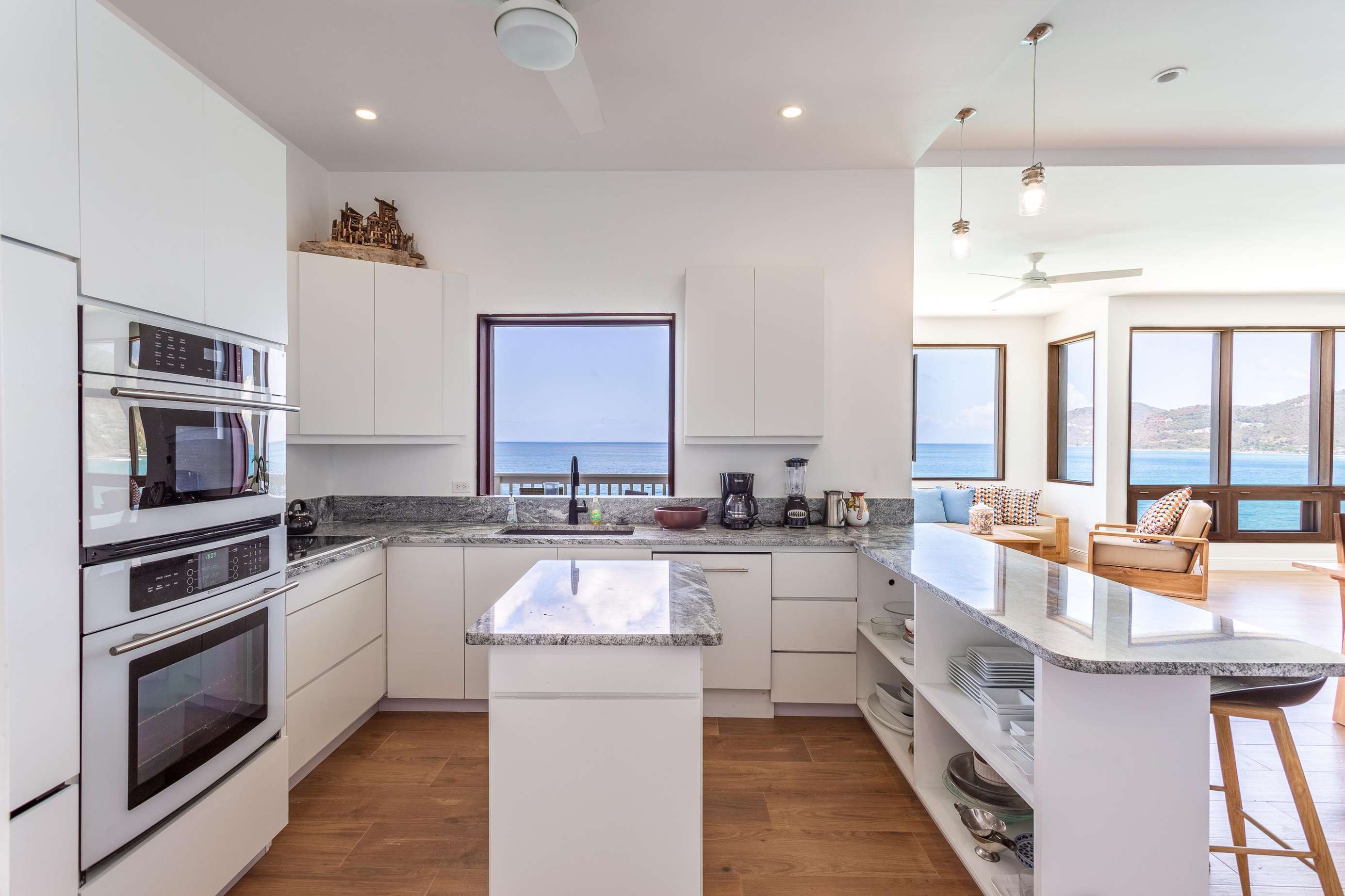 A custom stained-glass front doors open into the heart of the home. Ahead is a super light and airy open-plan sitting room and Kitchen. The comfy sitting area takes advantage of the cross breeze from the stained glass doors all the way to the opposite porch which it is completely open to. You can also close this wall up with an automatic hurricane shutter. Huge glass windows frame the clear skies and azure ocean from every angle.