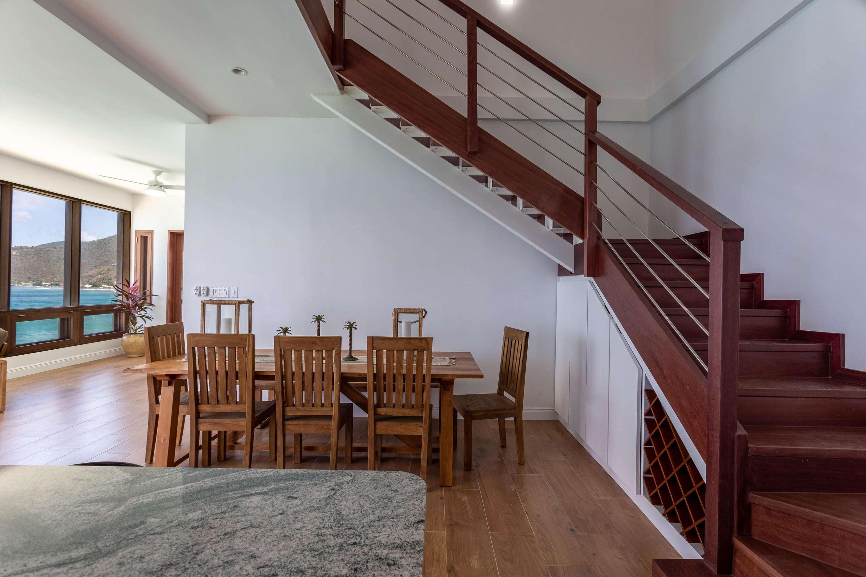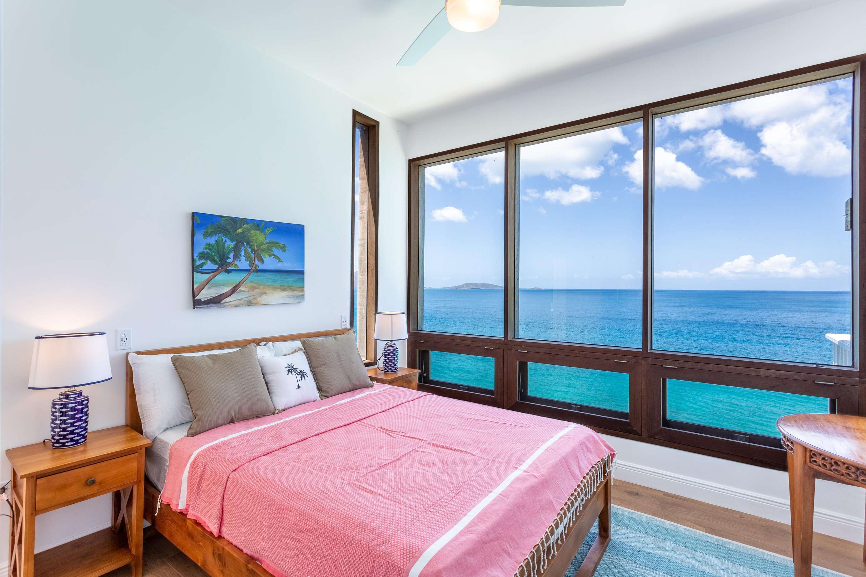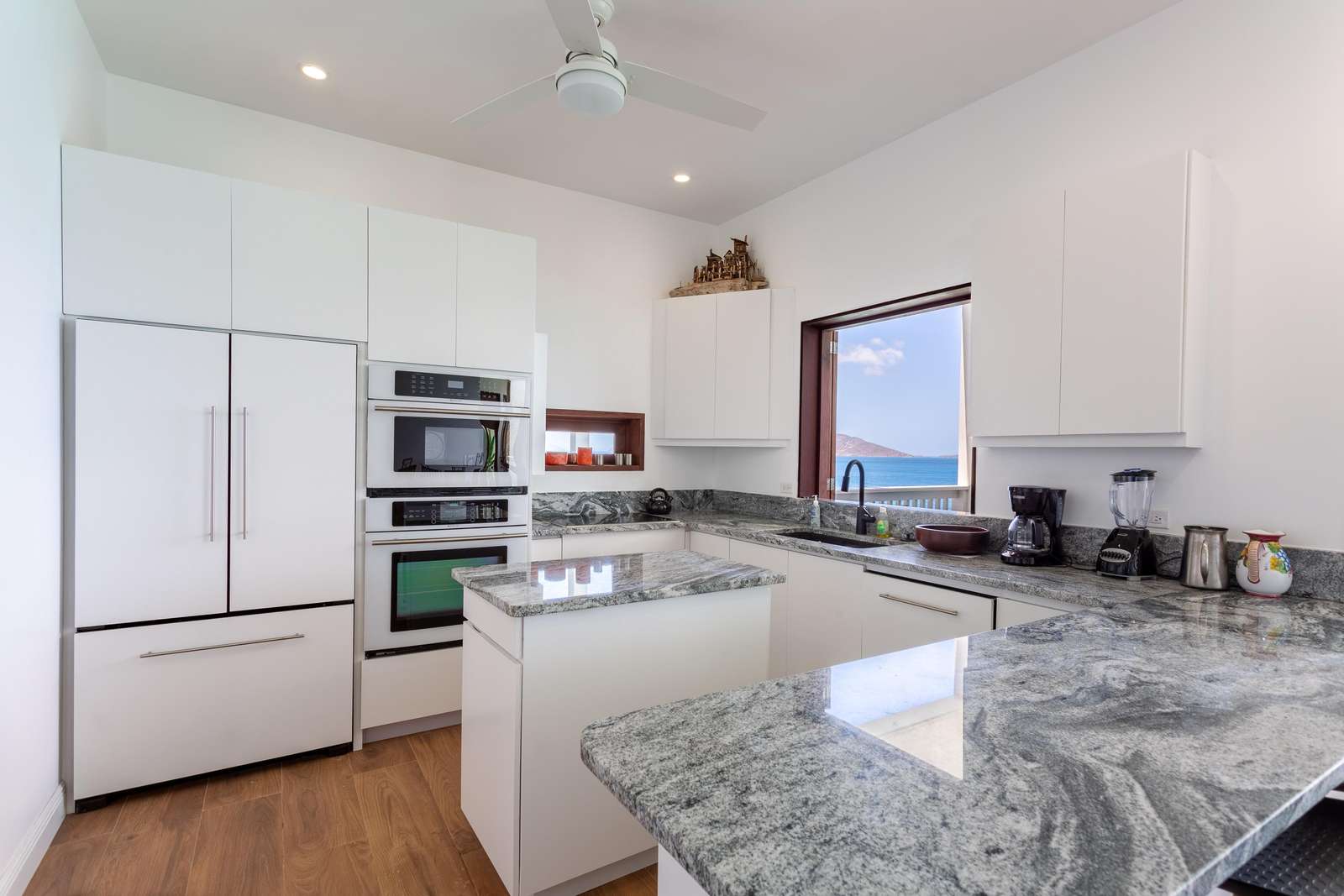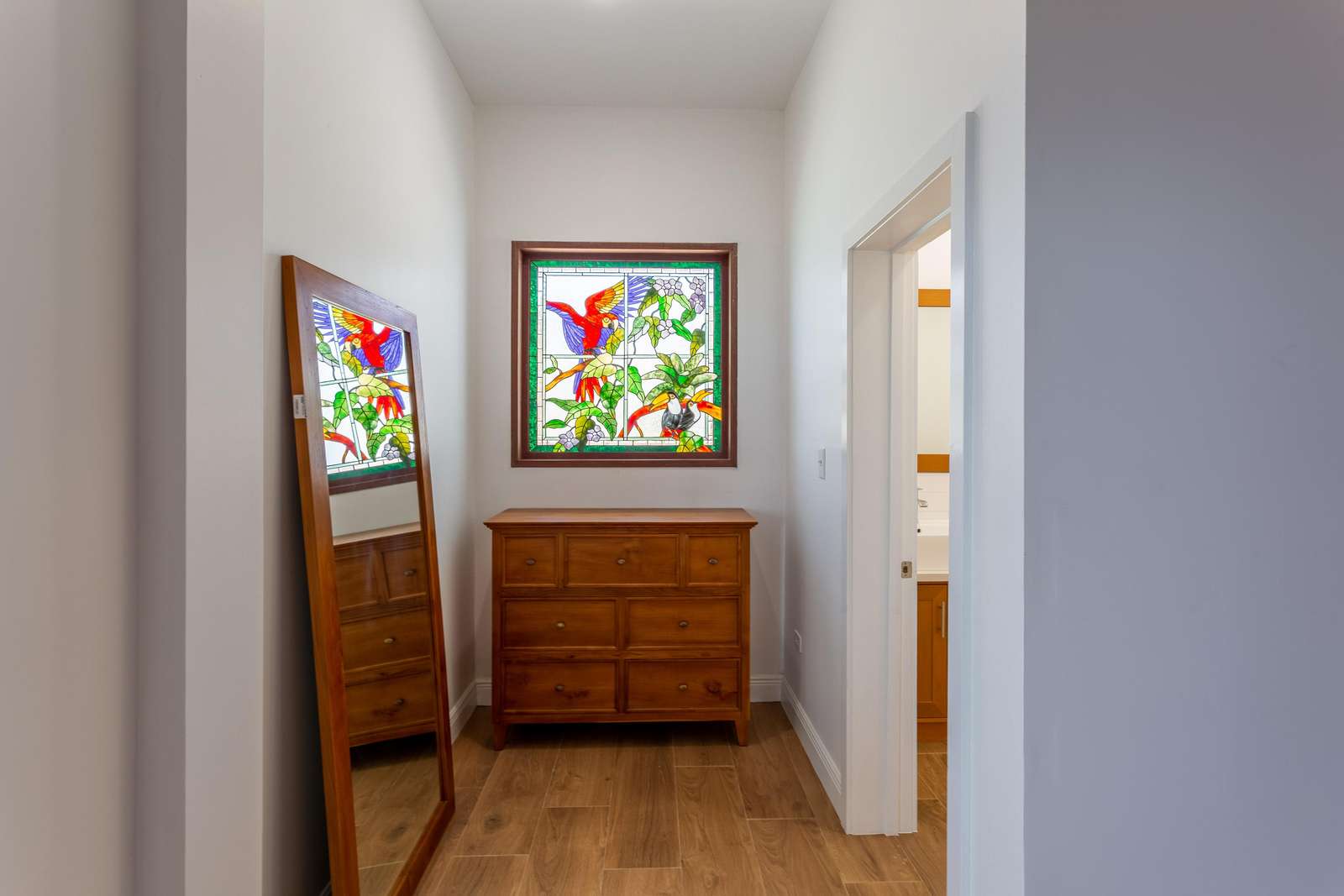 A custom stained-glass front doors open into the heart of the home. Ahead is a super light and airy open-plan sitting room and Kitchen. The comfy sitting area takes advantage of the cross breeze from the stained glass doors all the way to the opposite porch which it is completely open to. You can also close this wall up with an automatic hurricane shutter. Huge glass windows frame the clear skies and azure ocean from every angle.