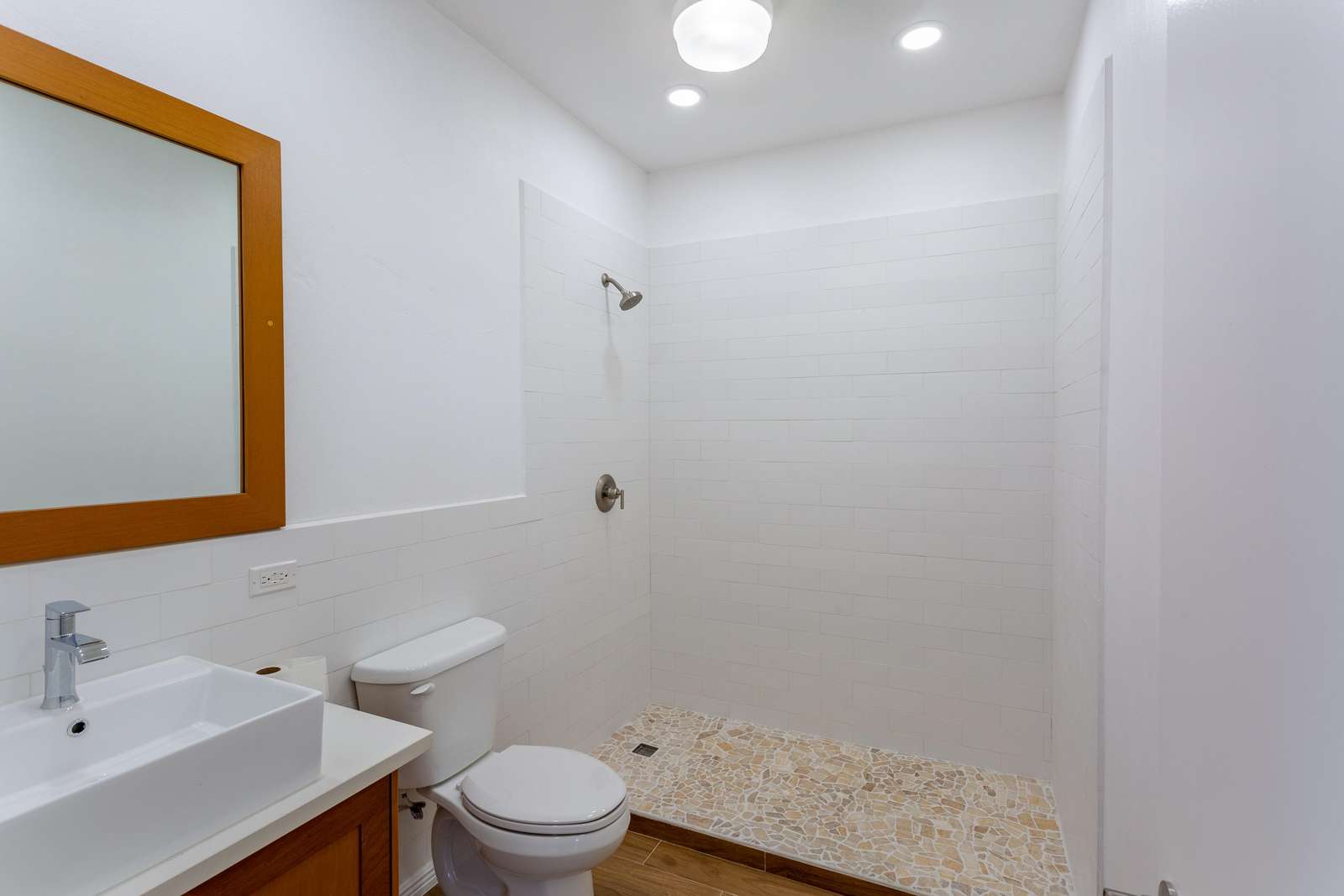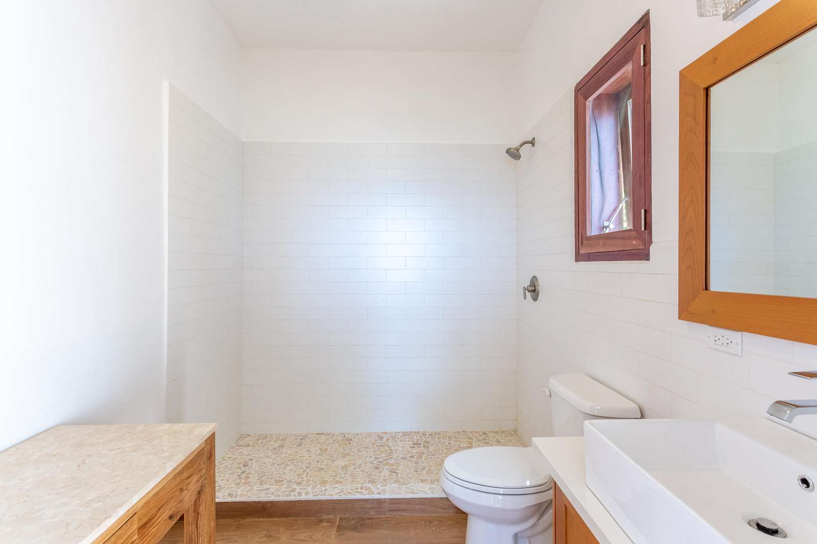 The main floor has a large Cocktail Deck to the East, overlooking the surf break and the coastal villages of Apple & Carrot Bay and an enclosed outdoor shower to the right is the perfect spot to rinse off after the beach as you overlook the beach below.