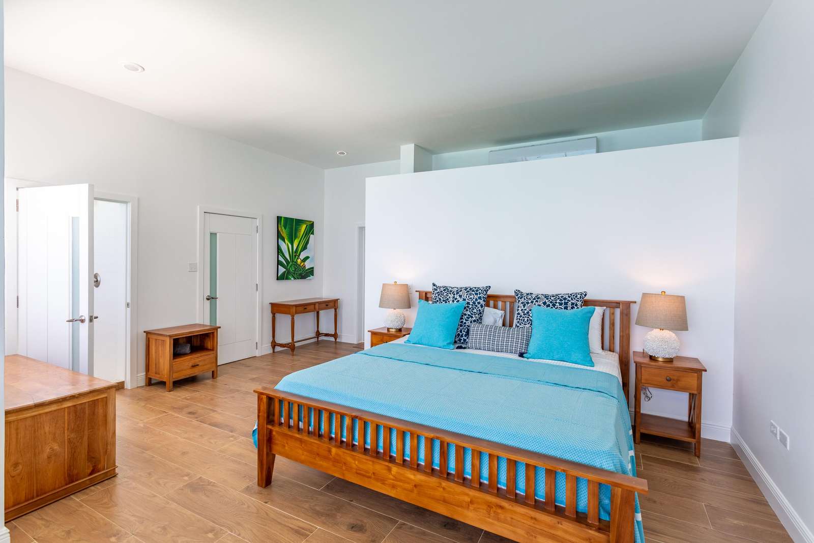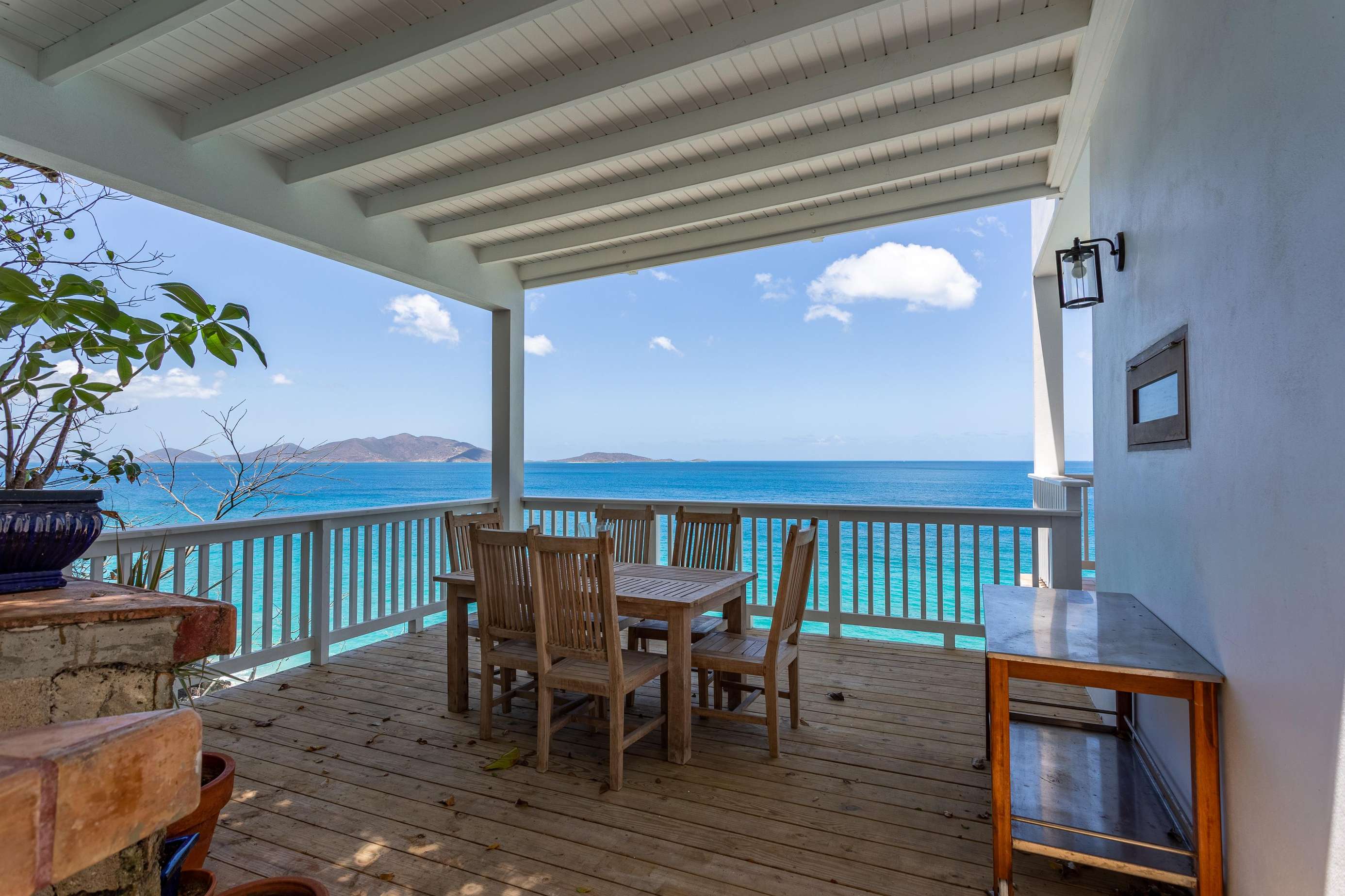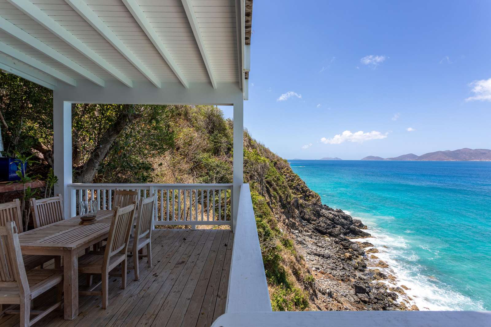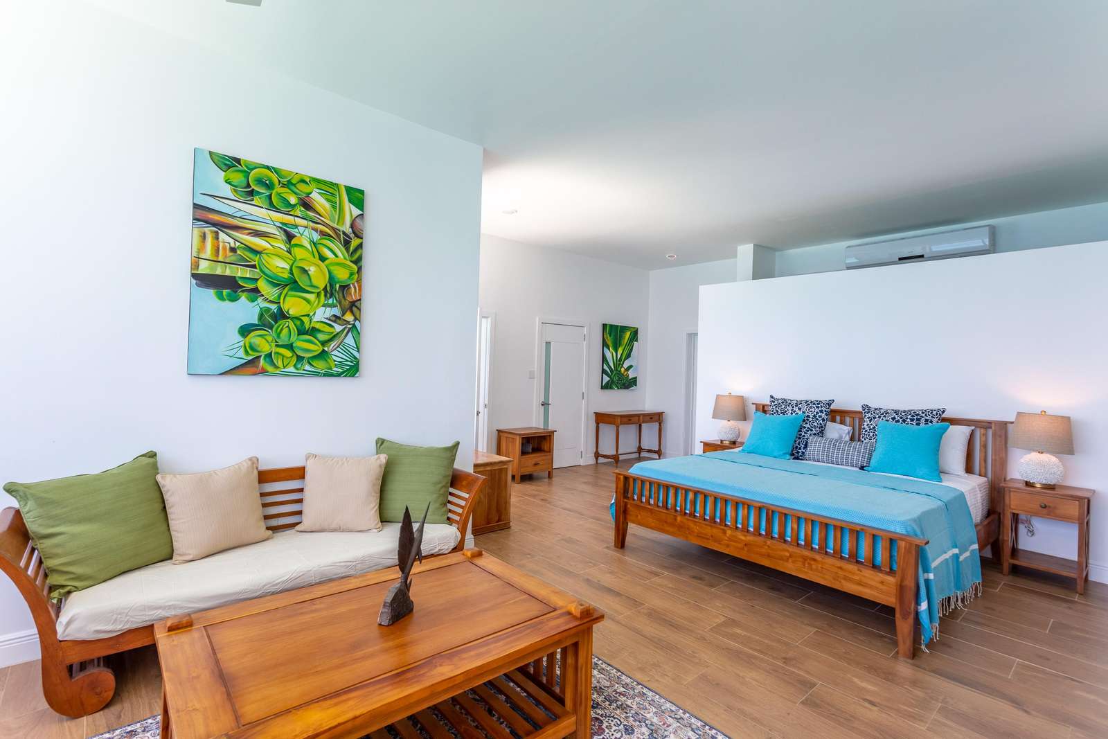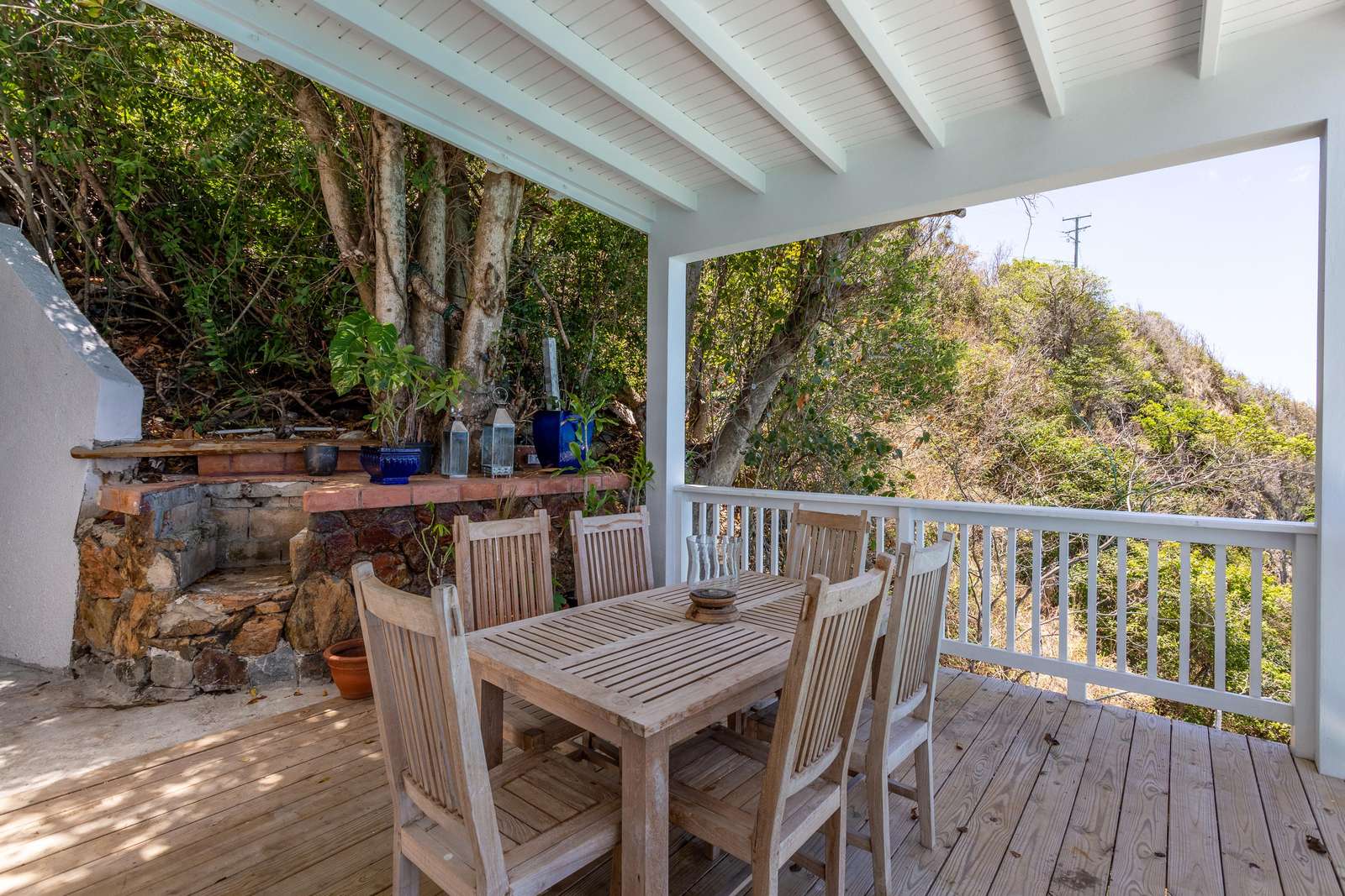 Just past the living room lies the Sunset Porch, a covered porch with a small table and chairs perfect for coffee or cocktails with an ocean view. Beyond this lies a covered dining area with built-in gas BBQ. The perfect place to grill some local conch or lobster and enjoy a sundowner.