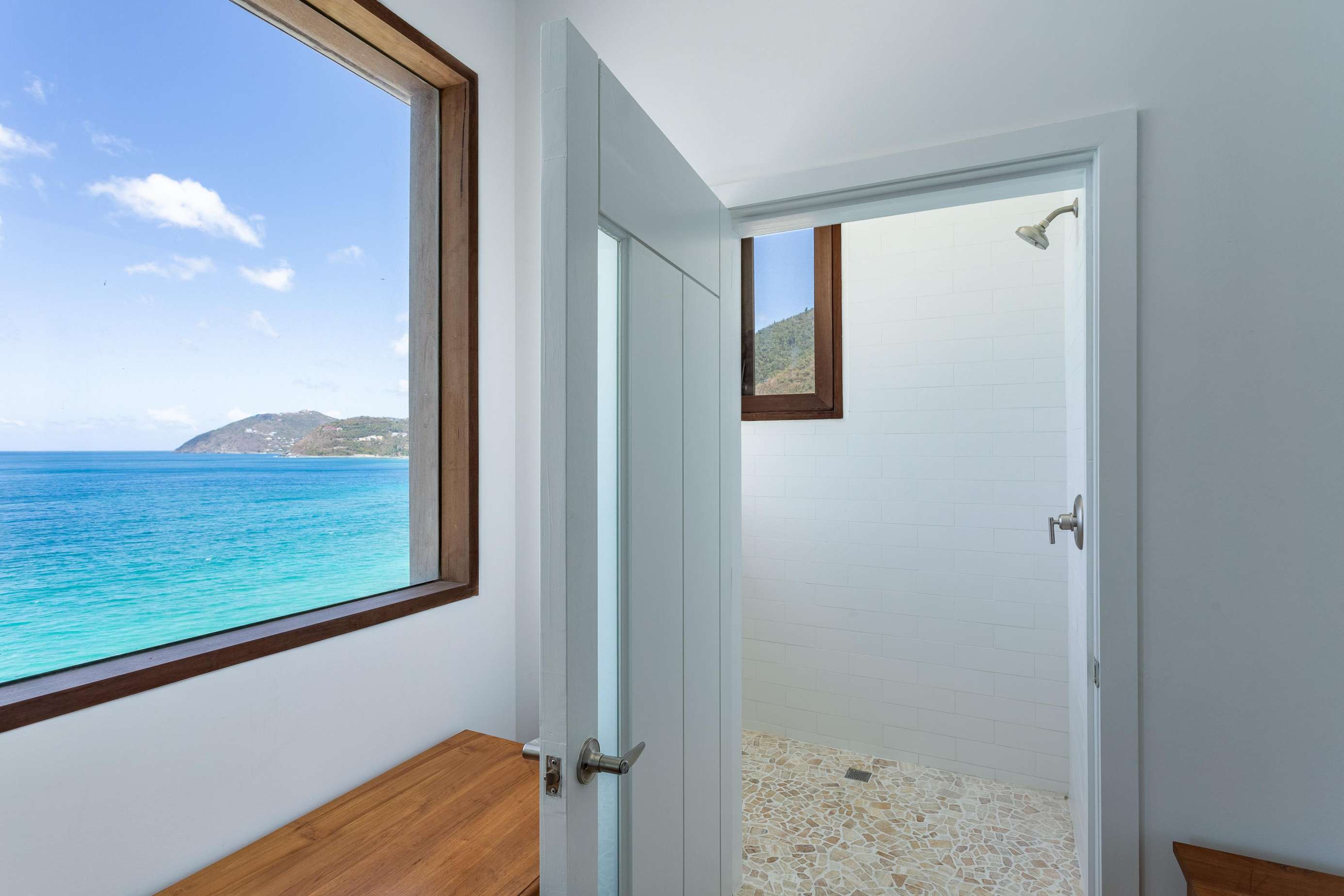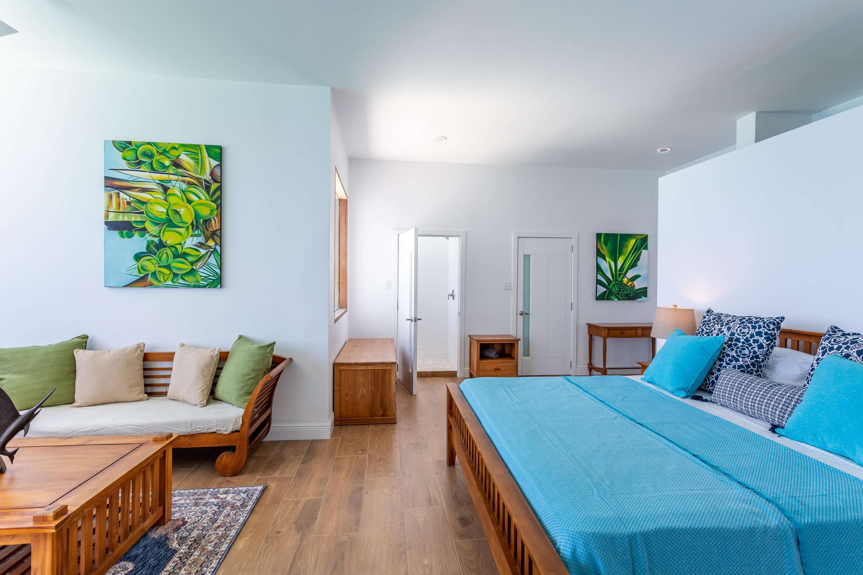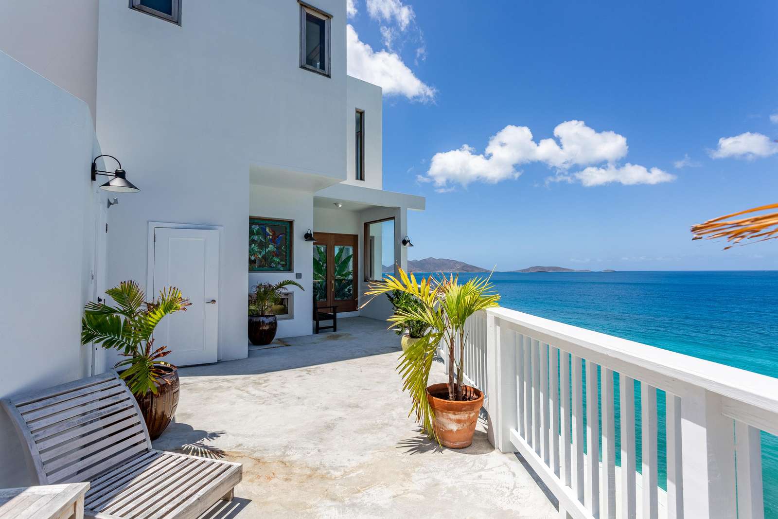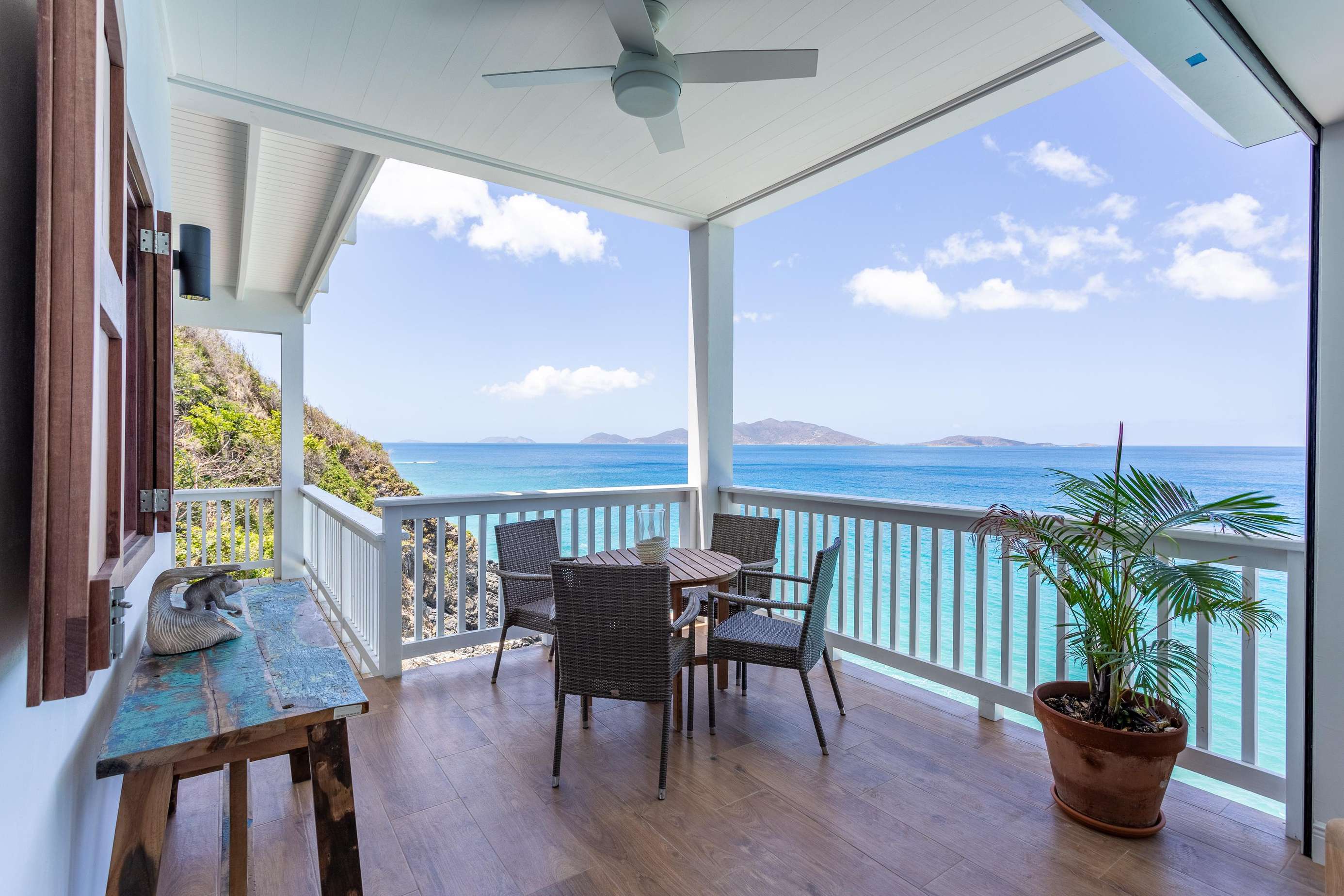 Formerly a private home known as Falling Down House, the property has been completely rebuilt since hurricane Irma blew it away in 2017. While similar to the previous layout, the new contemporary silhouette is built in concrete to a slightly larger footprint, with elevated ceilings and additional rooms and porches. The sleek white minimalist interior of the main house is furnished with simple teak Balinese furniture creating the perfect backdrop for the views, which are showcased from everywhere on the property by immense windows.