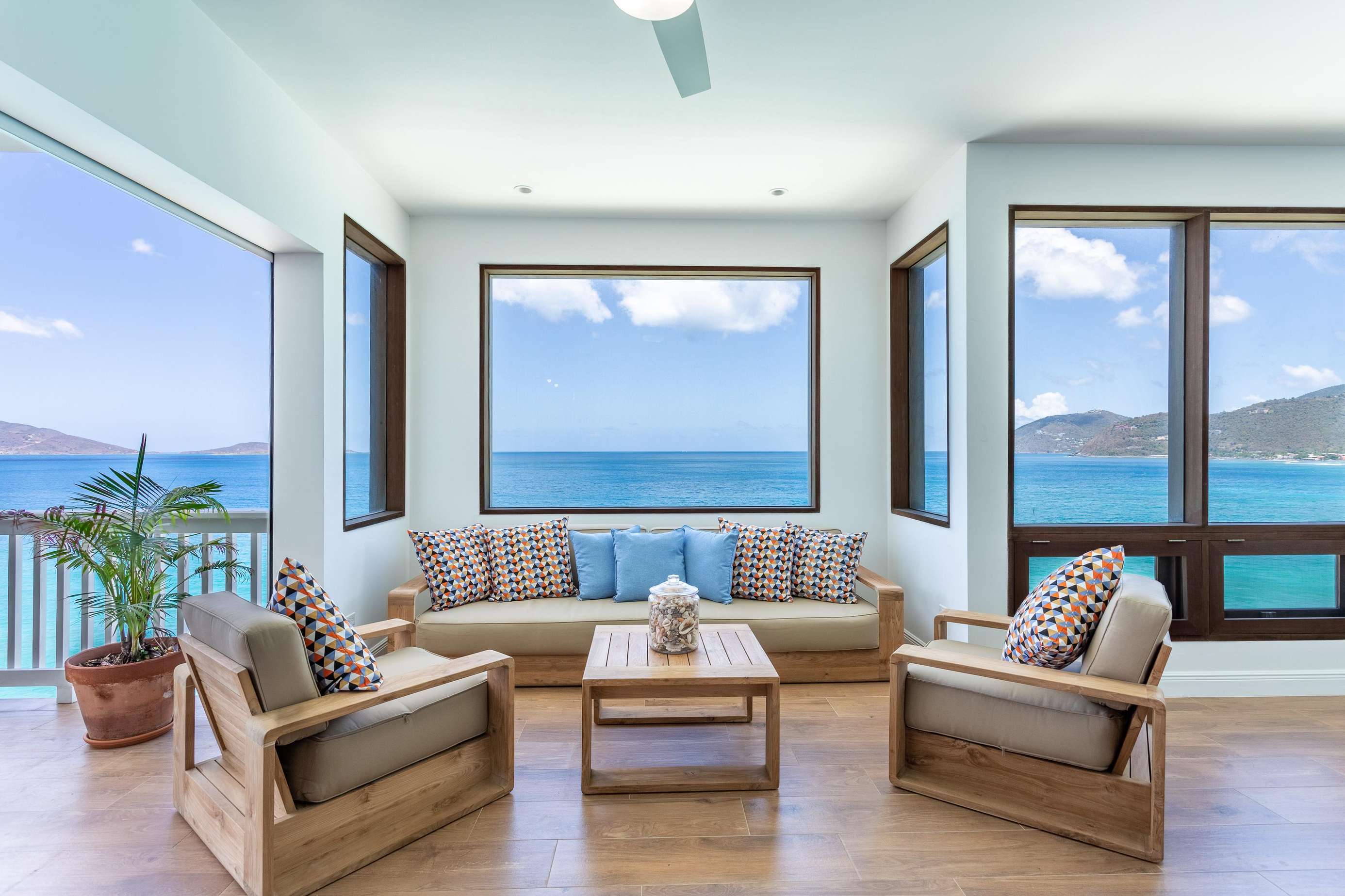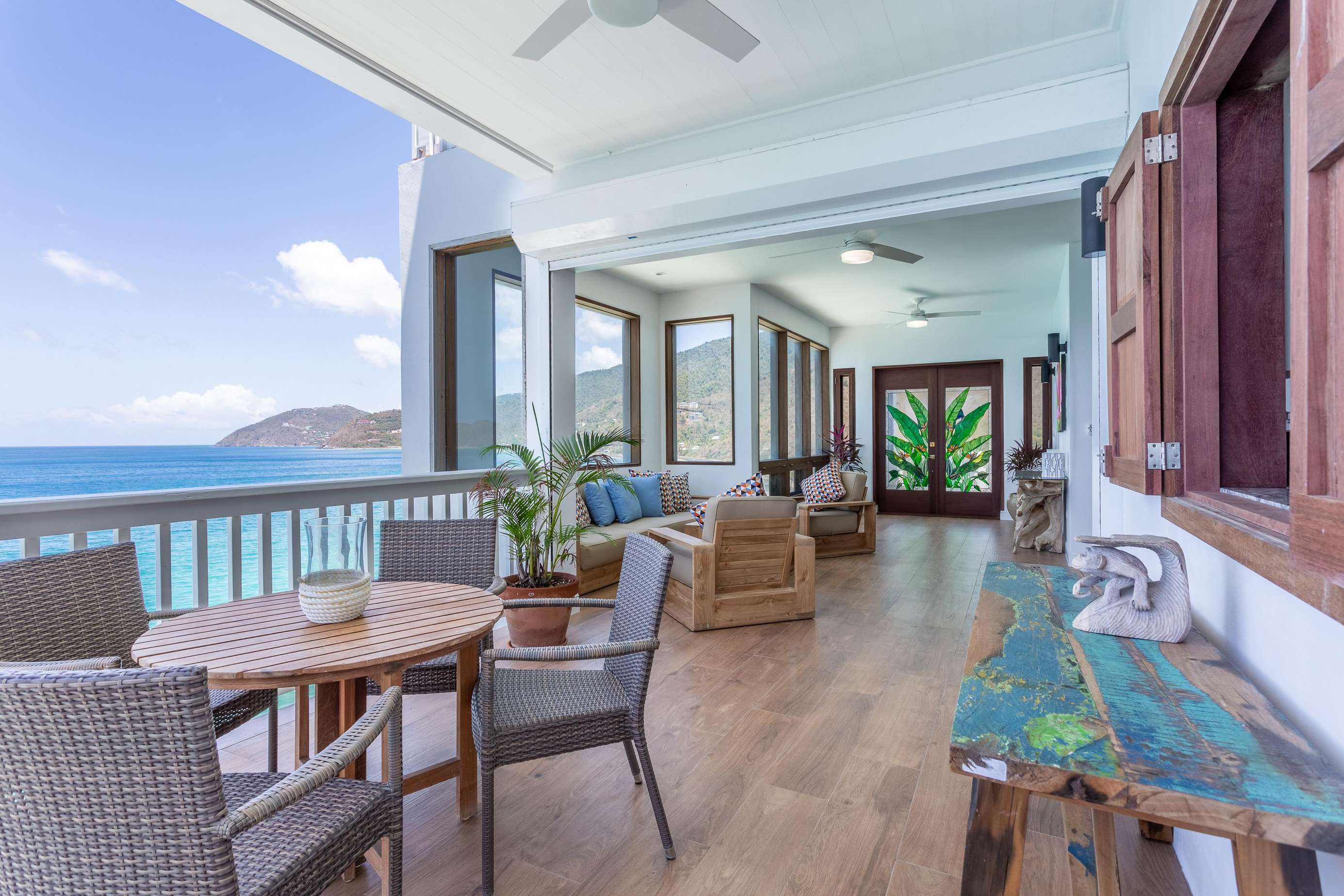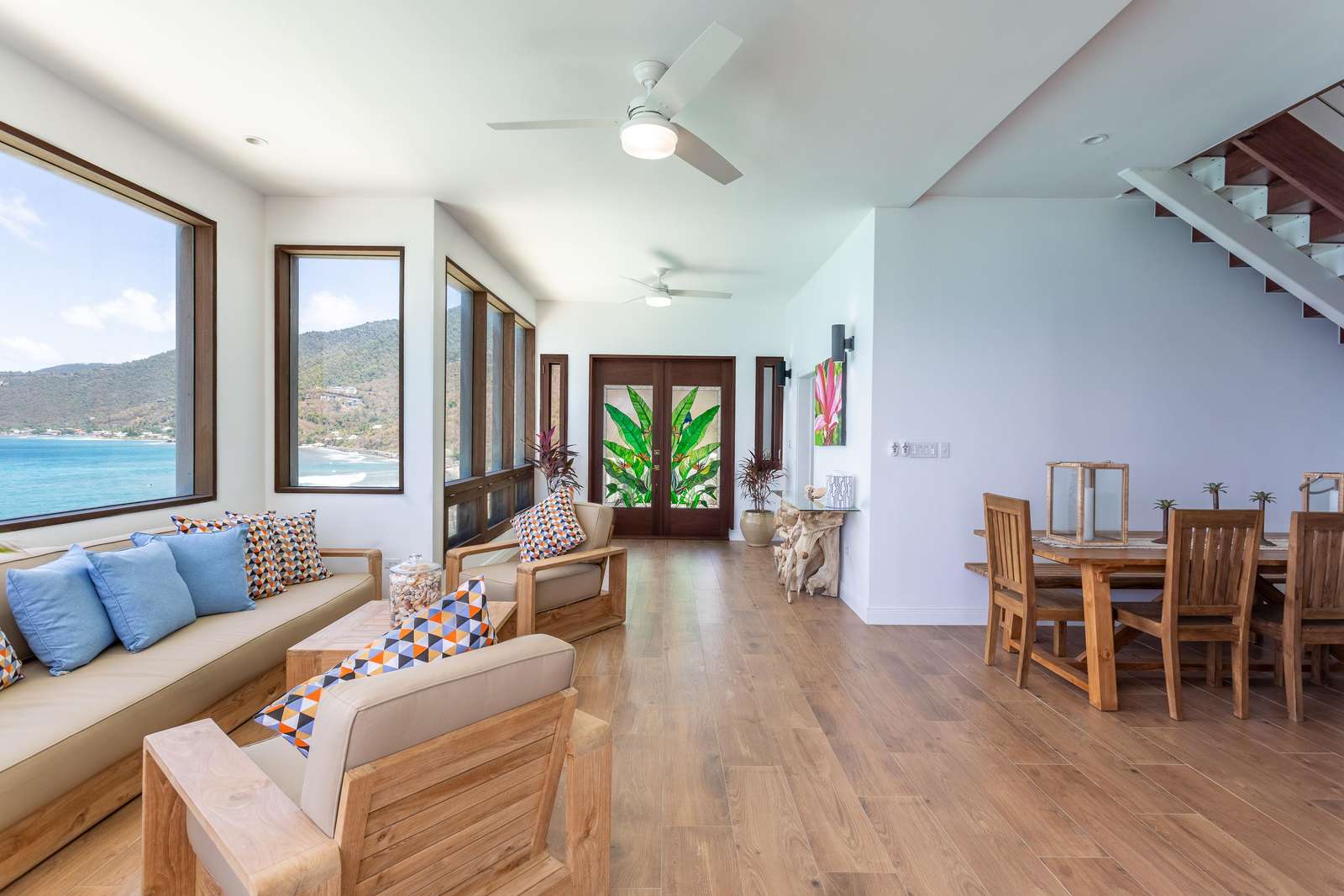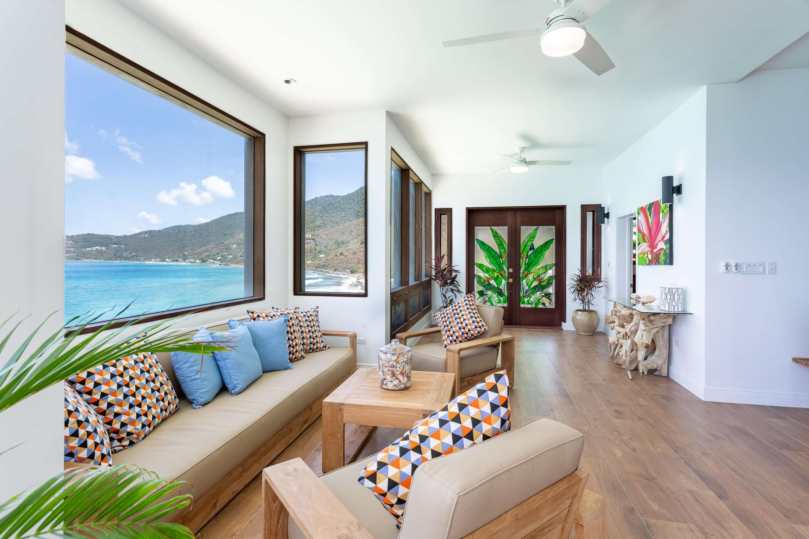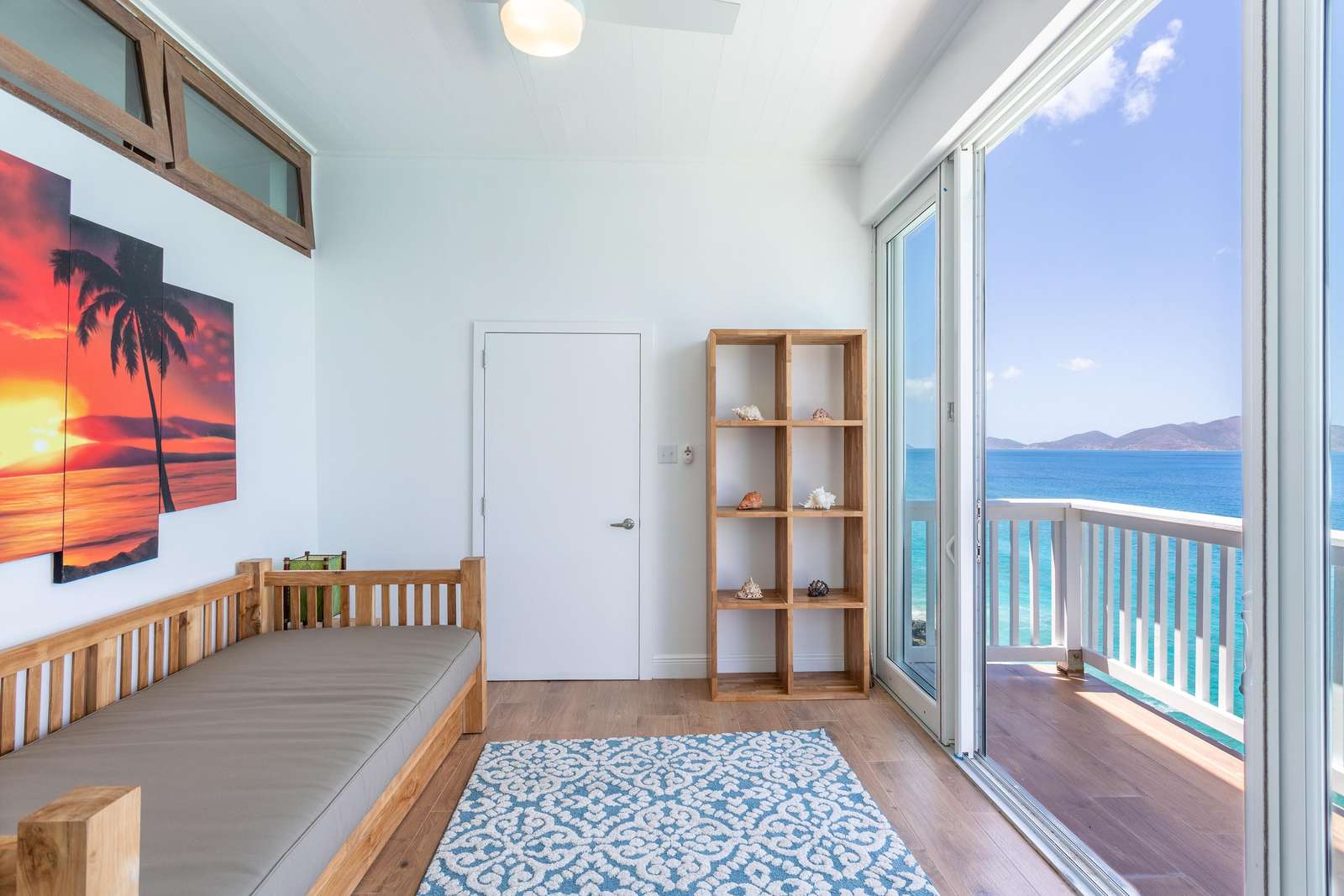 Formerly a private home known as Falling Down House, the property has been completely rebuilt since hurricane Irma blew it away in 2017. While similar to the previous layout, the new contemporary silhouette is built in concrete to a slightly larger footprint, with elevated ceilings and additional rooms and porches. The sleek white minimalist interior of the main house is furnished with simple teak Balinese furniture creating the perfect backdrop for the views, which are showcased from everywhere on the property by immense windows.
