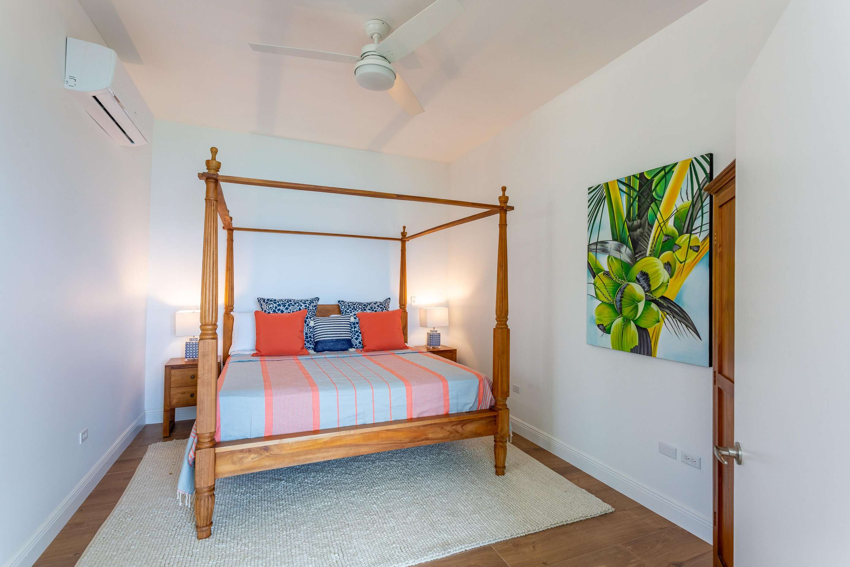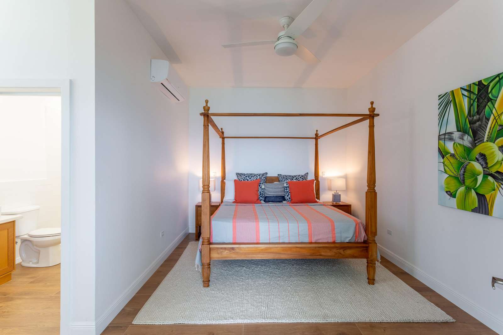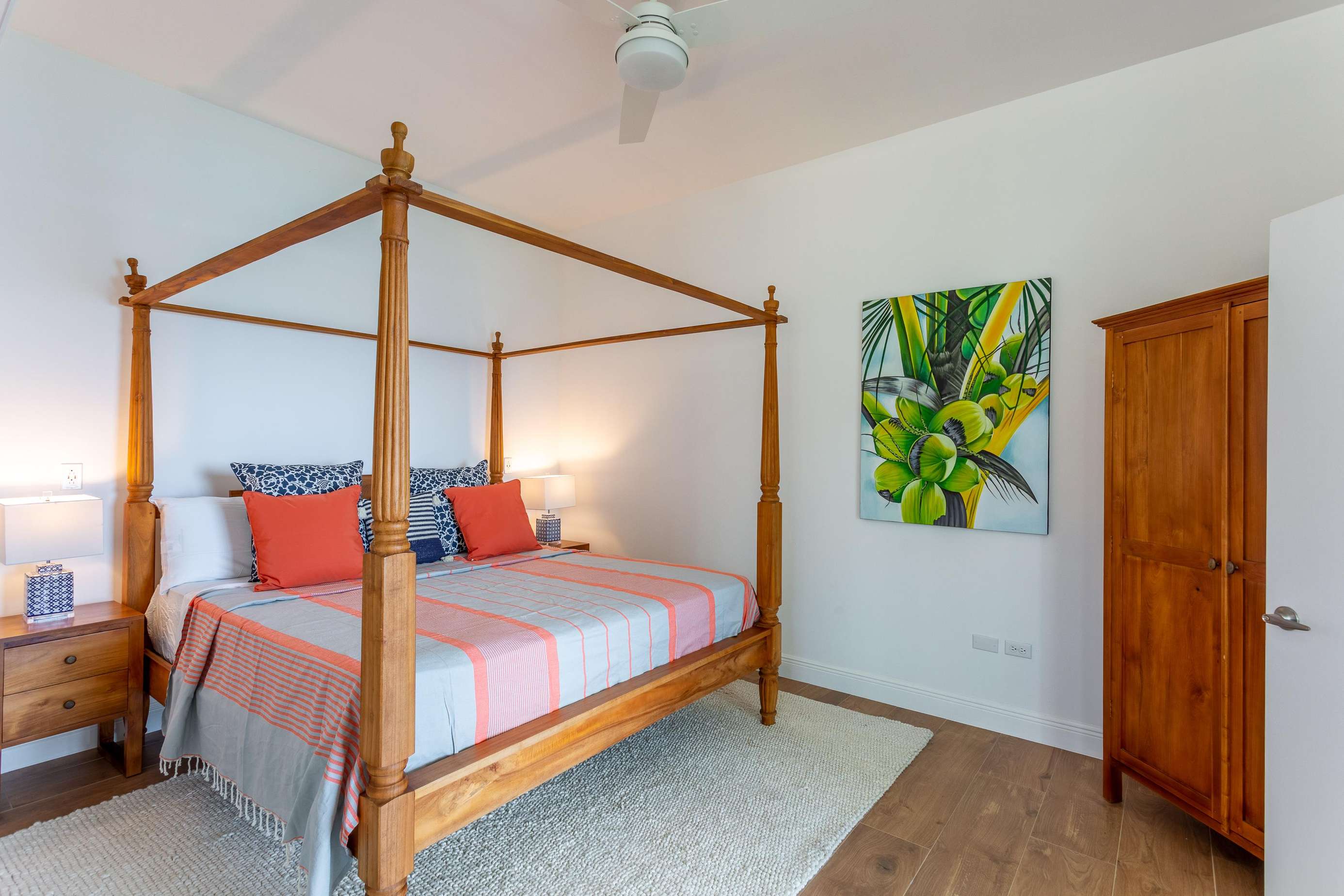 1) Immediately to the left of the entrance is the first bedroom, furnished with a teak four poster king bed and en-suite bathroom with shower. This suite is a calm, peaceful sanctuary and features a gorgeous custom stained glass window, but has no view.