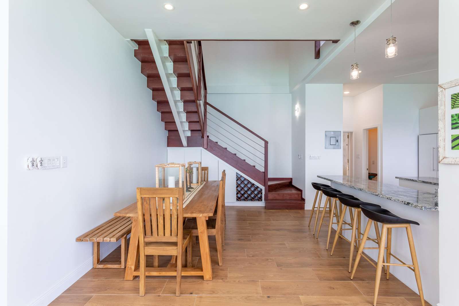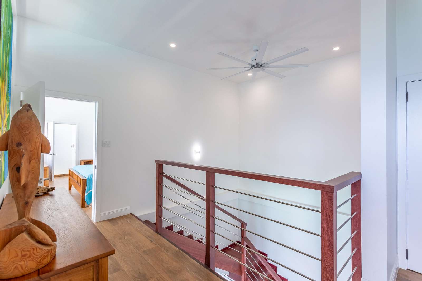 2) Dramatic custom stairs lead up to 2 further bedrooms. The primary Suite is extravagantly large with a king bed, spacious walk-in closet, en-suite bathroom and shower overlooking the ocean, as well as a comfortable seating arrangement to relax in private. There’s also a private entrance from the roadside parking area.