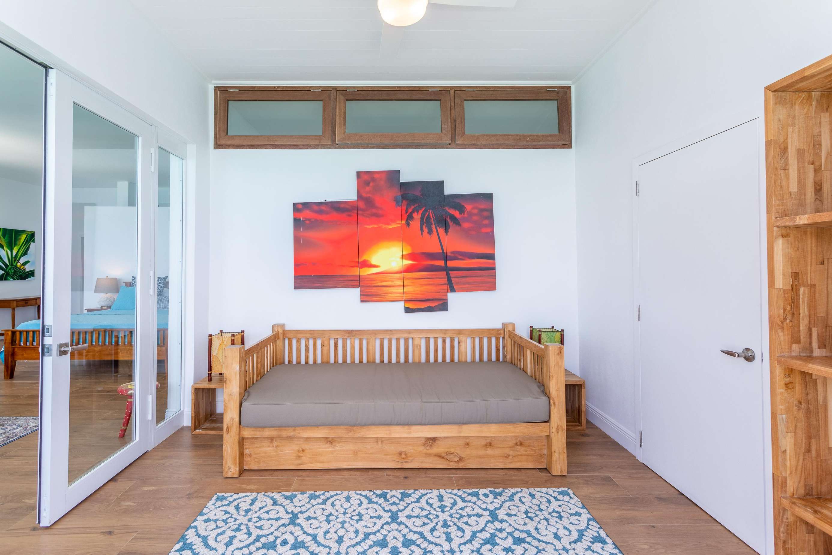 SUNROOM: Sandwiched between these two suites (and accessible through either of the suites) is a small sunroom with yet another dramatic porch that projects into the skyline. The trundle bed (2 twin beds) is ideal for guests in either suite to put their children to sleep.