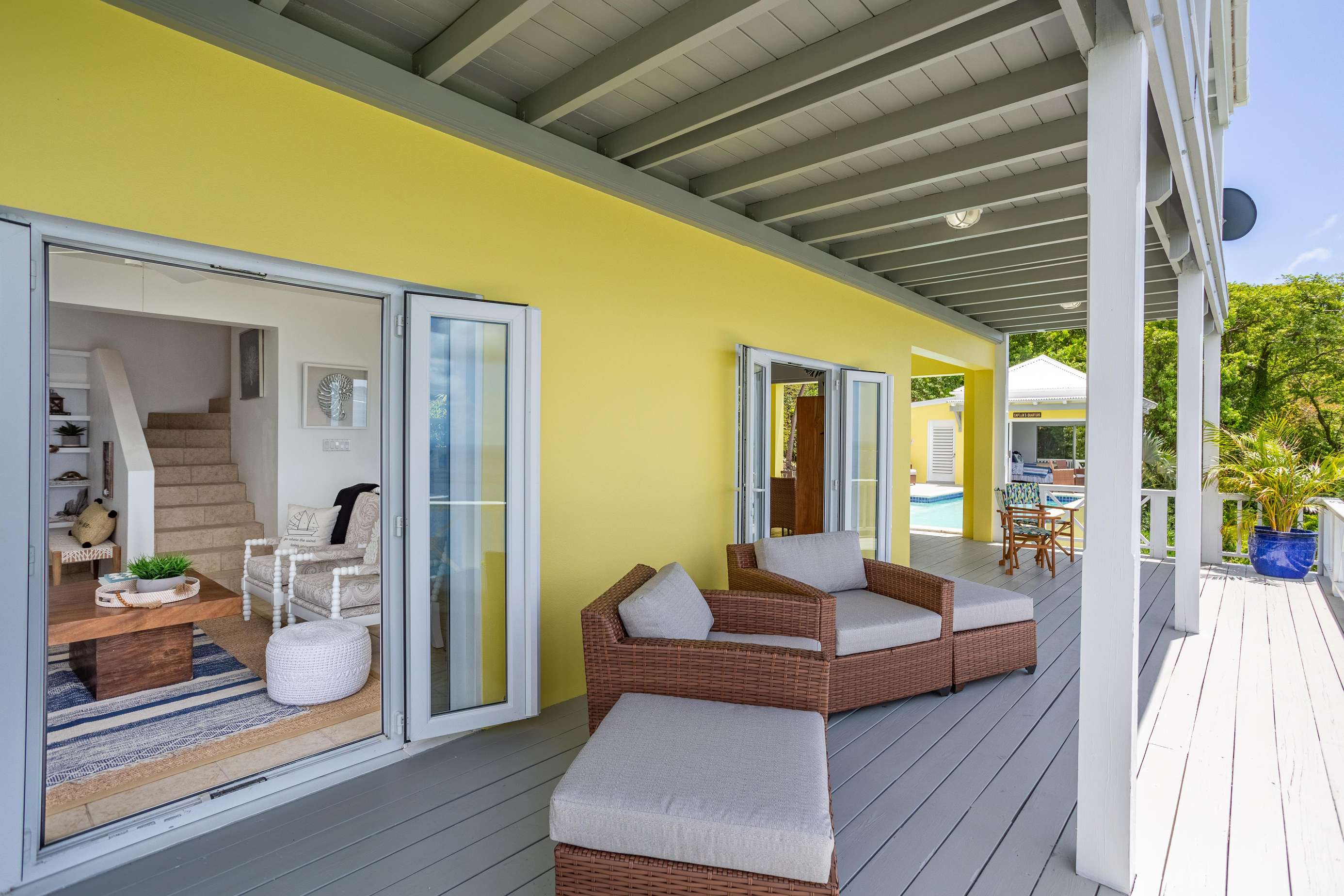 The French doors in the living room open onto a wrap around deck and create a wide-open living space with covered alfresco dining table and plenty of comfortable outdoor furniture for lounging by the pool. There’s a built-in propane BBQ for grilling up some local fish or lobster.