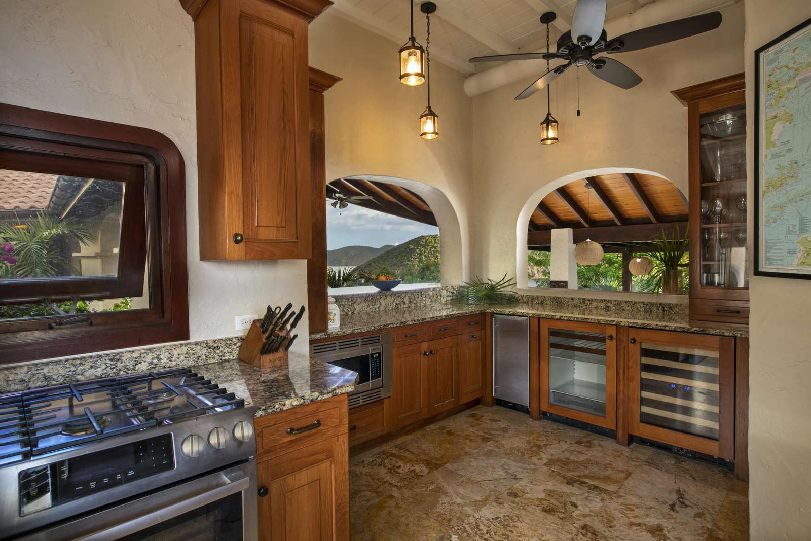 The kitchen also allows the ocean breezes in through its glassless windows & is fully equipped with top-end appliances (including BBQ Grill) for making slap-up dinners. You can enjoy the meals from a variety of places: the sociable breakfast bar which separates the lounge room from the kitchen, the picture-perfect dining area just outside the kitchen (again, covered but open on the sides, the views are particularly incredible up here), or the ridiculously romantic stone entrance courtyard.