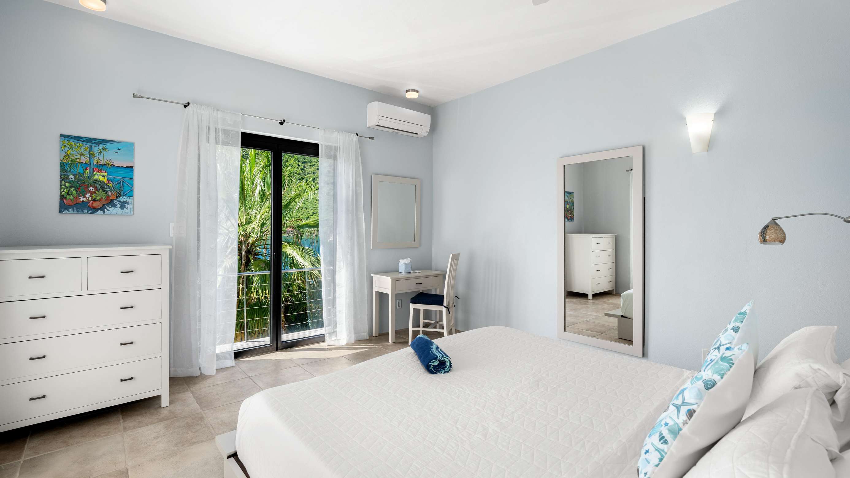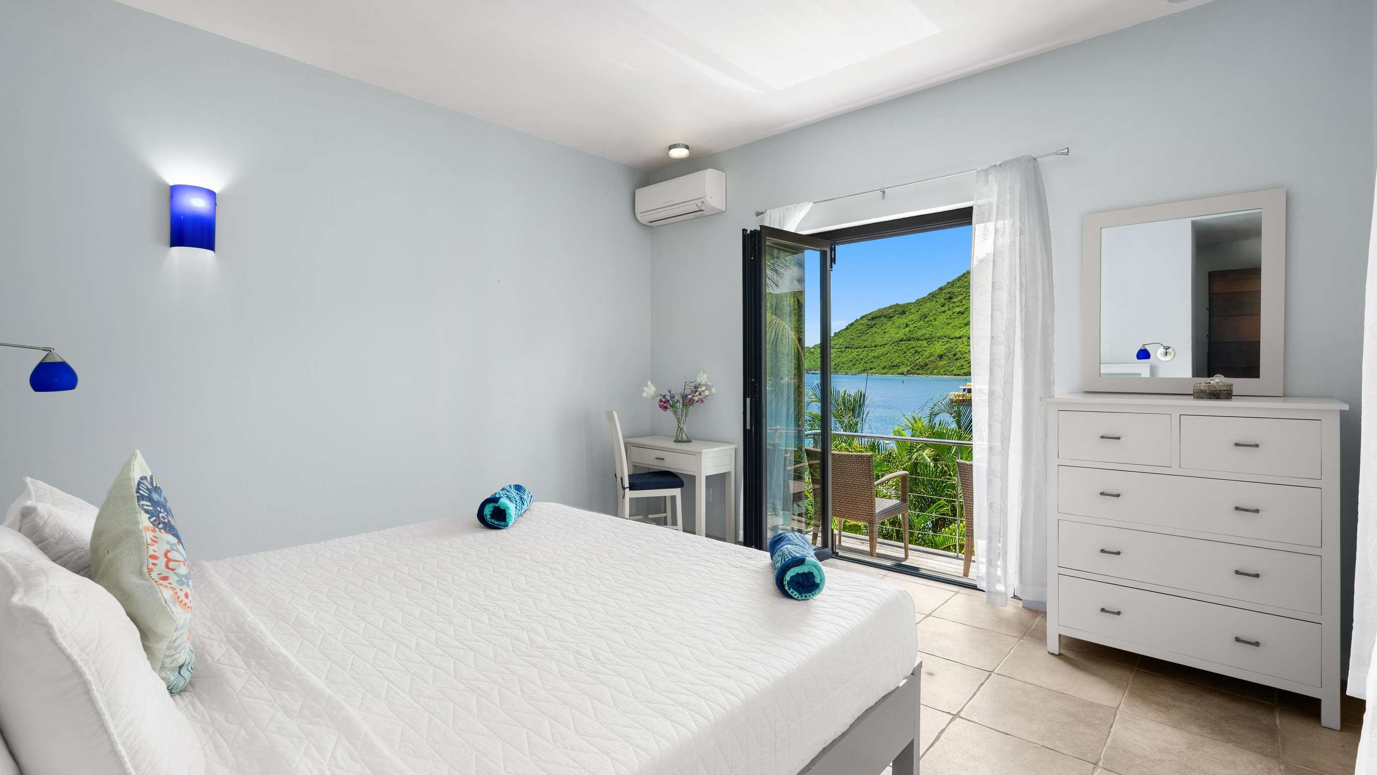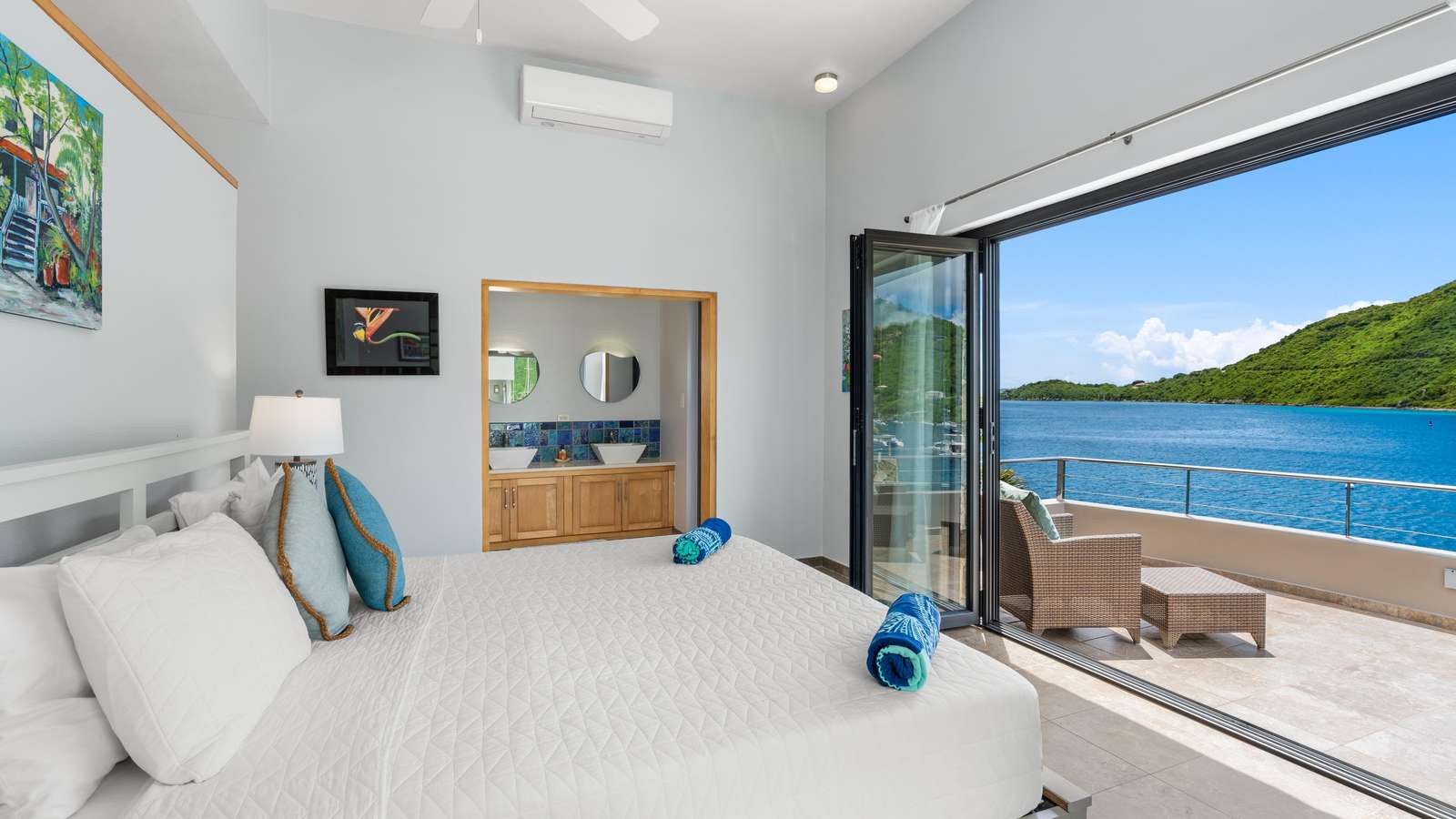 3&4) The next two bedrooms are on the bottom floor (beneath the pool terrace). You’ll of course have sweeping ocean views from both and comfy air conditioned rooms & private bathrooms with double sinks & walk in showers. You can enjoy peaceful moments on your private balconies and both even have their own comfy living rooms. These two bedrooms are also special because being on the bottom floor means direct access to the boat dock & private beach area – what more could you want!