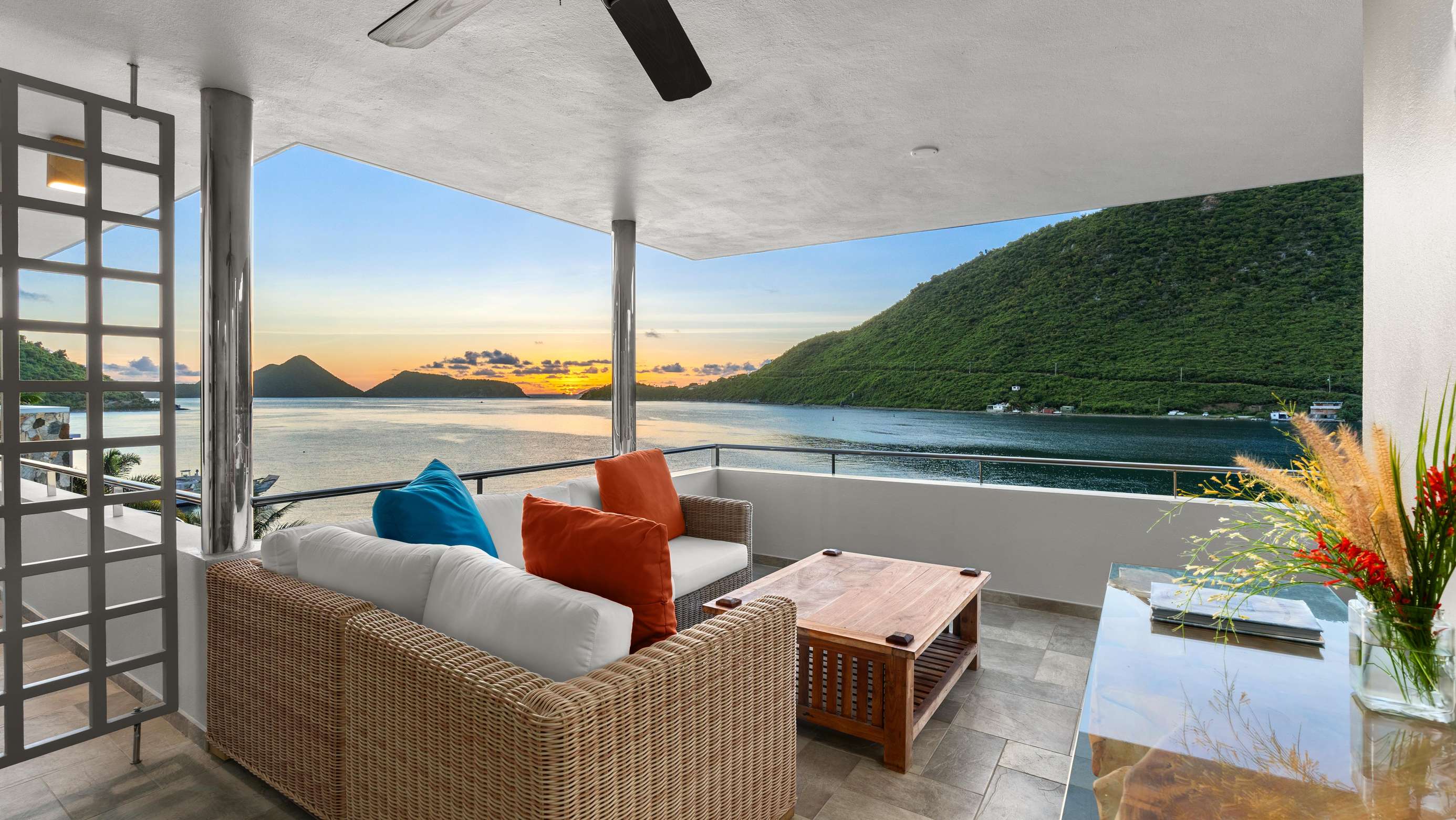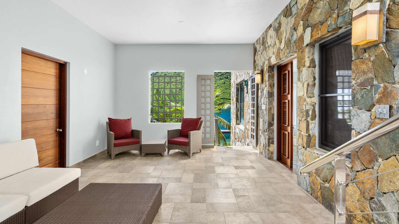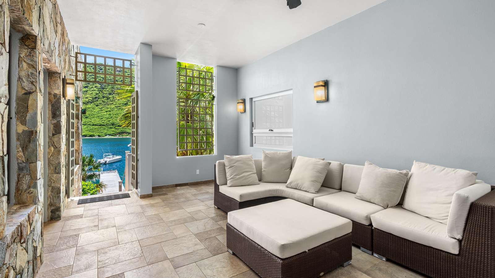 3&4) The next two bedrooms are on the bottom floor (beneath the pool terrace). You’ll of course have sweeping ocean views from both and comfy air conditioned rooms & private bathrooms with double sinks & walk in showers. You can enjoy peaceful moments on your private balconies and both even have their own comfy living rooms. These two bedrooms are also special because being on the bottom floor means direct access to the boat dock & private beach area – what more could you want!