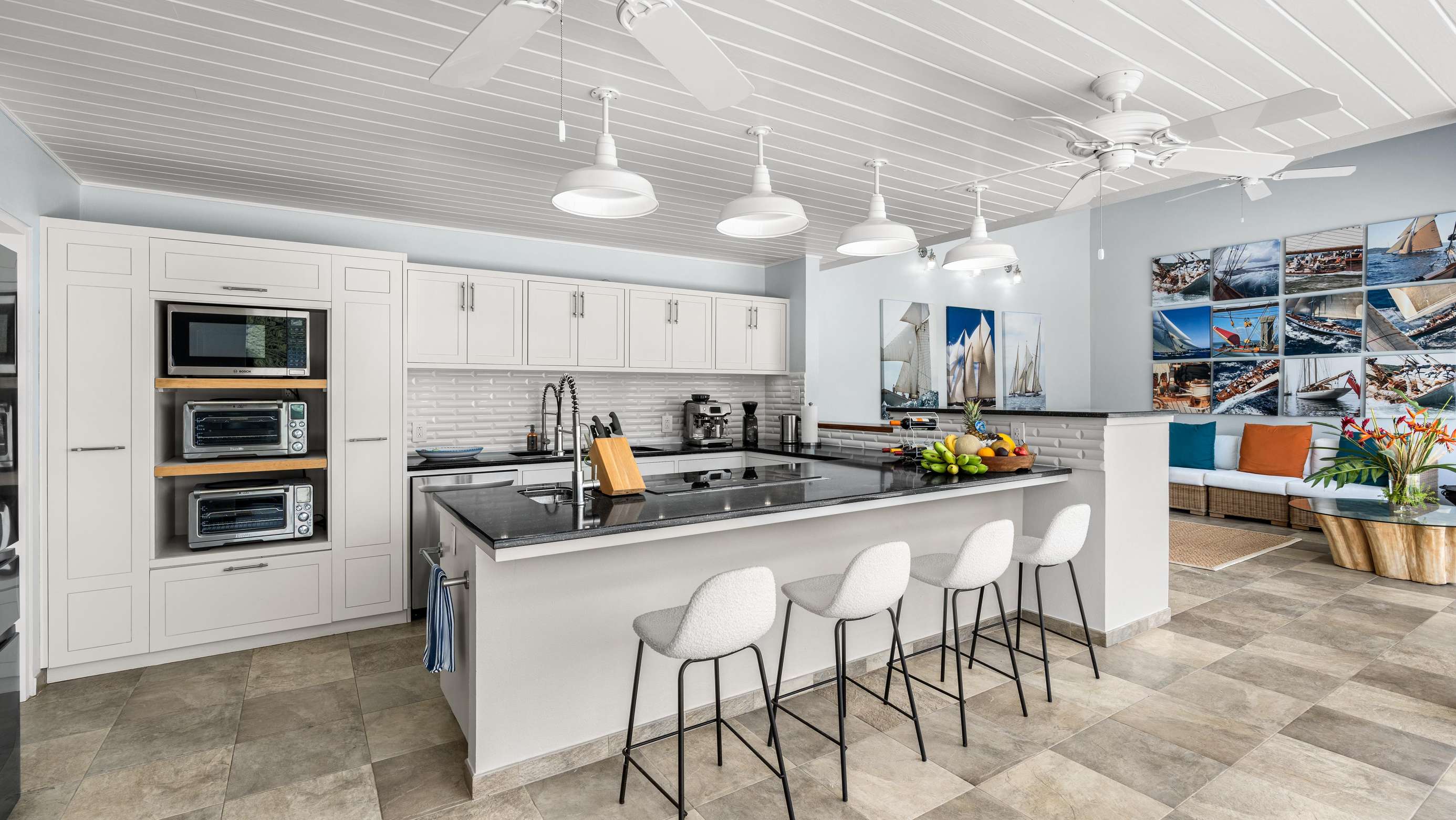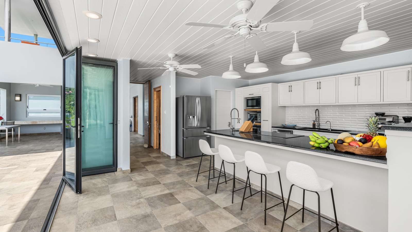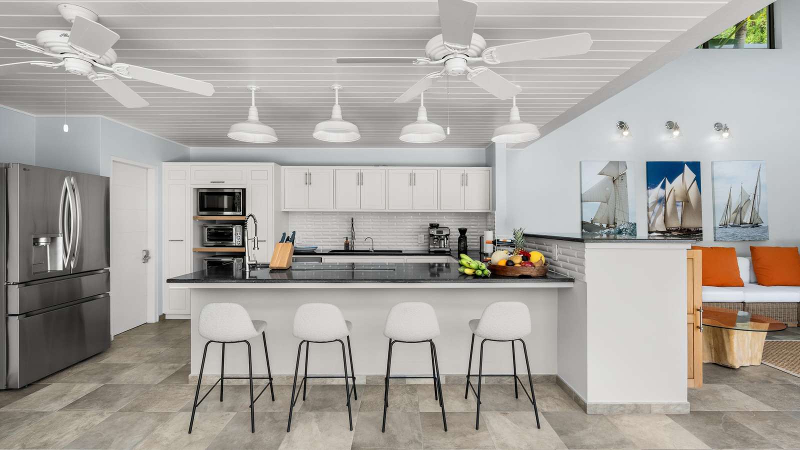 You won’t be short of places to relax in at Hawksbill House. Comfy seating areas are dotted around the property, meaning there’s a cosy nook to hide away & read a book in or enjoy a morning coffee for everyone. The main living room however sits sociably at the far end of the huge open-plan kitchen area on the middle floor. You’ll find modern Caribbean flourishes, a generous sized L shape sofa & enormous folding glass doors open one side of the room up to the incredible pool terrace & dazzling ocean views. If you can bear to look away from the glimmering sea, there’s a flat screen TV with Cable for your enjoyment.