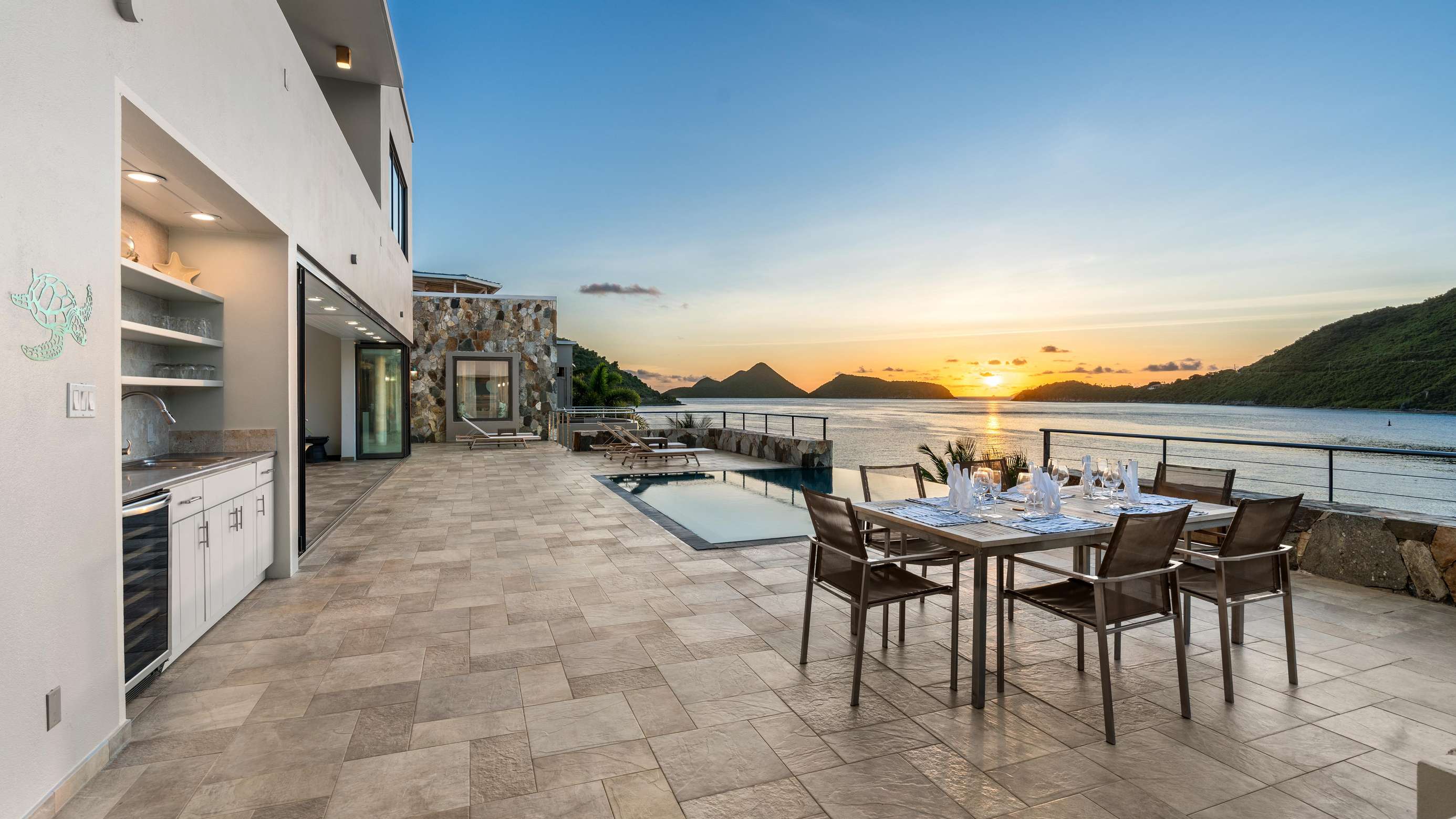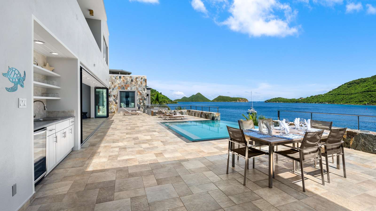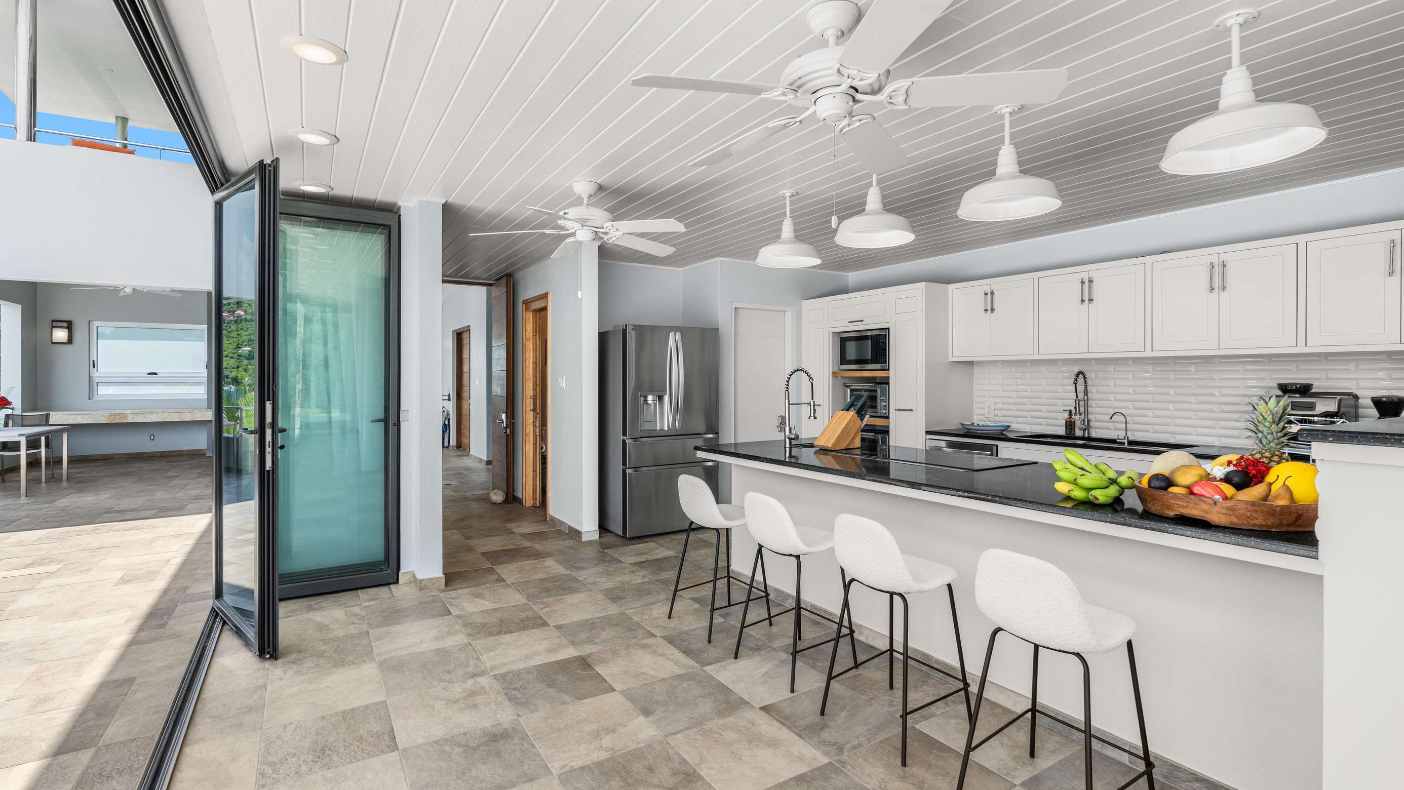 Like any great vacation villa, the outdoor spaces at Hawksbill House are just as spectacular as the indoors. An expansive pool terrace with infinity edge pool, looking as if it spills right into the ocean is surely where you’ll spend much of your day (or catching some rays on the loungers beside it). The covered alfresco dining area is a wonderful place to enjoy dinners with friends & it’s built-in gas grill, wet bar & easy access to the kitchen make entertaining smooth & simple.