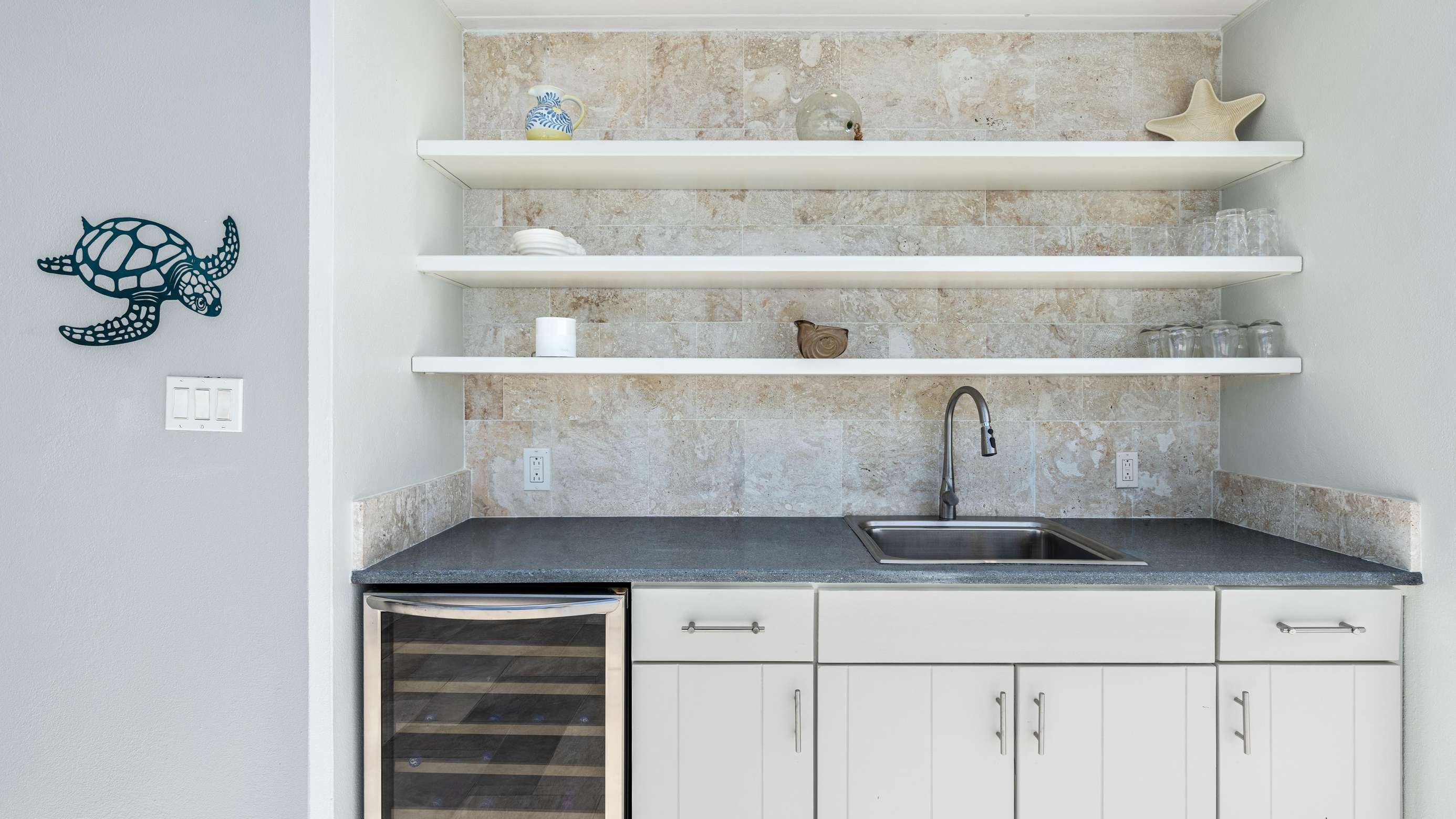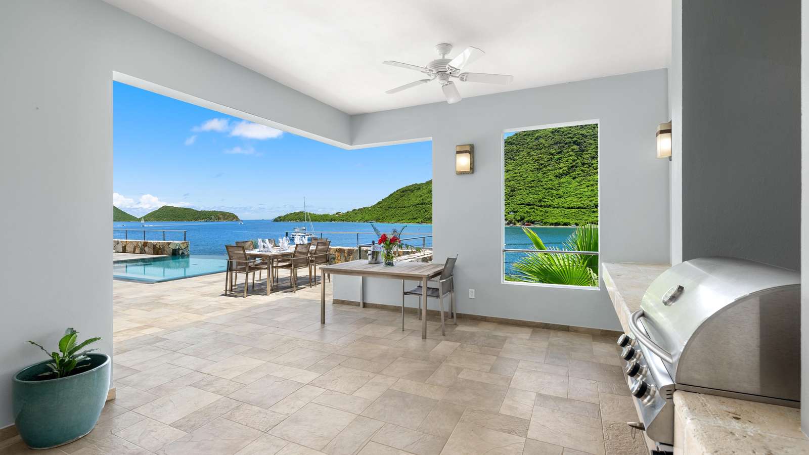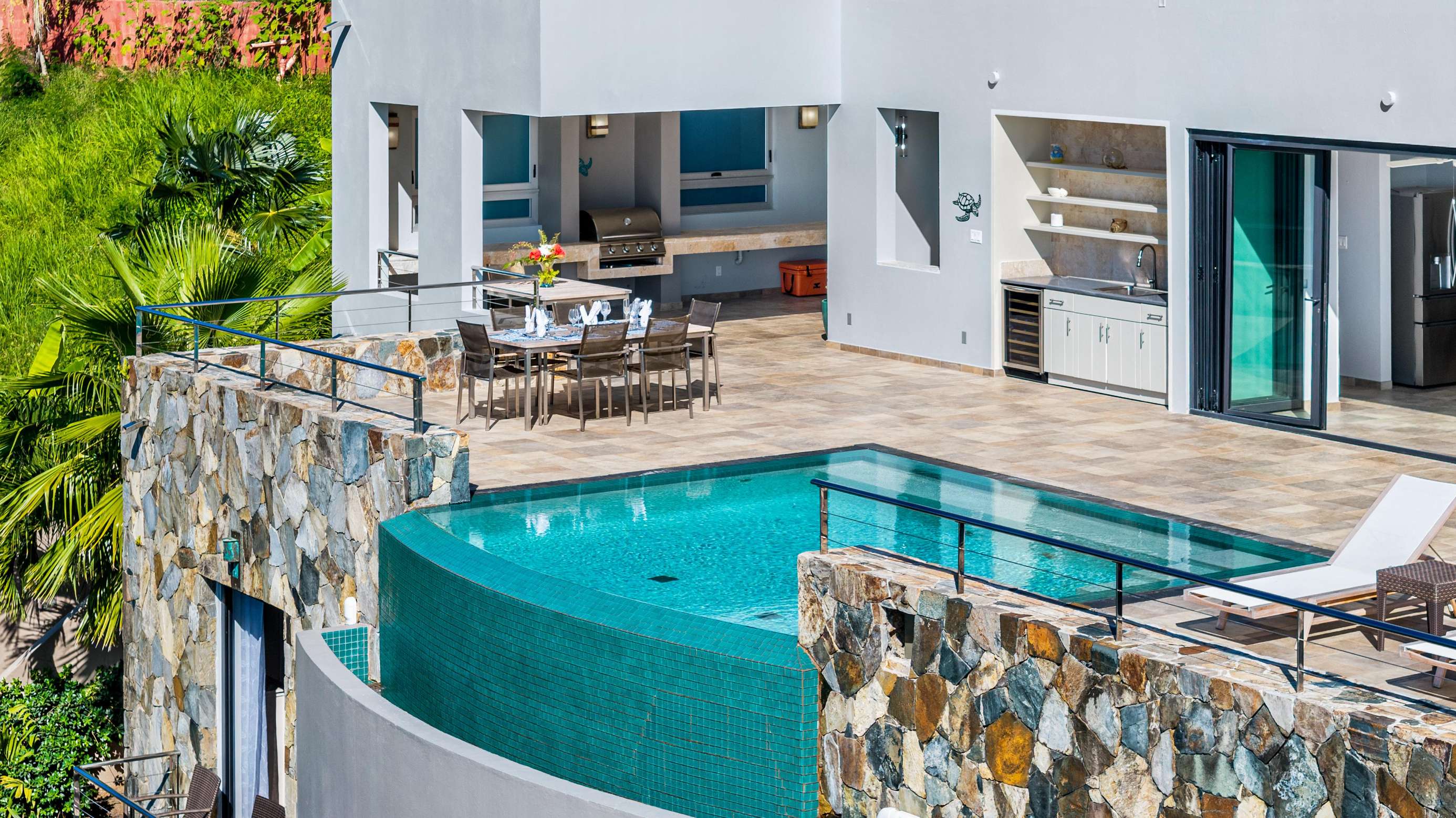 Like any great vacation villa, the outdoor spaces at Hawksbill House are just as spectacular as the indoors. An expansive pool terrace with infinity edge pool, looking as if it spills right into the ocean is surely where you’ll spend much of your day (or catching some rays on the loungers beside it). The covered alfresco dining area is a wonderful place to enjoy dinners with friends & it’s built-in gas grill, wet bar & easy access to the kitchen make entertaining smooth & simple.