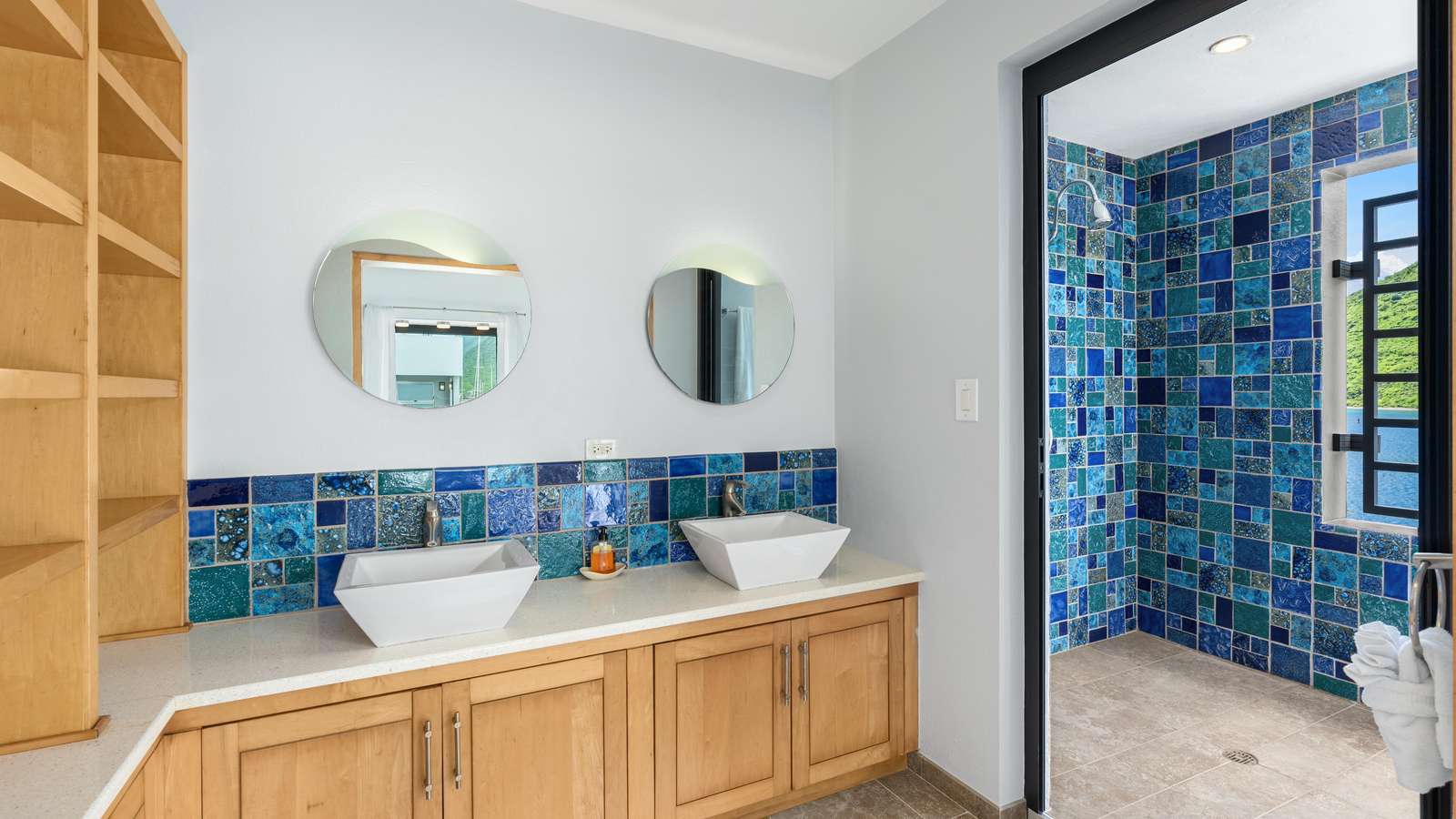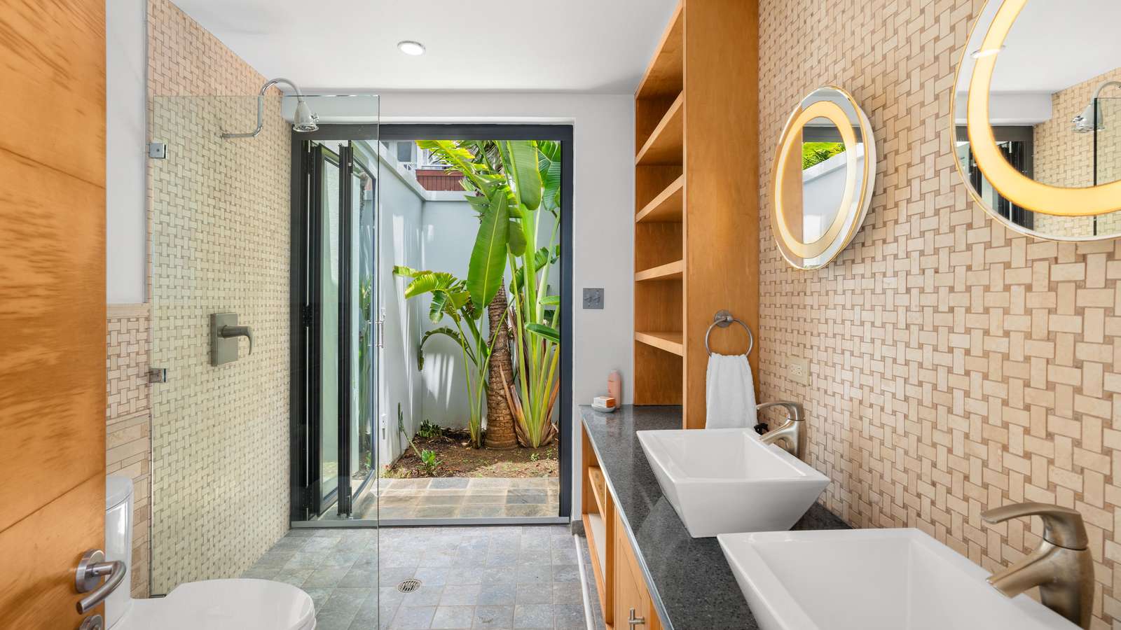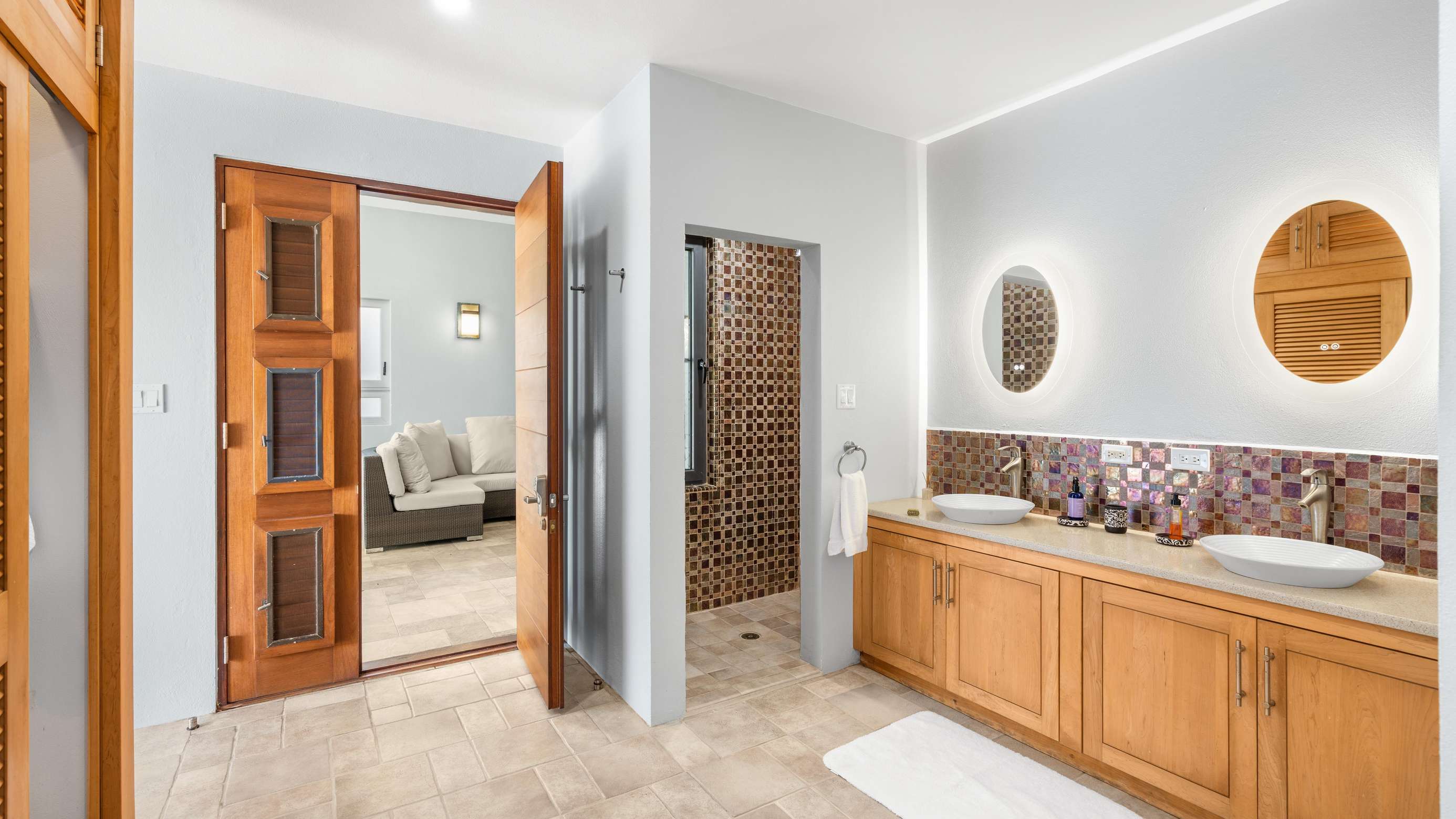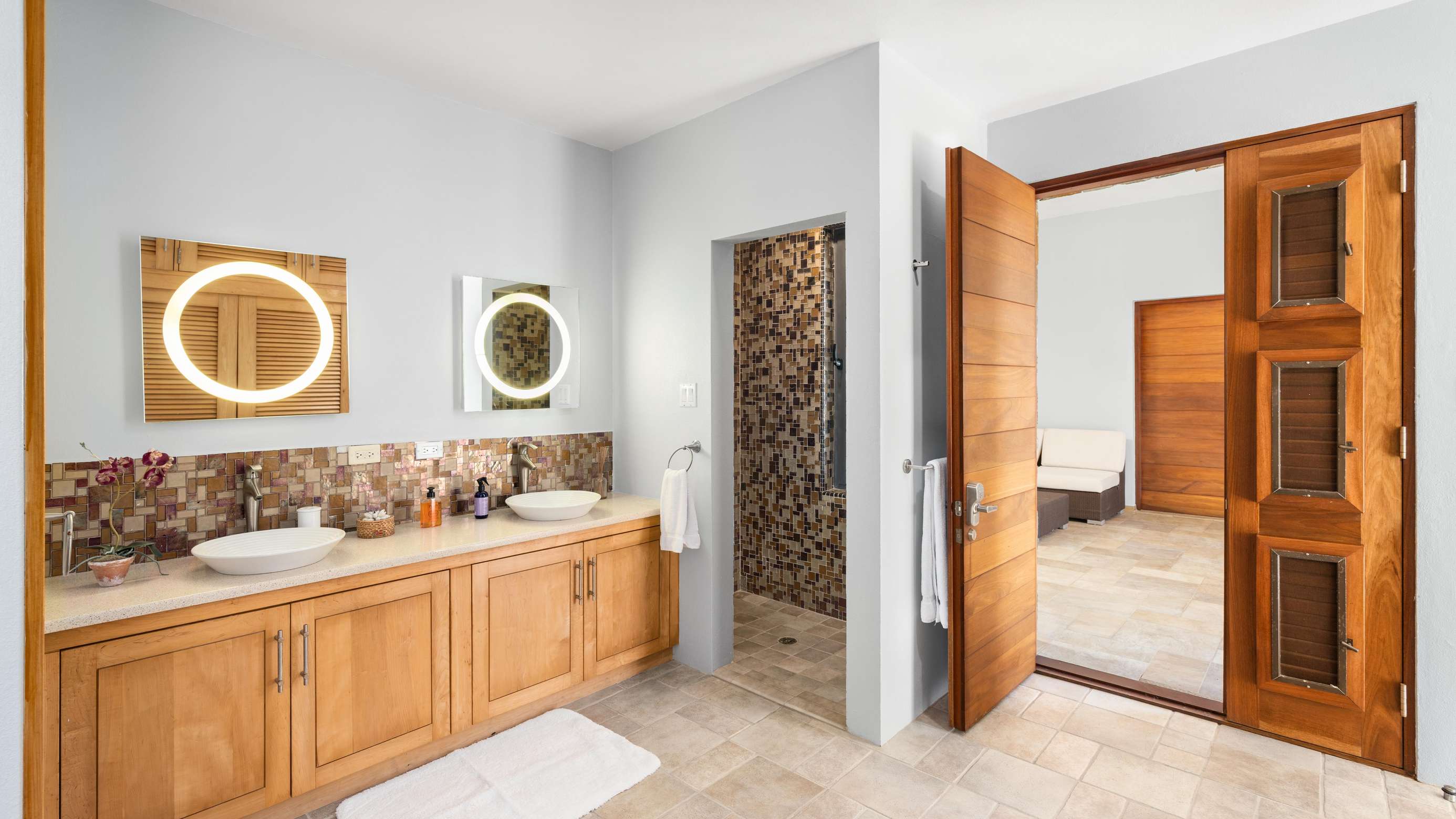 1) The first bedroom you come to is on the top floor (this is the floor on which you enter the property). Breezy & bright, this bedroom also has ocean views, AC & a private balcony at the foot of your bed. The bathroom is absolutely gorgeous with double sinks, large walk-in shower and the wonderful addition of a tropical greenery-surrounded outdoor shower. There’s also a private living room/ seating area overlooking the ocean!