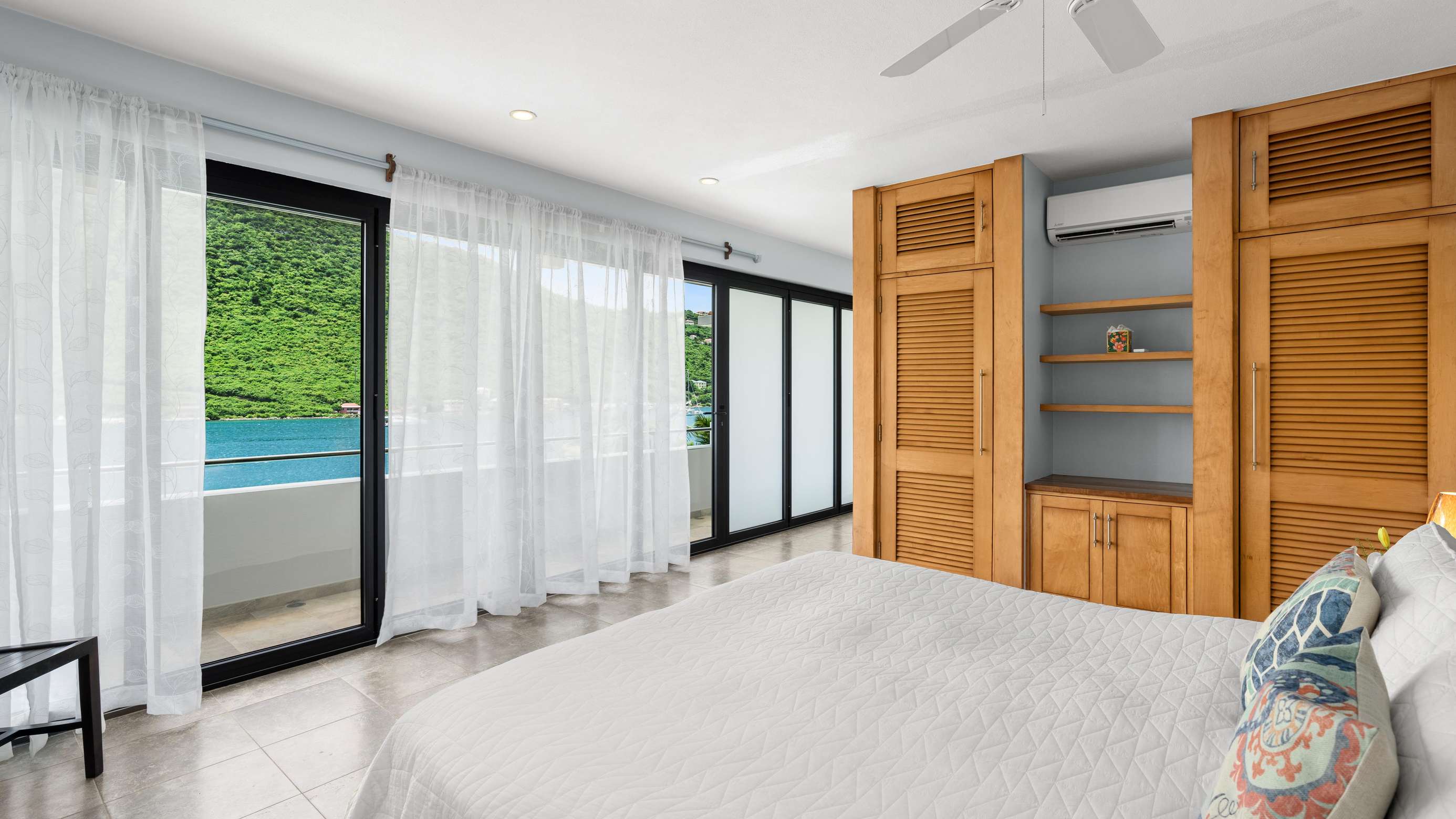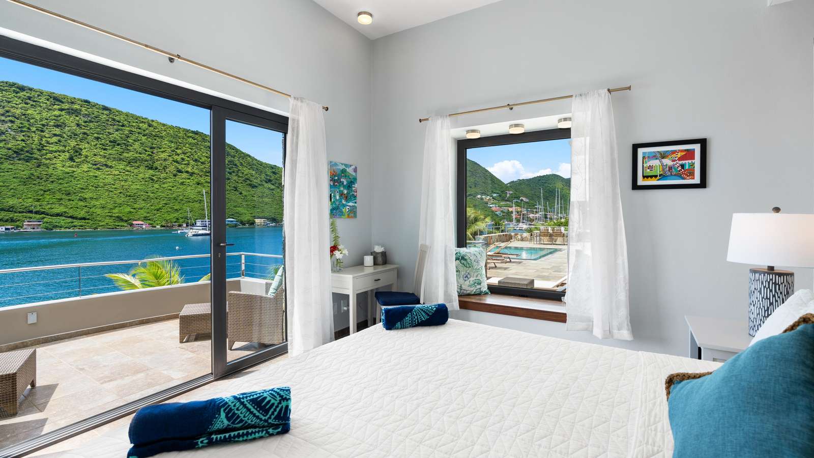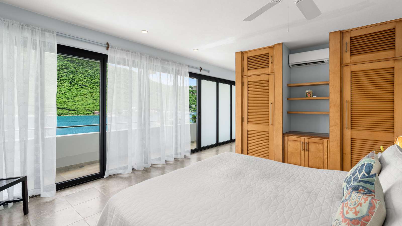 2) The Primary suite is pure bliss, located in its own private cottage on the middle floor (same floor as the kitchen/ living room & pool terrace). This calming retreat offers air conditioning & a king-sized bed that you won’t even have to get out of to get stunning ocean views. Its location on the property means you have easy access to the expansive terraces & you’ll also be able to enjoy your own private balcony. This is the perfect spot for watching the boats sail lazily into the marina with a morning coffee. The bathroom has double sinks & a window in the shower framing the azure vistas.