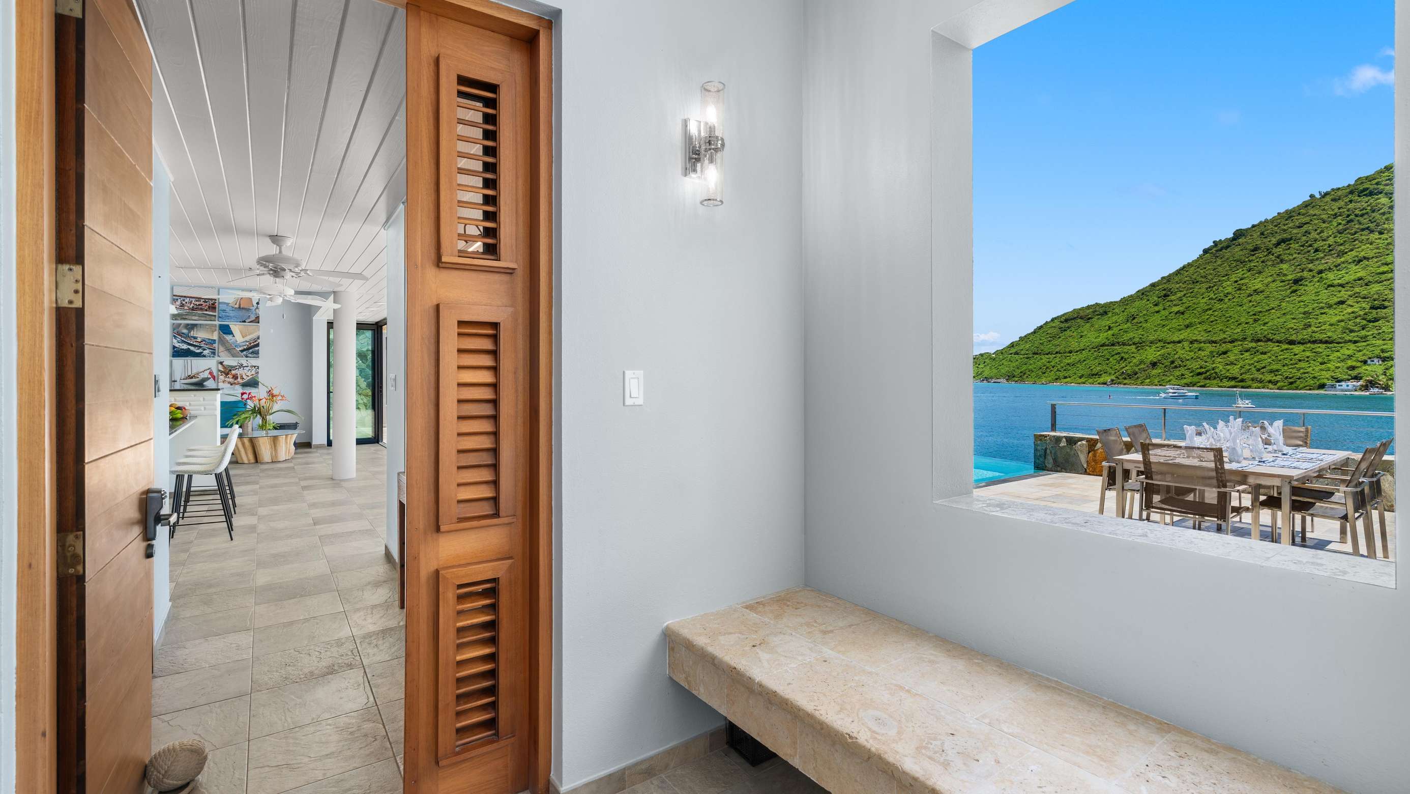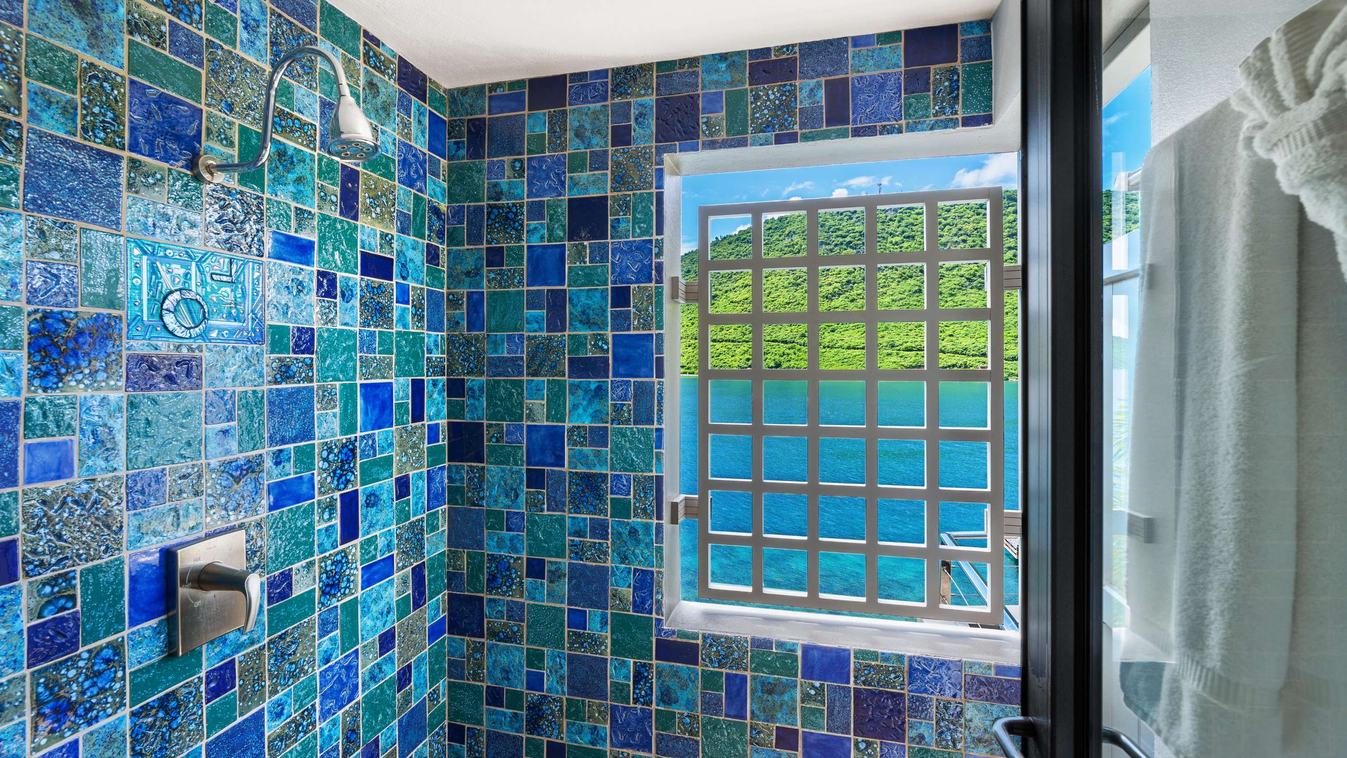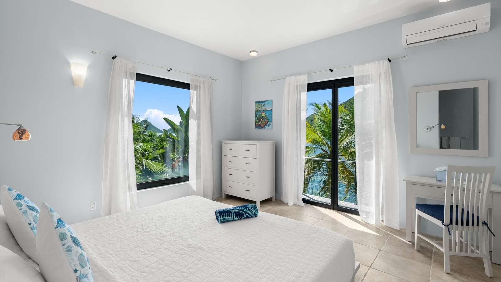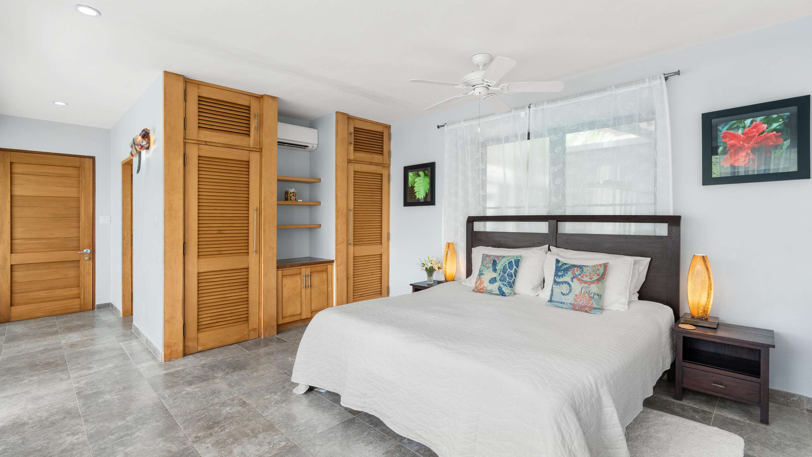 2) The Primary suite is pure bliss, located in its own private cottage on the middle floor (same floor as the kitchen/ living room & pool terrace). This calming retreat offers air conditioning & a king-sized bed that you won’t even have to get out of to get stunning ocean views. Its location on the property means you have easy access to the expansive terraces & you’ll also be able to enjoy your own private balcony. This is the perfect spot for watching the boats sail lazily into the marina with a morning coffee. The bathroom has double sinks & a window in the shower framing the azure vistas.