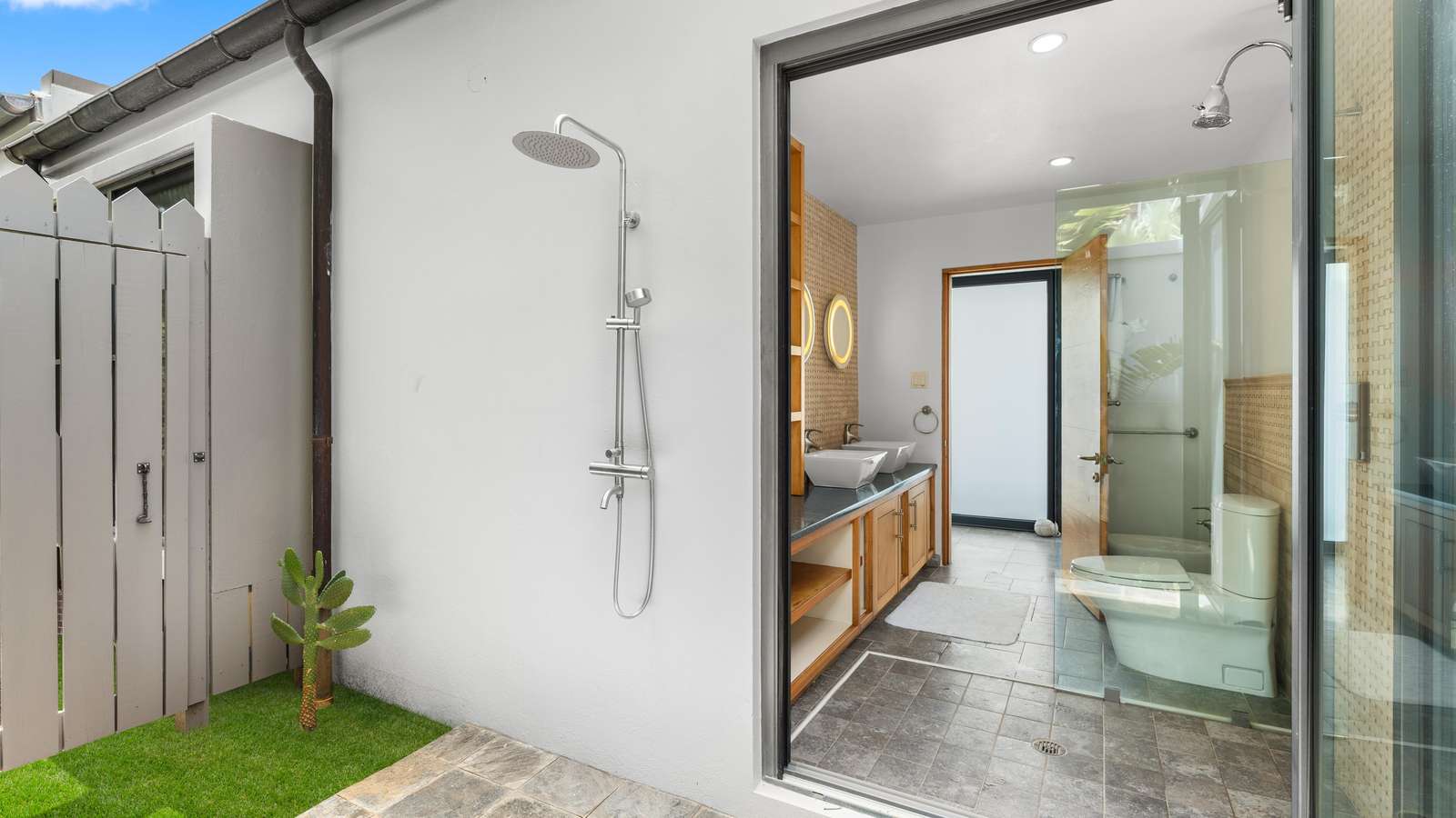 Powerful ceiling fans & gentle ocean breezes keep you cool while you cook up a storm in the fully equipped kitchen. Designed for effortless entertaining, there’s a breakfast bar for grabbing a quick bite to eat or you’re just steps away from the covered alfresco dining table. Top quality stainless steel appliances like double fridge/ freezer, Breville espresso machine & dishwasher makes catering for a group a breeze, leaving you more time to rest & recharge.