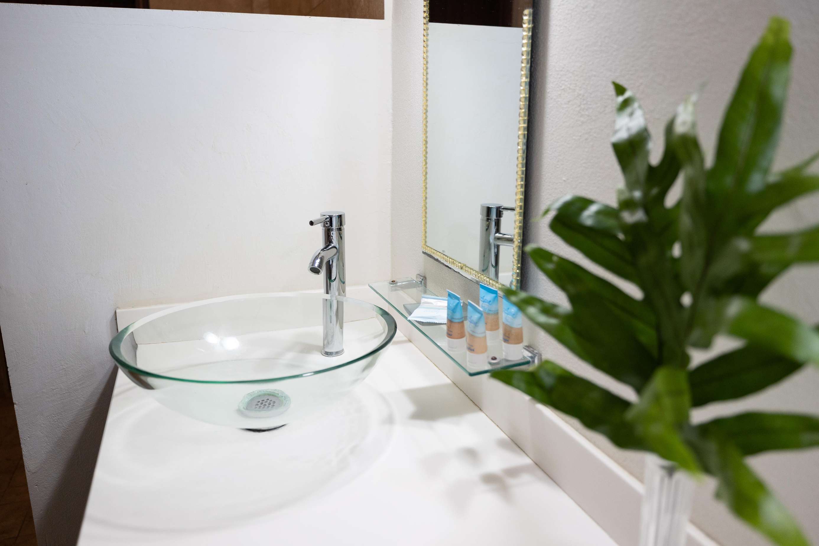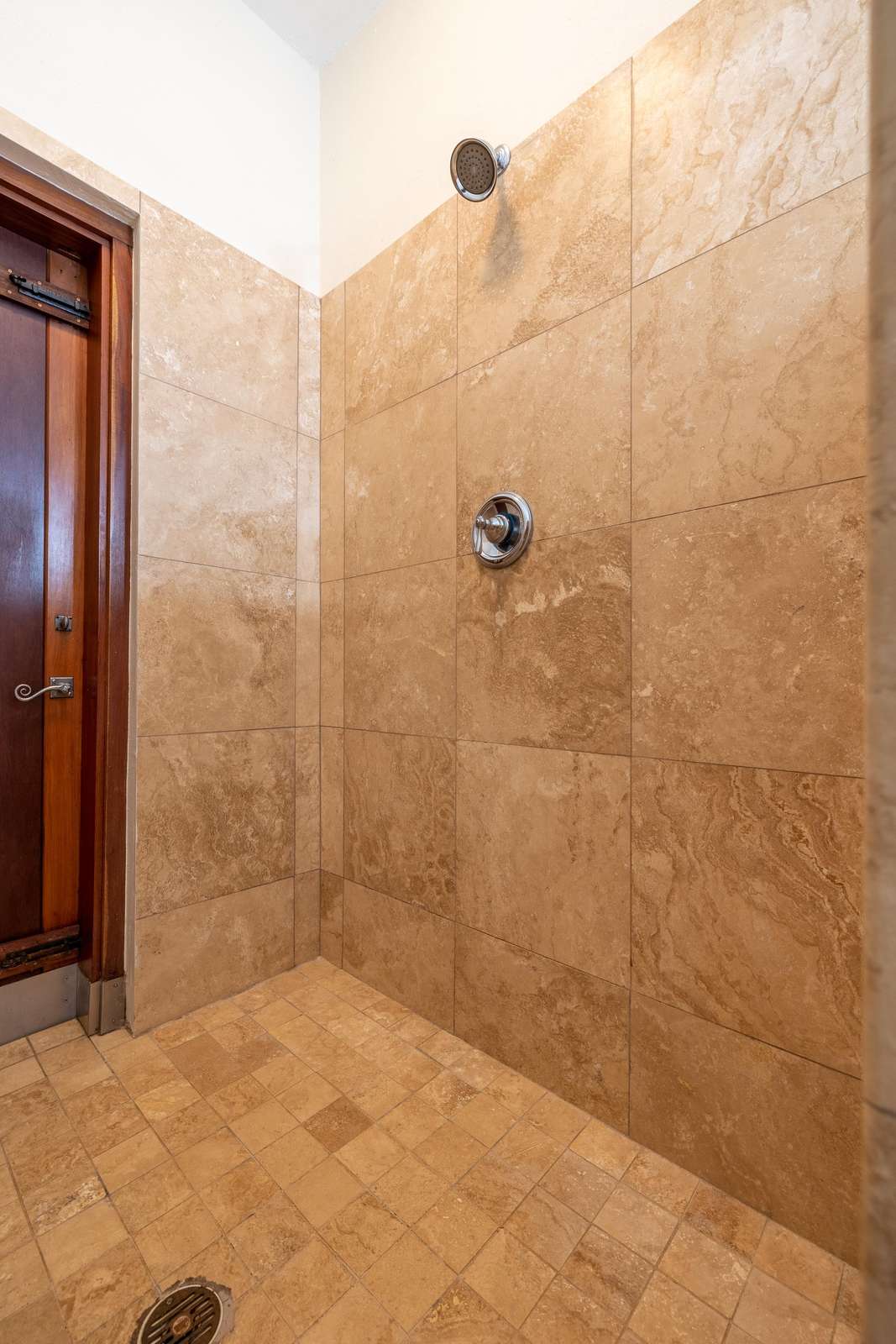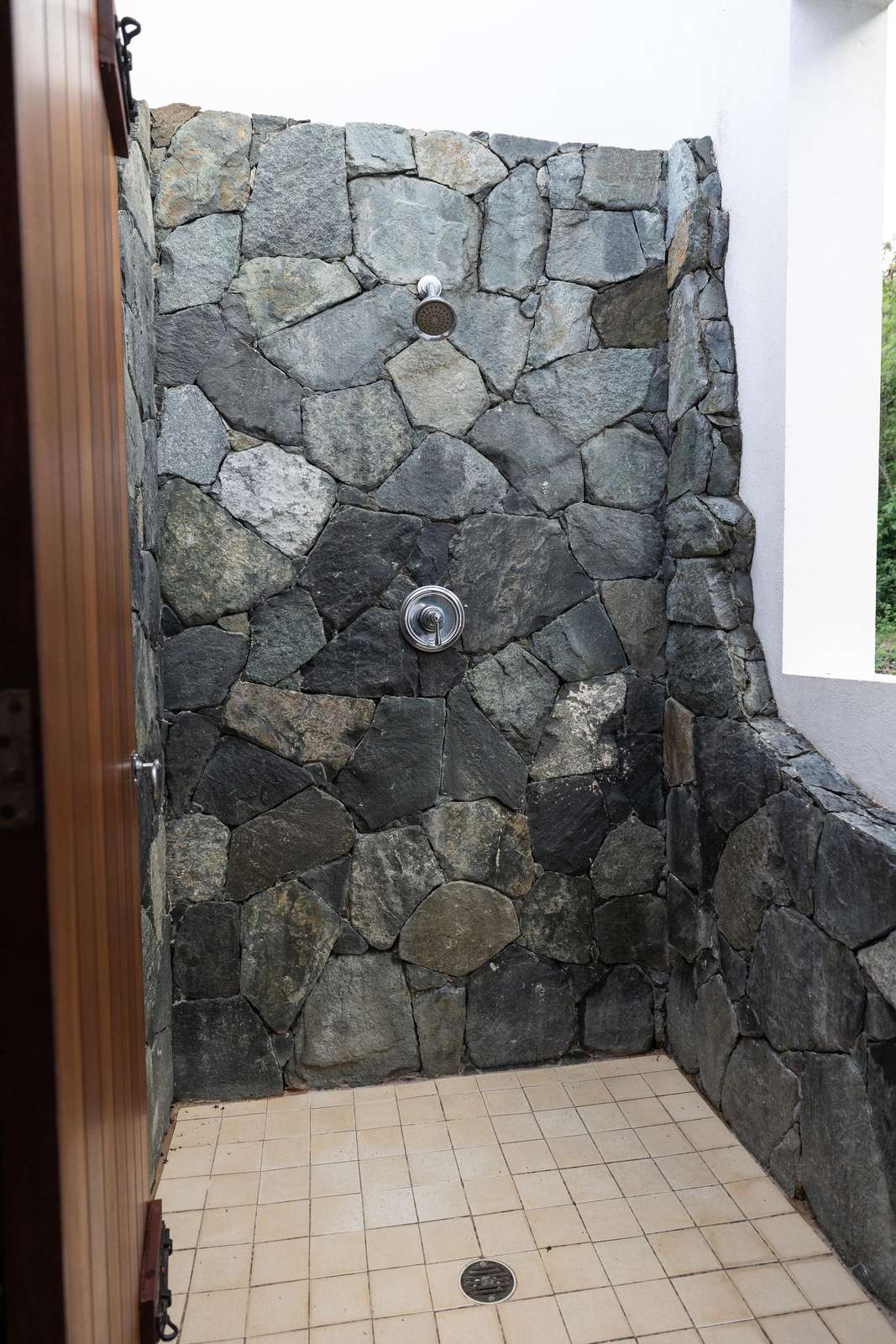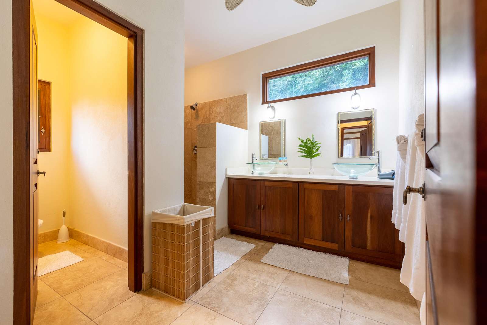 The main bathroom on the ground floor has double sinks & walk-in shower. The mezzanine floor bathroom has a stone clad outdoor shower, for washing amongst nature.