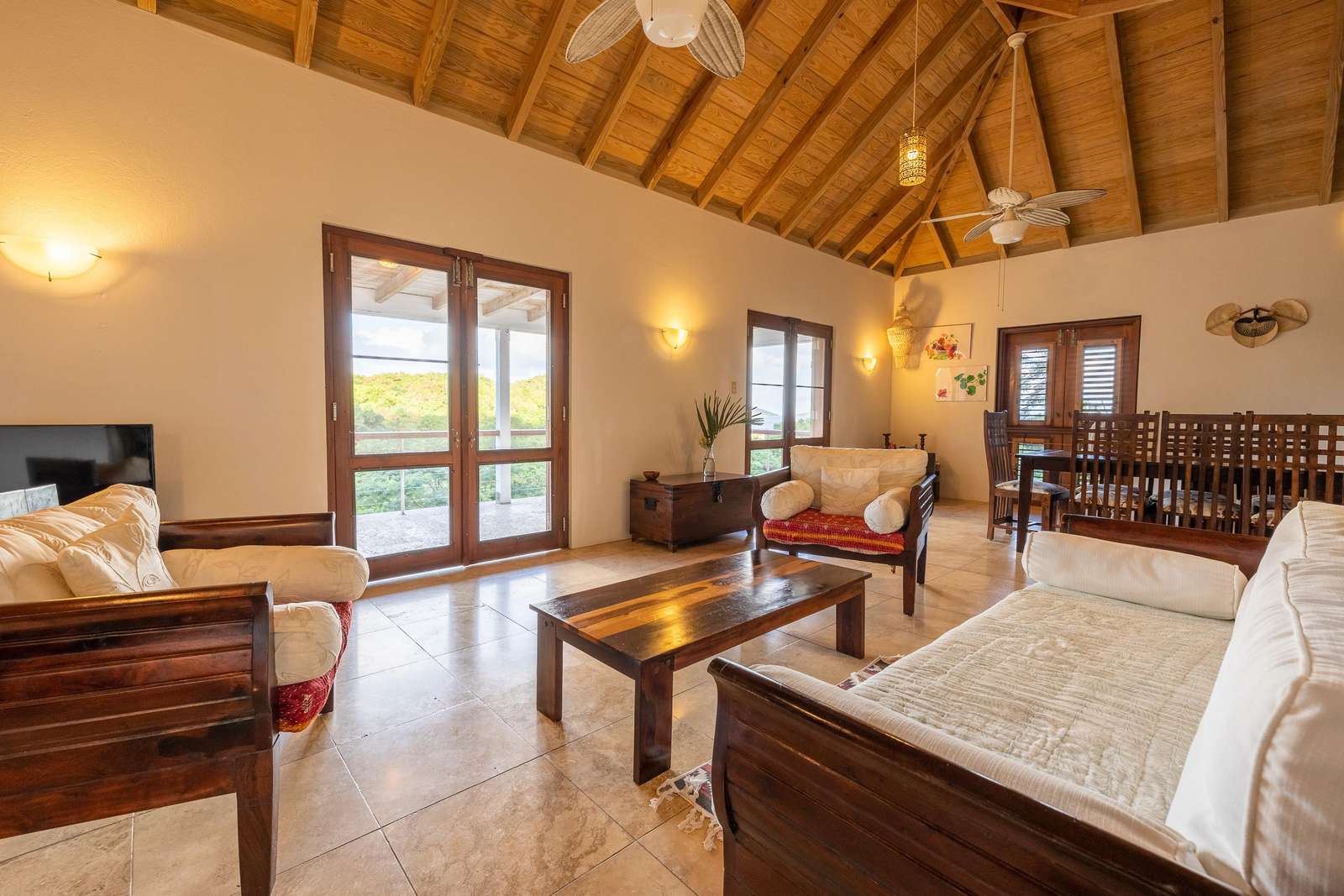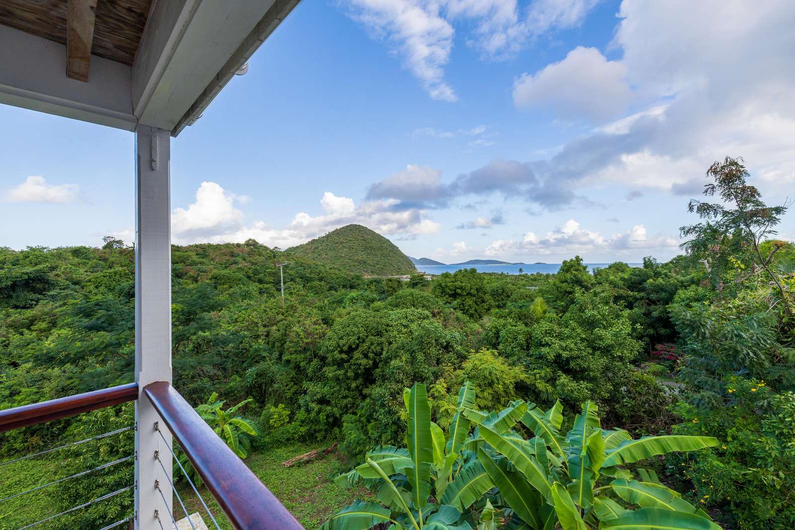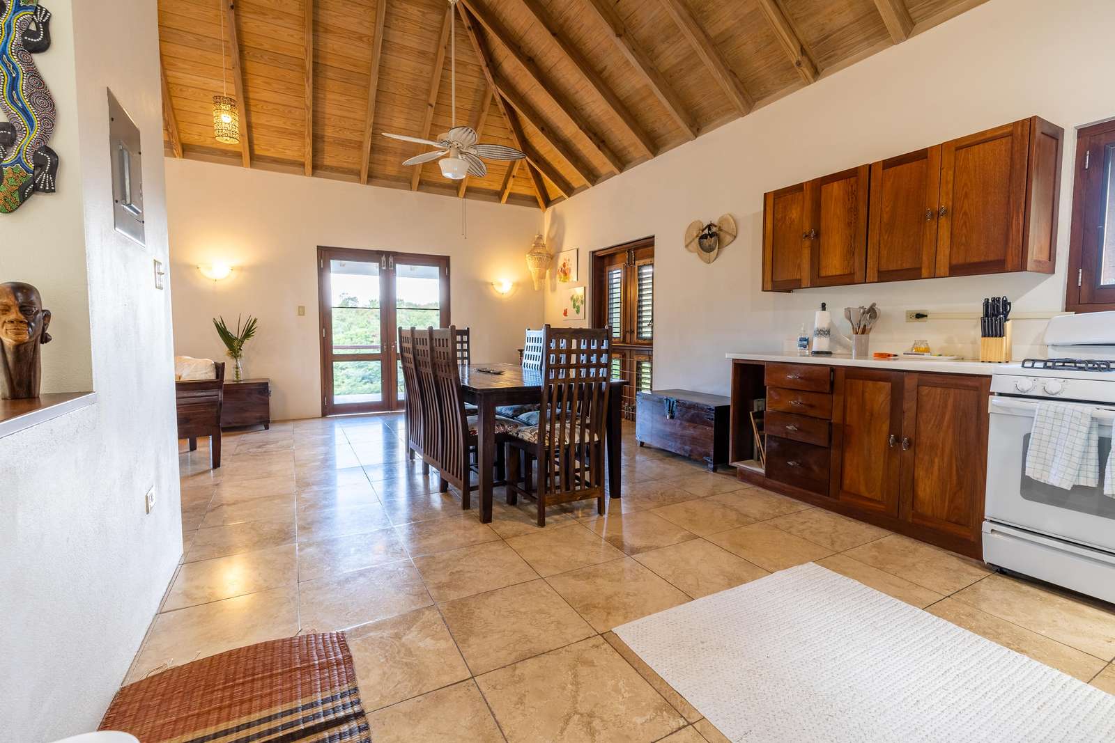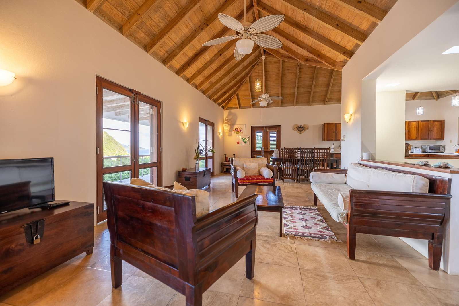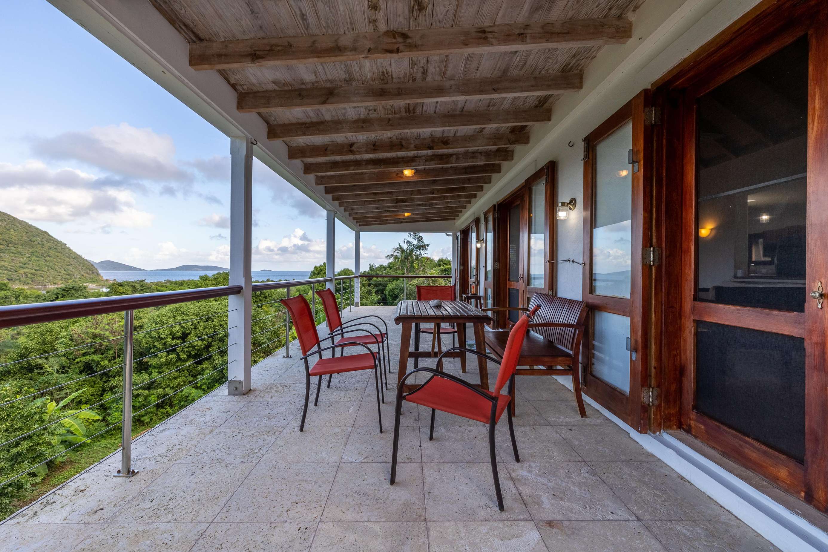 The sociable open-plan living room, kitchen, and dining area for 8 are upstairs. The gorgeous hand-made hardwood furniture is the perfect place to chill, enjoy the cooling breezes from the ceiling & floor fans and chat to those whipping up a meal in the well-equipped kitchen. of this opens out onto a large veranda with outdoor dining set overlooking the rolling green hills, glimmering ocean, and neighbouring islands of Jost Van Dyke and Sandy Spit.
