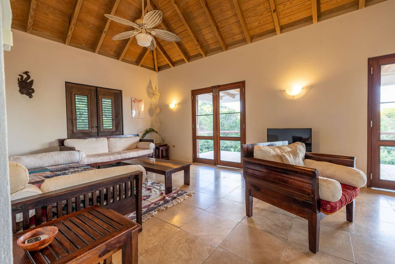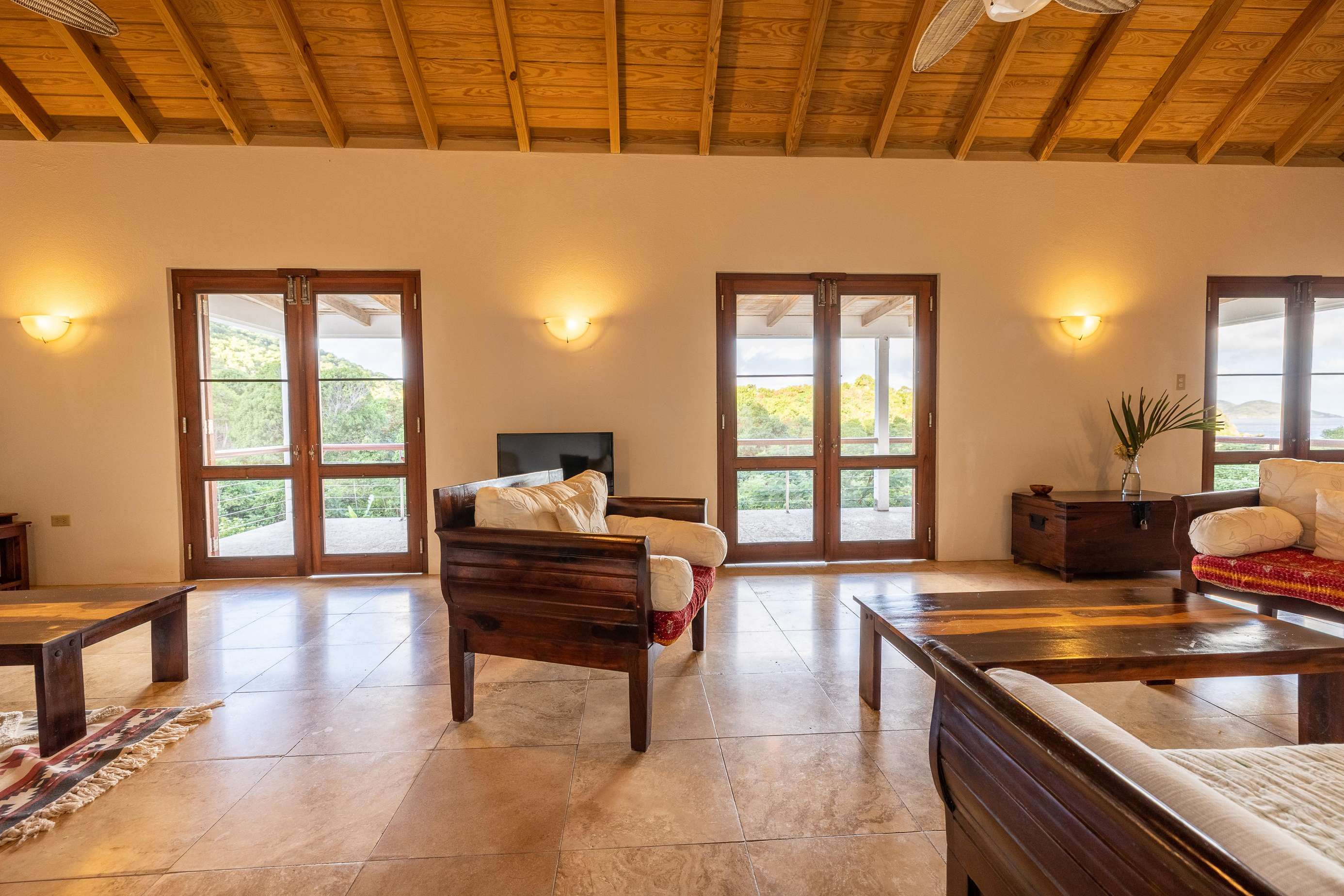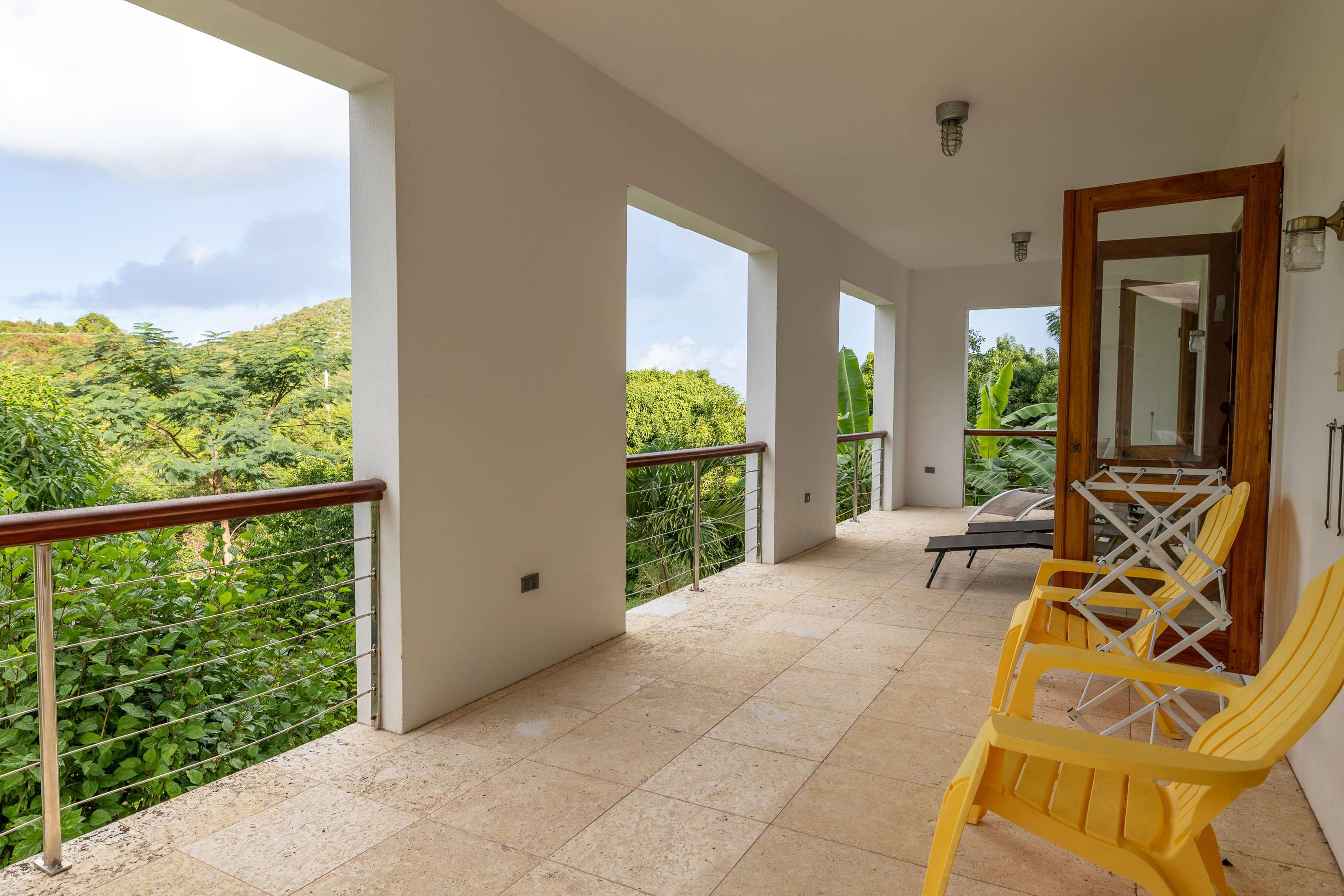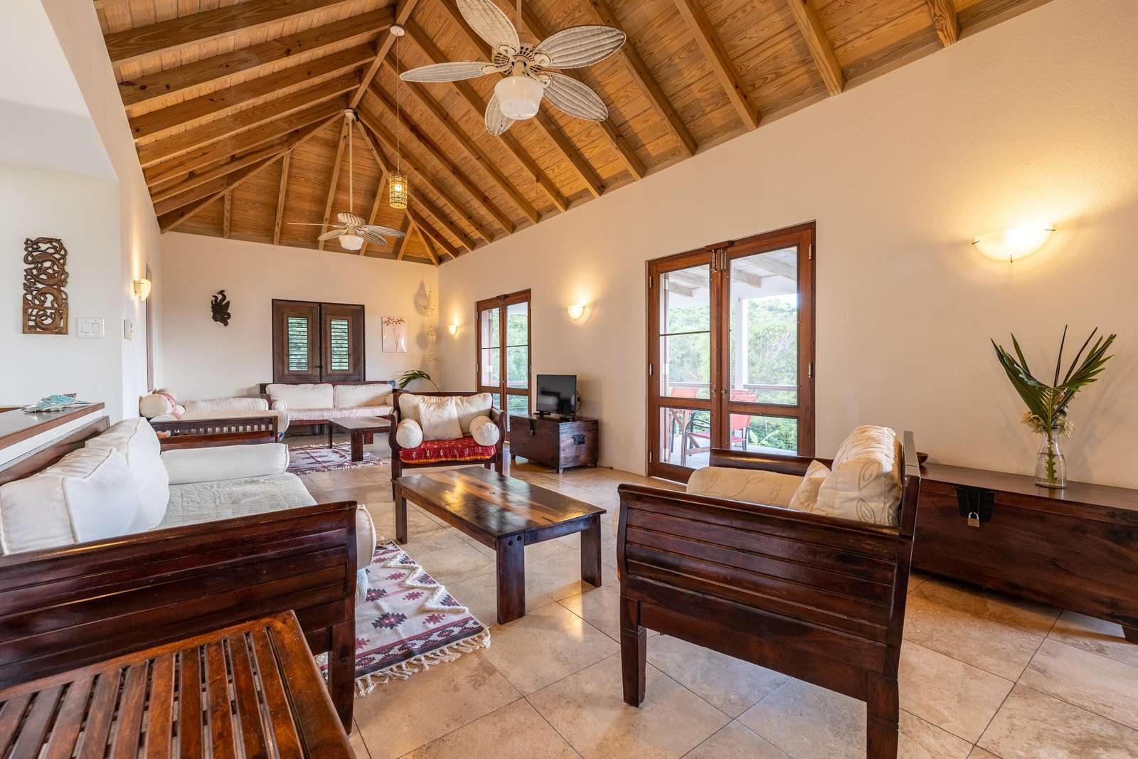 The sociable open-plan living room, kitchen, and dining area for 8 are upstairs. The gorgeous hand-made hardwood furniture is the perfect place to chill, enjoy the cooling breezes from the ceiling & floor fans and chat to those whipping up a meal in the well-equipped kitchen. of this opens out onto a large veranda with outdoor dining set overlooking the rolling green hills, glimmering ocean, and neighbouring islands of Jost Van Dyke and Sandy Spit.