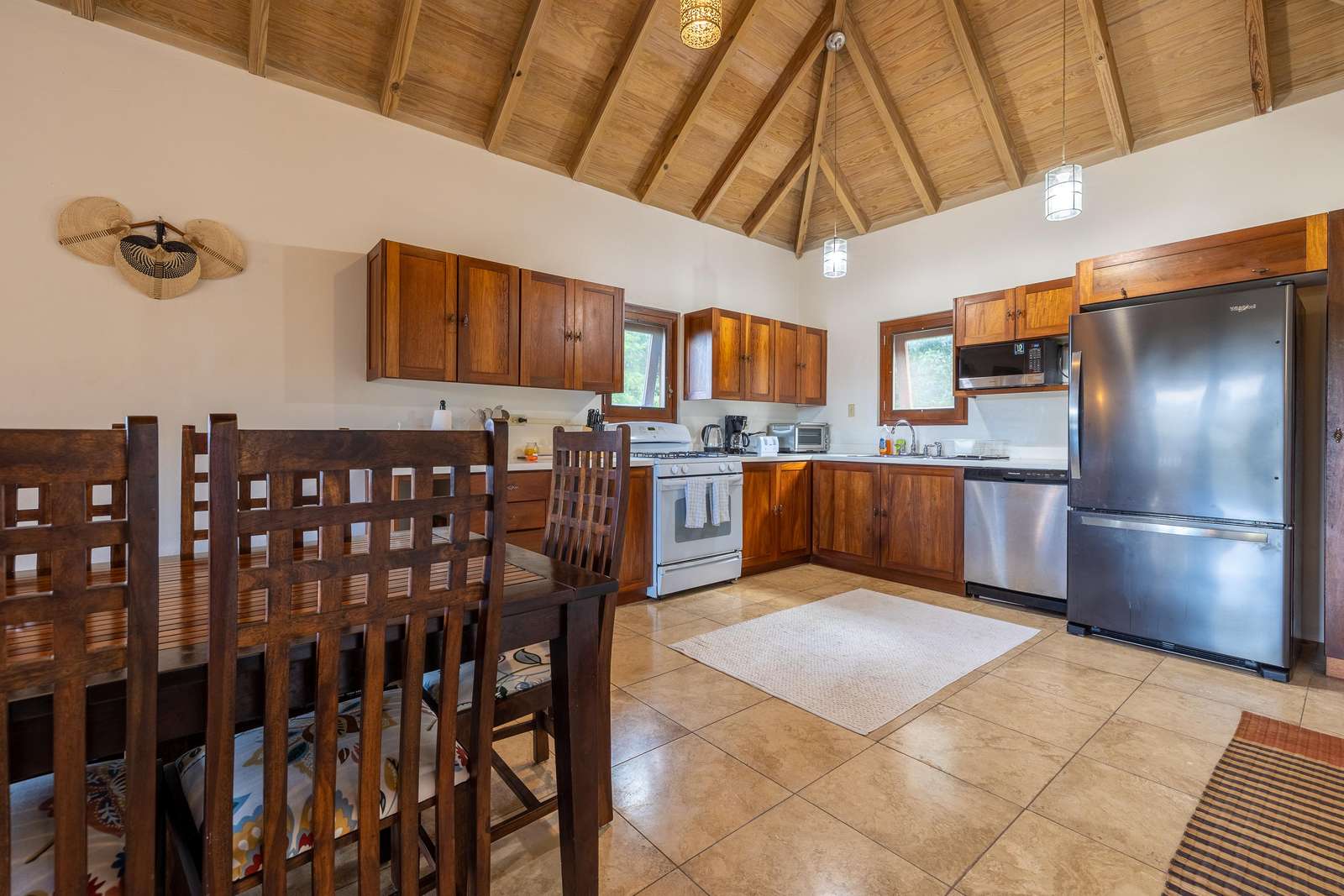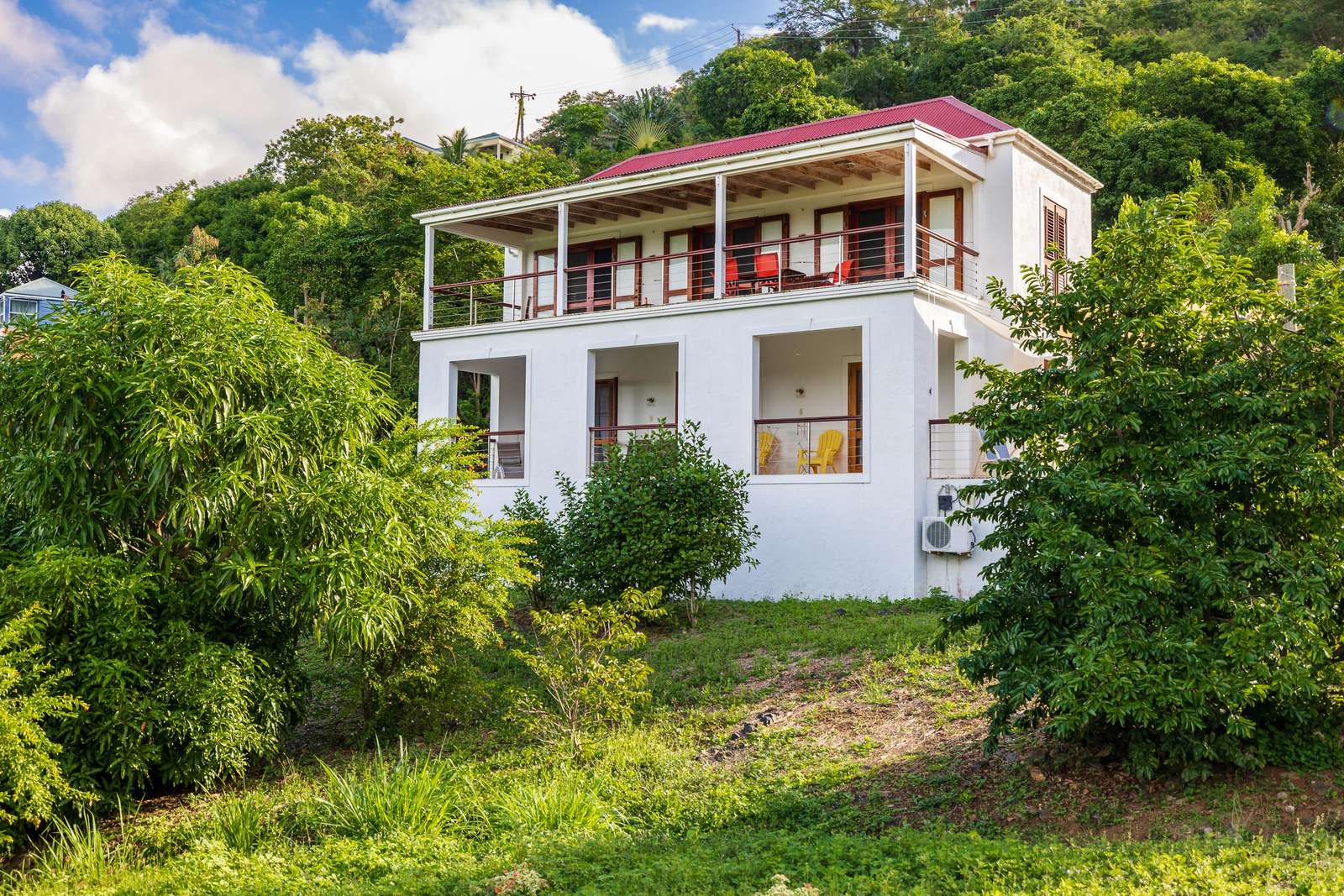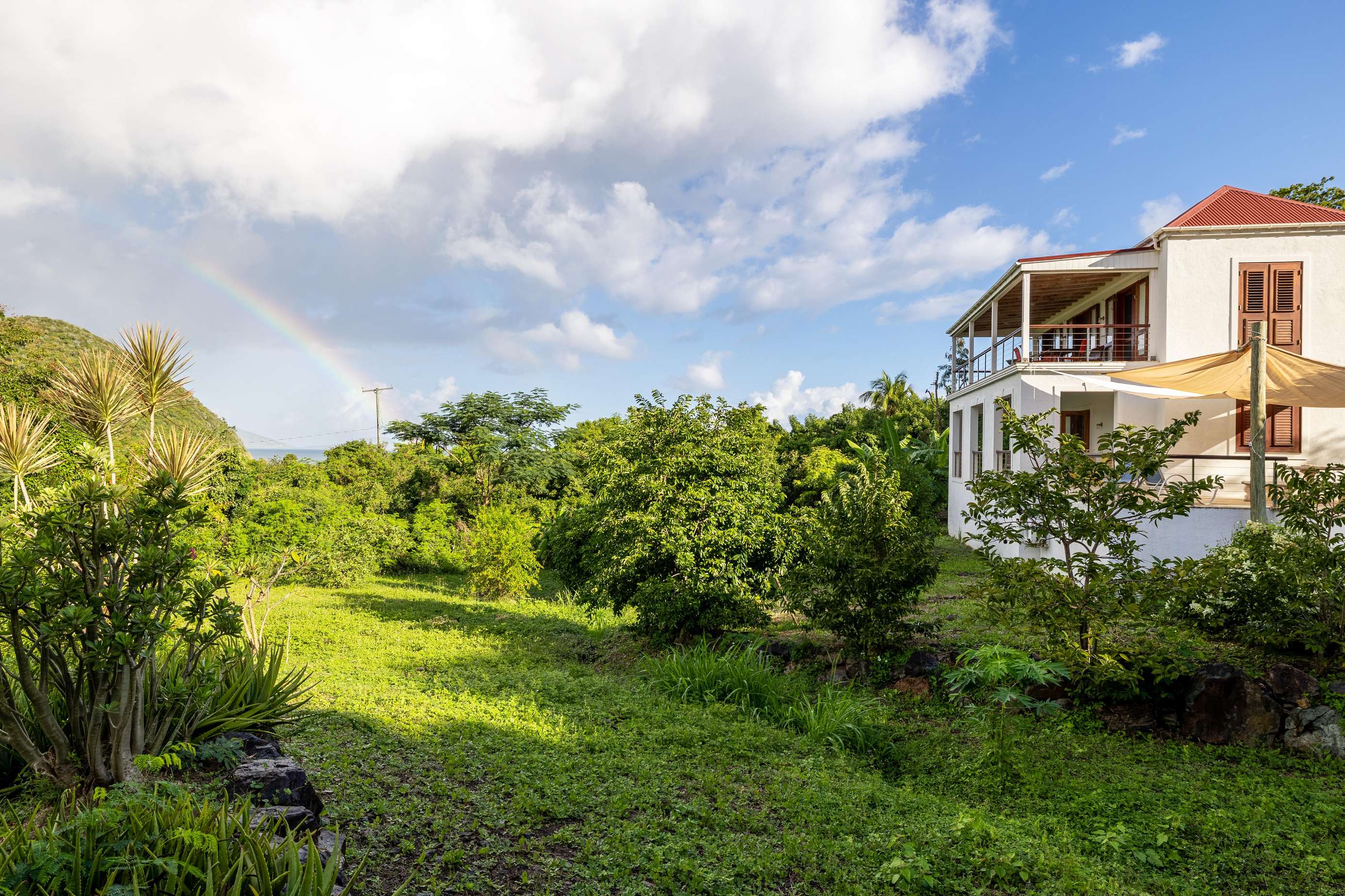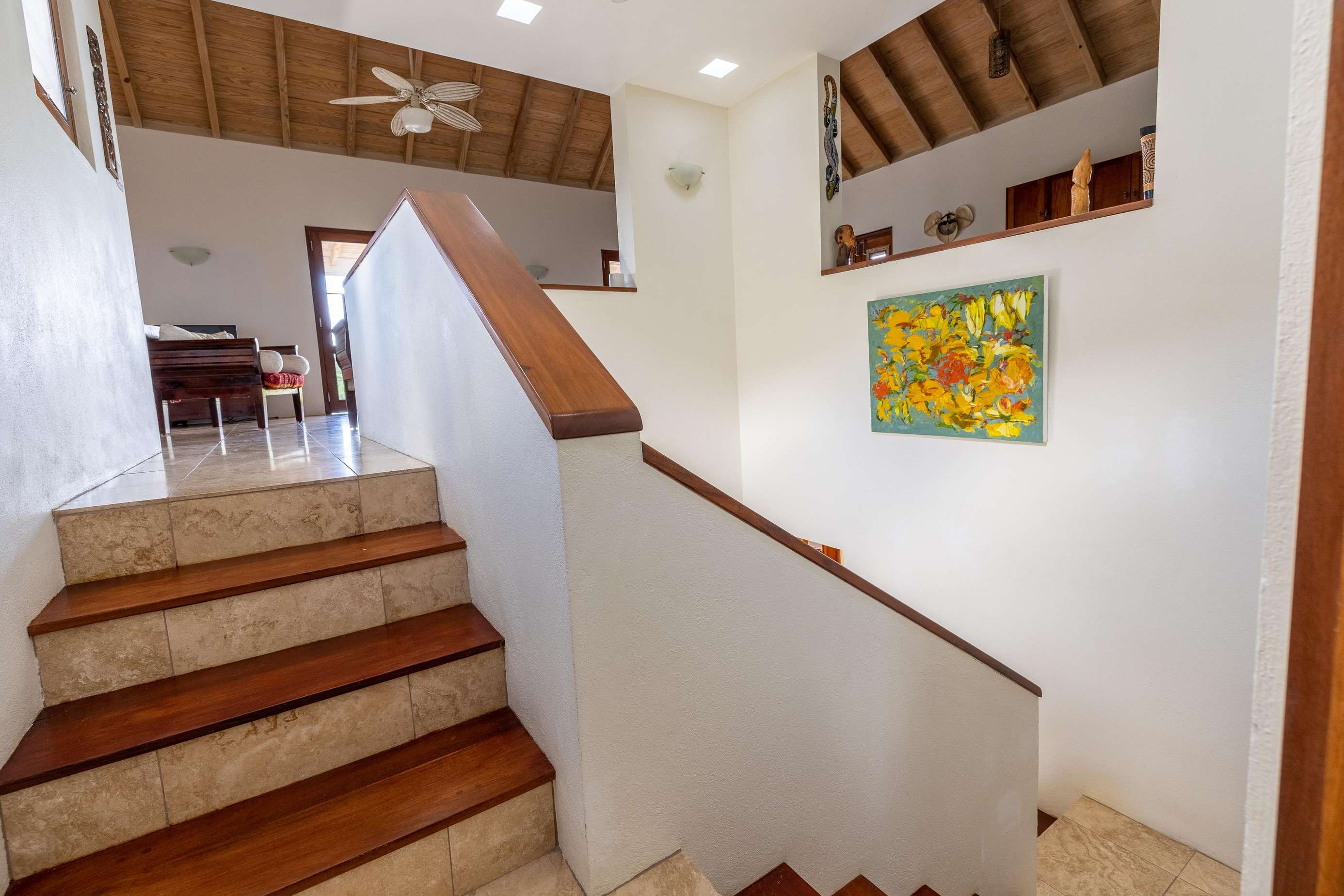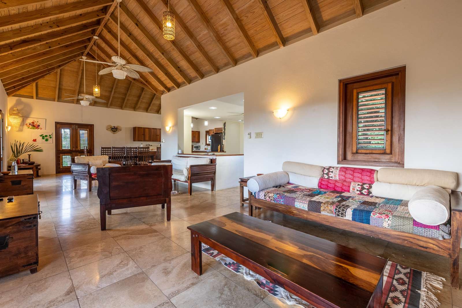 The sociable open-plan living room, kitchen, and dining area for 8 are upstairs. The gorgeous hand-made hardwood furniture is the perfect place to chill, enjoy the cooling breezes from the ceiling & floor fans and chat to those whipping up a meal in the well-equipped kitchen. of this opens out onto a large veranda with outdoor dining set overlooking the rolling green hills, glimmering ocean, and neighbouring islands of Jost Van Dyke and Sandy Spit.
