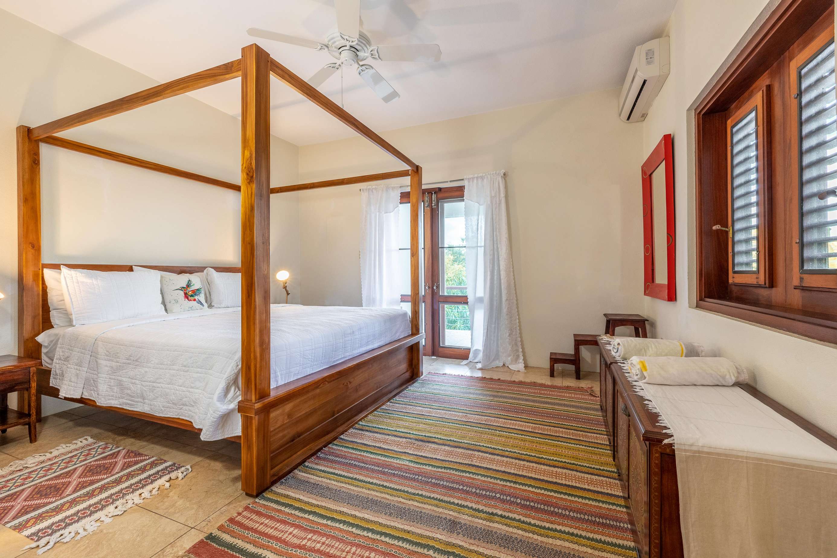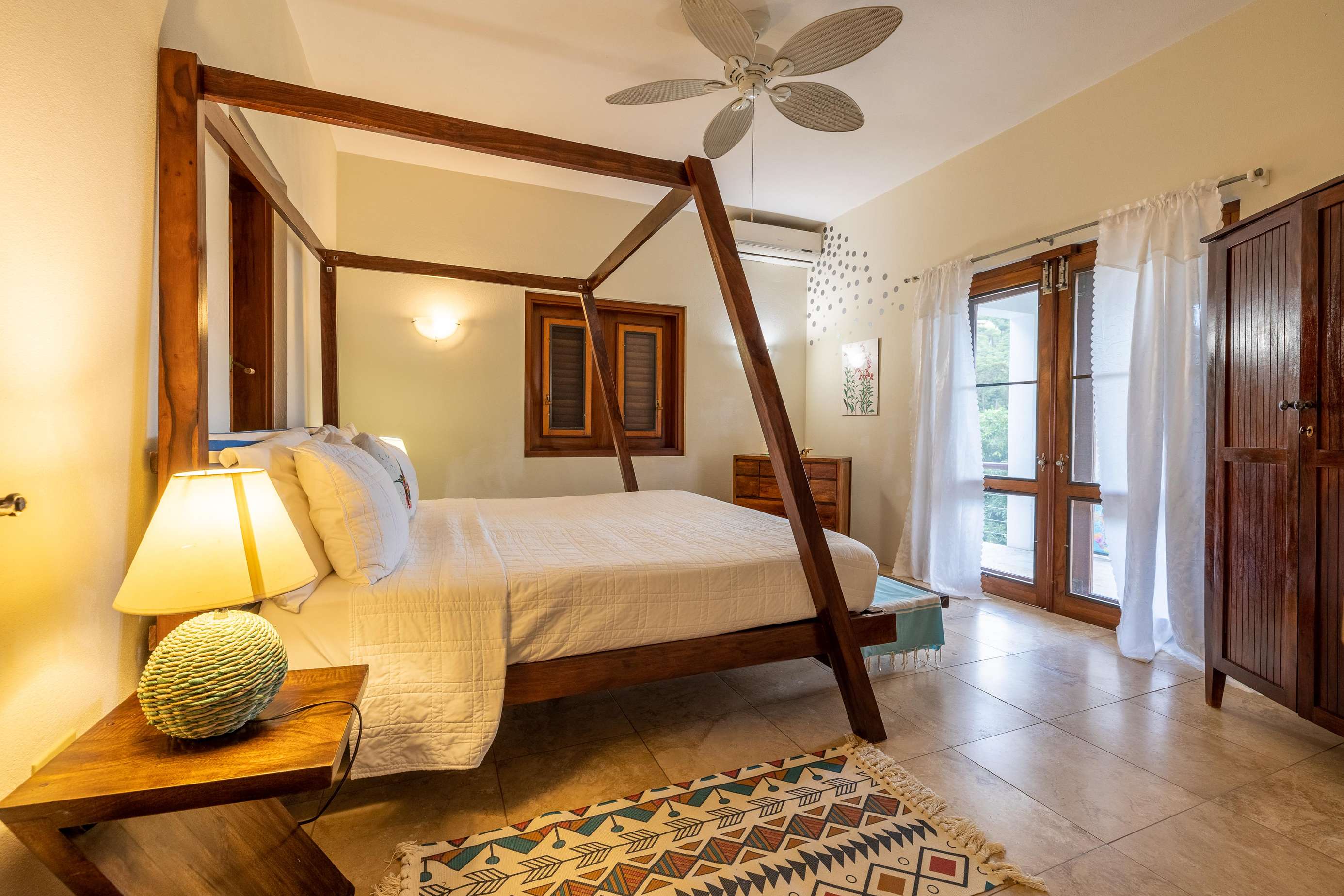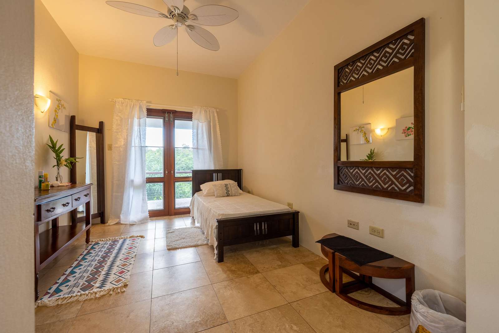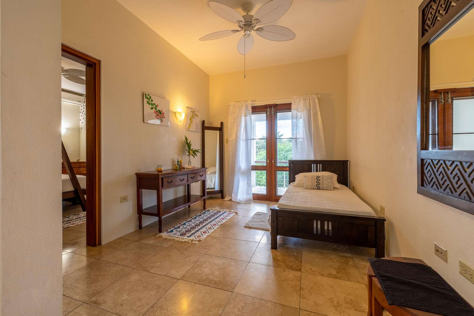 The airy bedrooms are on the ground floor. The primary has a king-sized bed and the second bedroom a queen. The third bed in the middle room is a single for an additional guest. All of the bedrooms open out to the bottom floor veranda and its soundscape of birds and treefrogs.