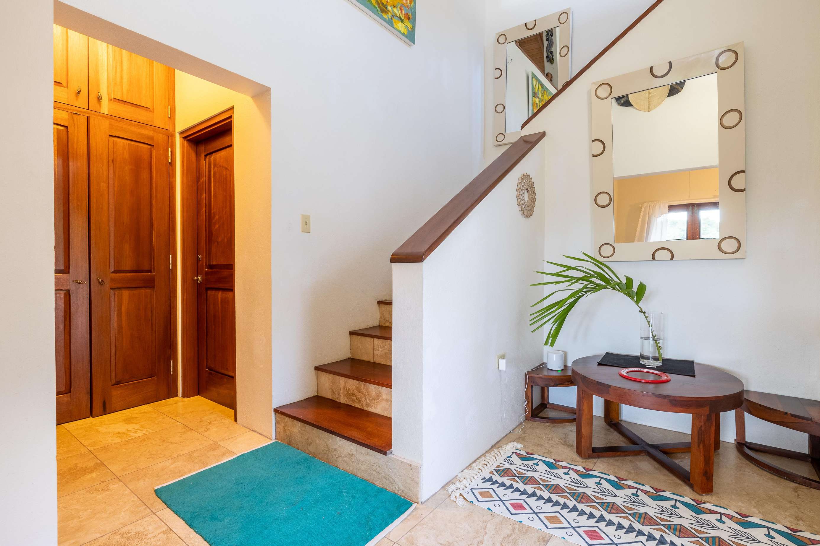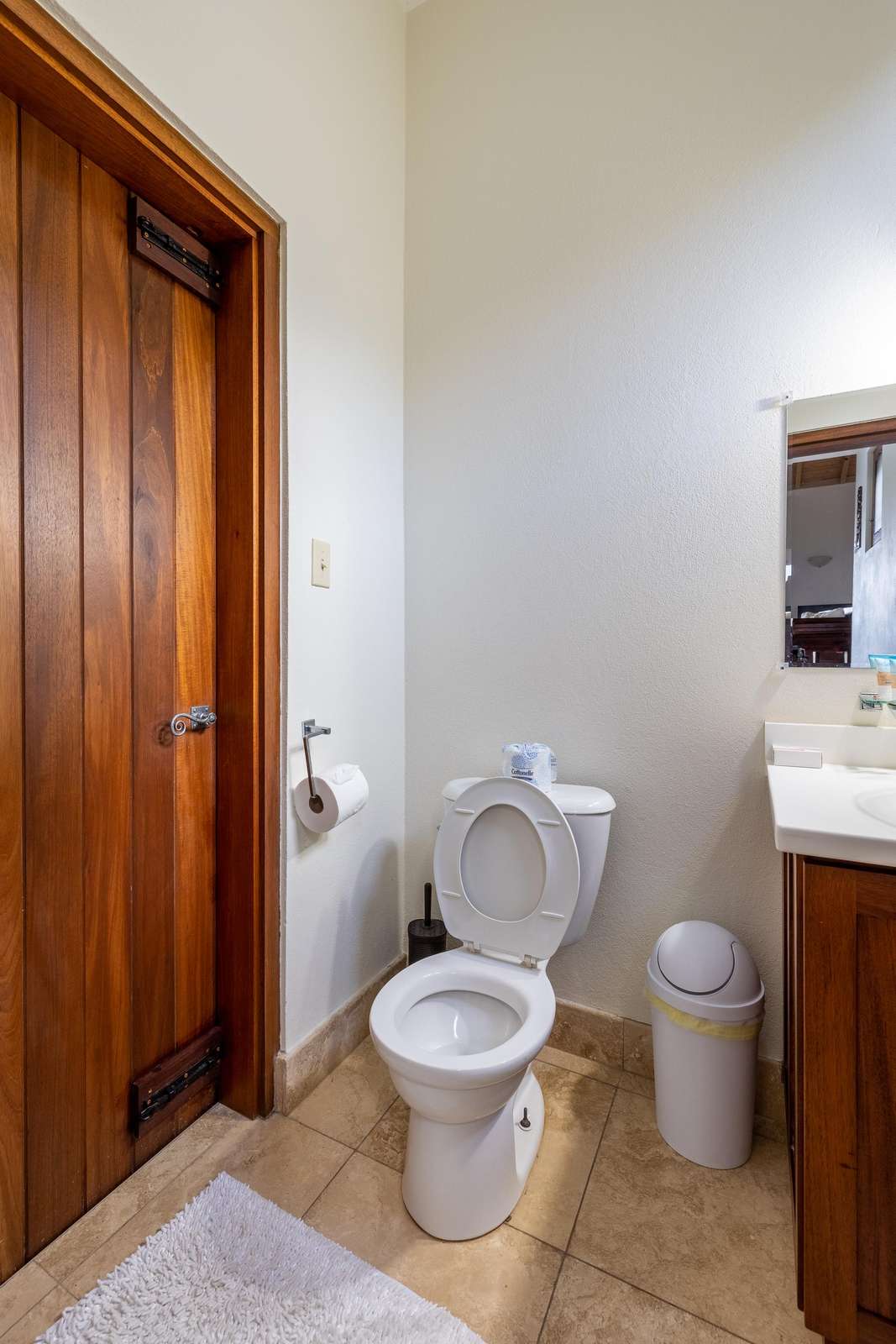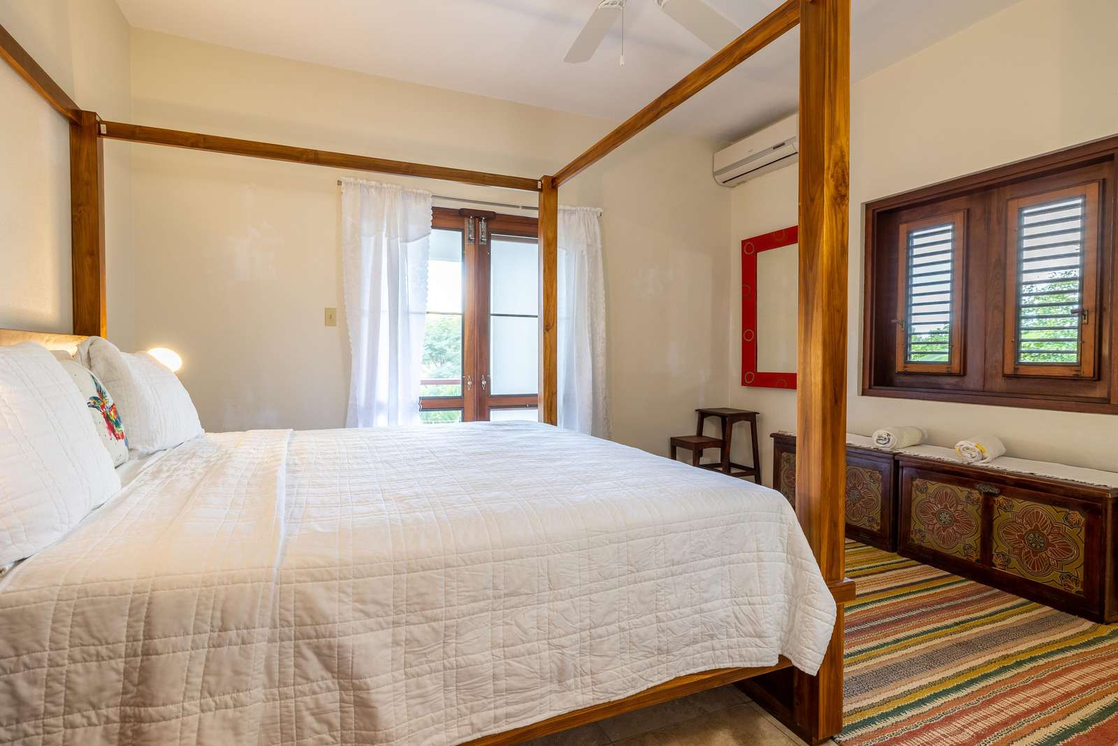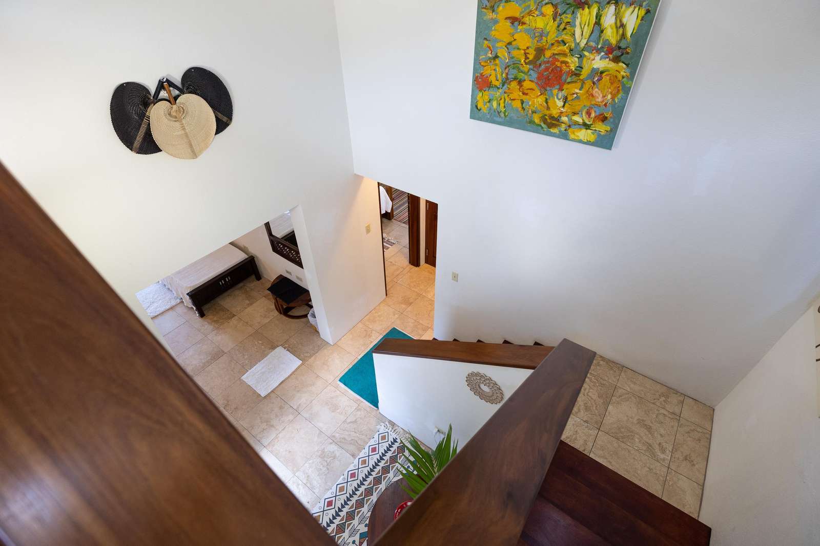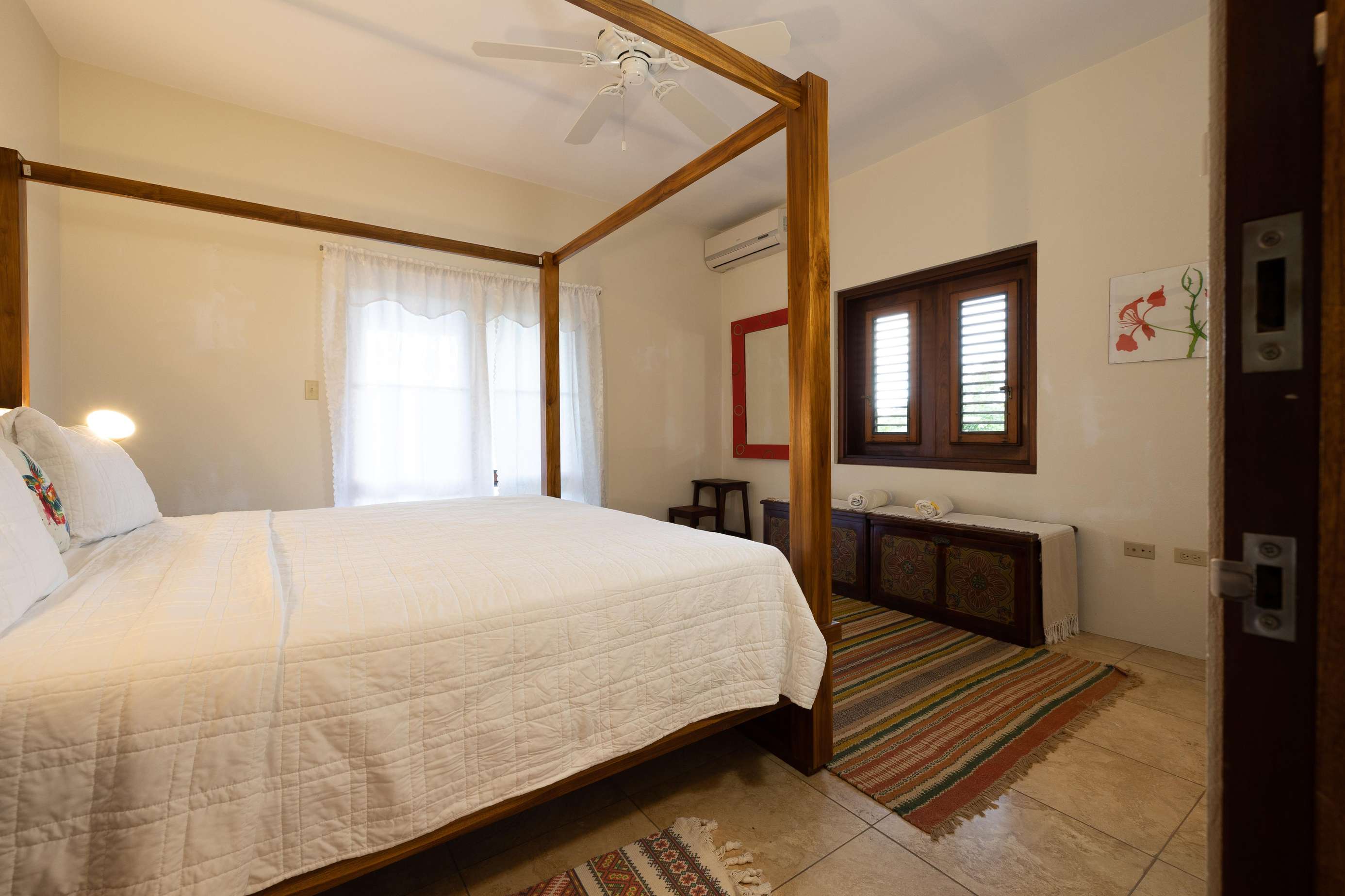 The airy bedrooms are on the ground floor. The primary has a king-sized bed and the second bedroom a queen. The third bed in the middle room is a single for an additional guest. All of the bedrooms open out to the bottom floor veranda and its soundscape of birds and treefrogs.