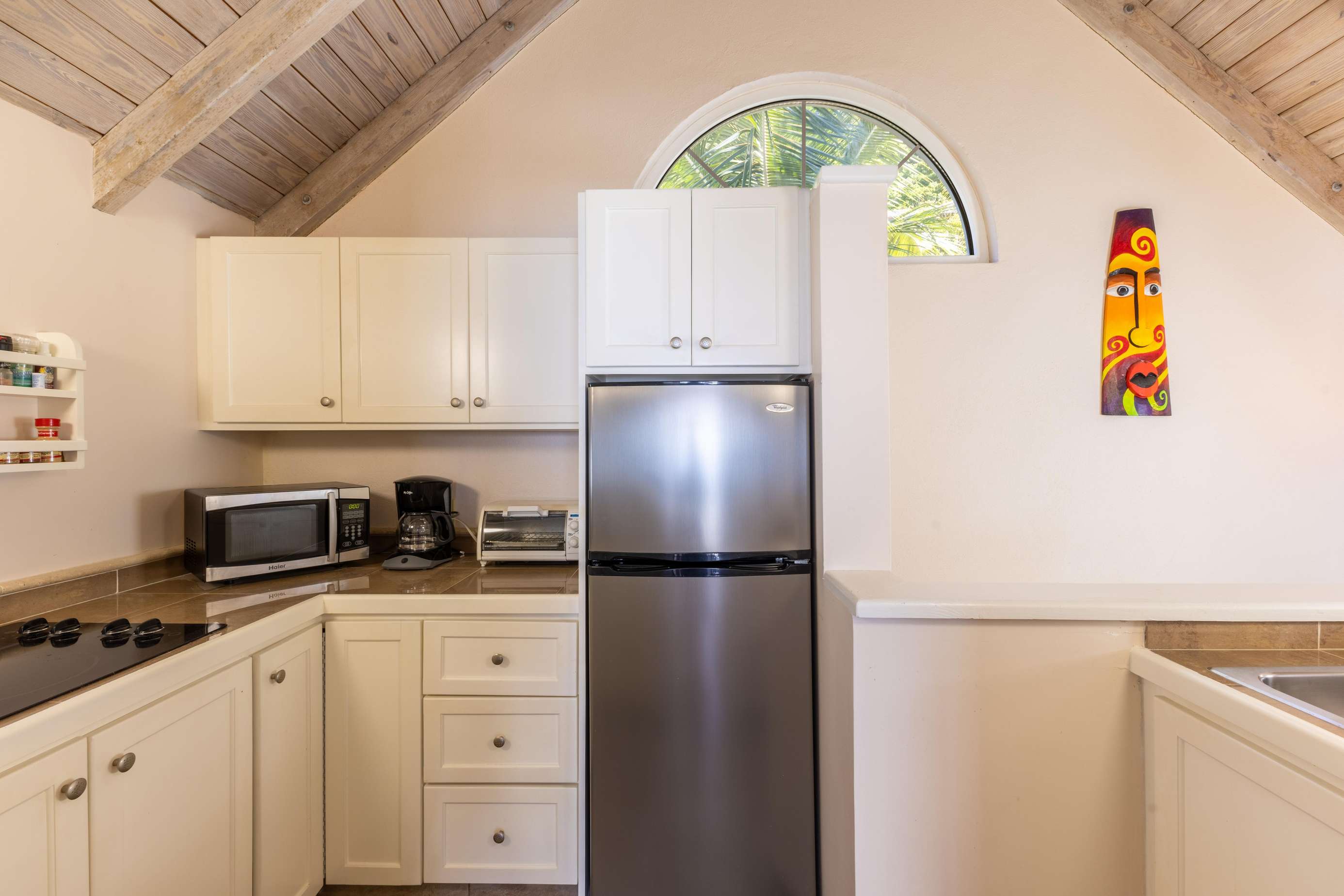 The Penthouse suite has stunning ocean views, comfortable Caribbean furnishings and the calming sounds of the waves below. Airy and filled with sunlight, it has an open studio-style layout with a high vaulted ceiling. Equipped with a king-size bed, built in desk, AC, SmartTV with local FLOW cable, you’ll have all your home comforts but with a much better view! The kitchenette is perfectly equipped for preparing simple meals with cooktop, fridge/freezer, coffee-maker, toaster oven, microwave, blender & toaster. The 3 piece bathroom has a spacious walk-in shower. Of course this area provides dressing drawers and closet space too.