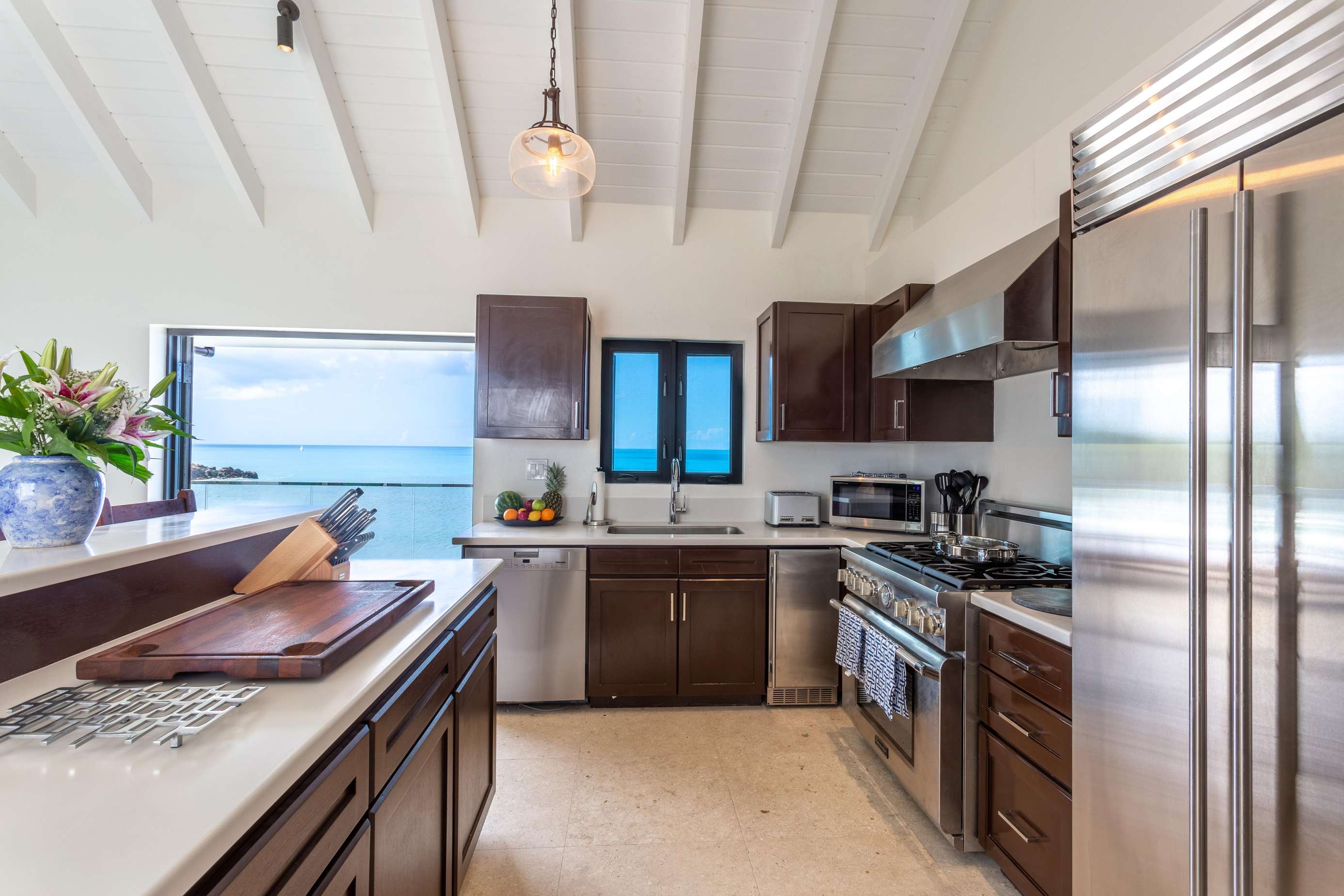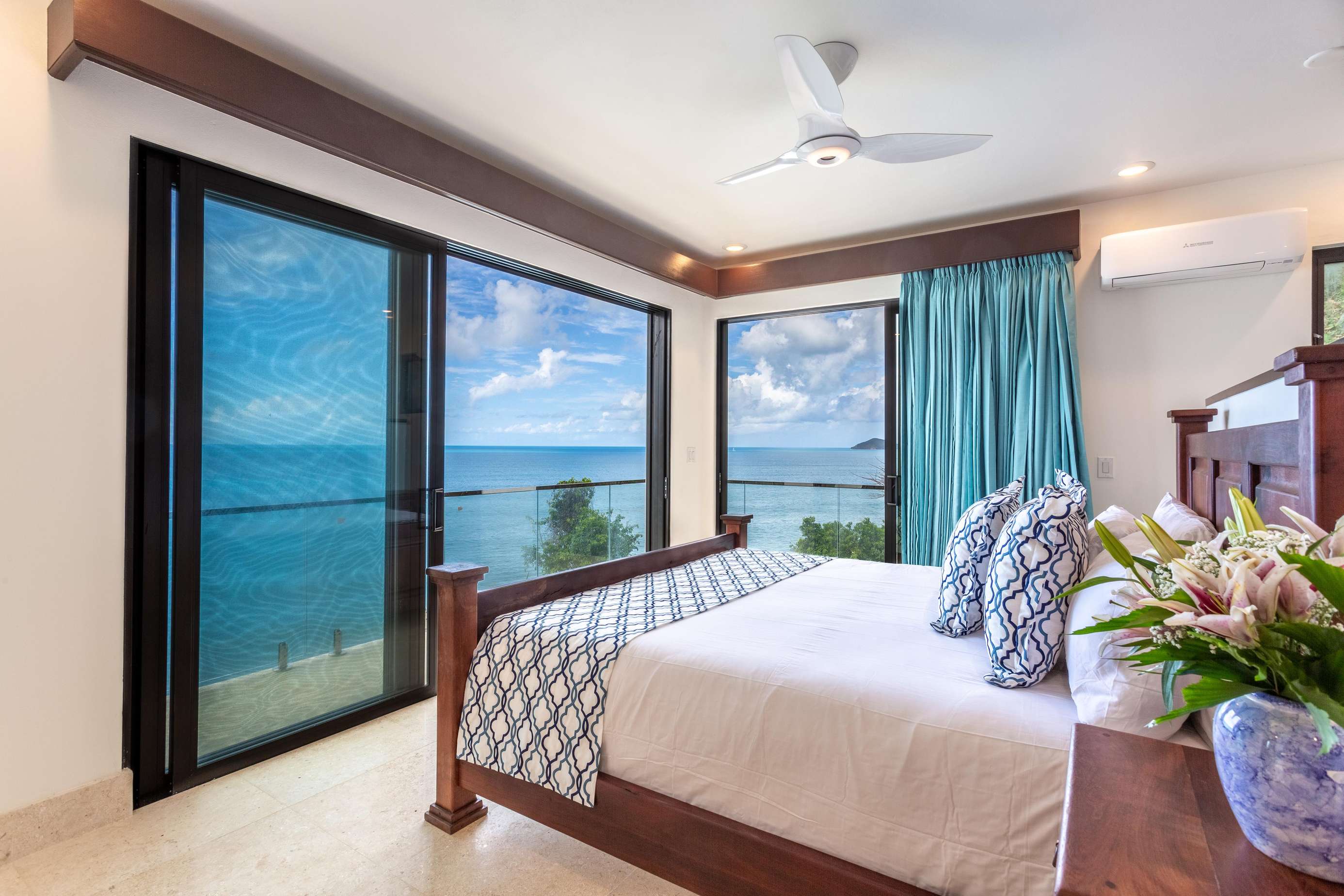 The calming pale blue and white hues of the interiors have been carefully selected, perfectly complementing the sweeping ocean views that can be seen from every room.