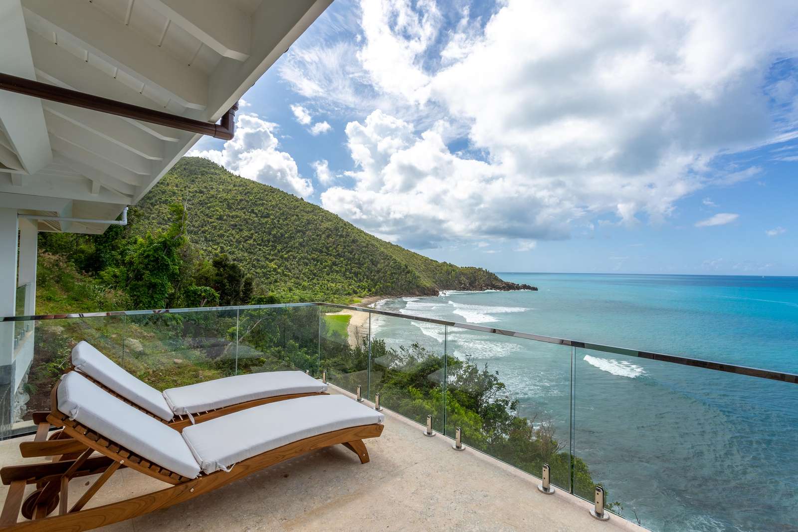 The outdoor spaces of Mini Cooper are just as unique as the indoors. The infinity plunge pool separates the two pavilions of the villa, the perfect place for cooling off. There’s an amazing deck with ample comfy seating which juts out of the mountainside. This is a spectacular viewpoint for BVI’s famous fiery sunsets. Huge glass doors in the kitchen/living room open out to a balcony with those views and loungers to catch some rays on.